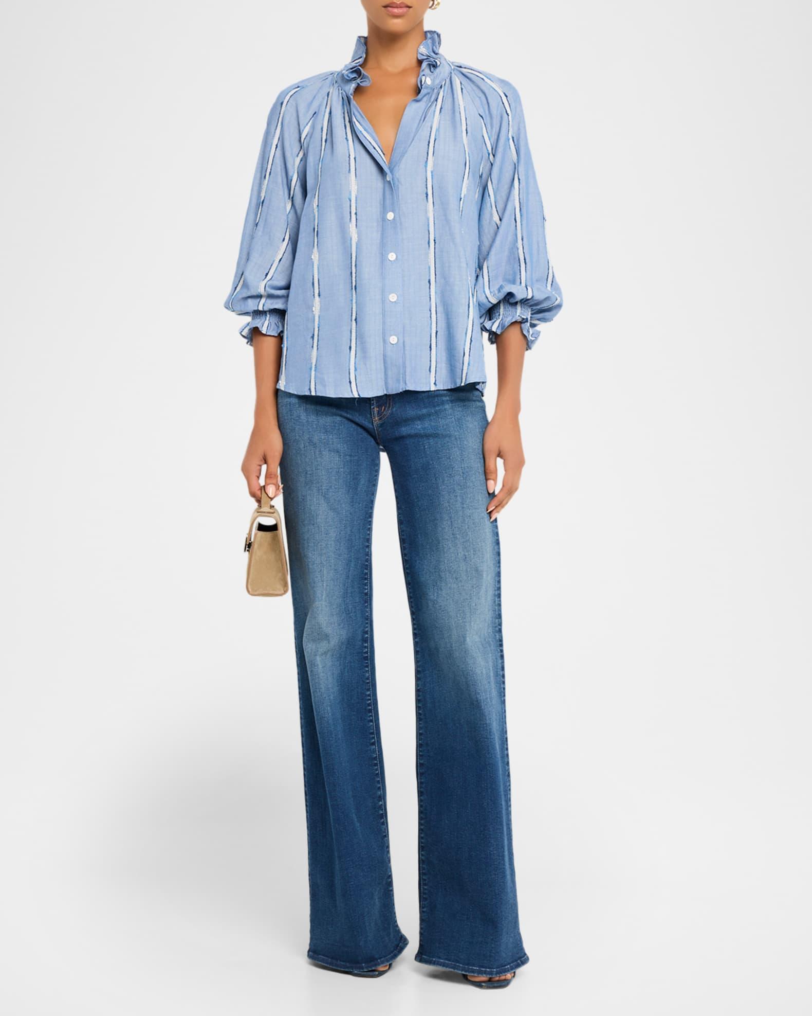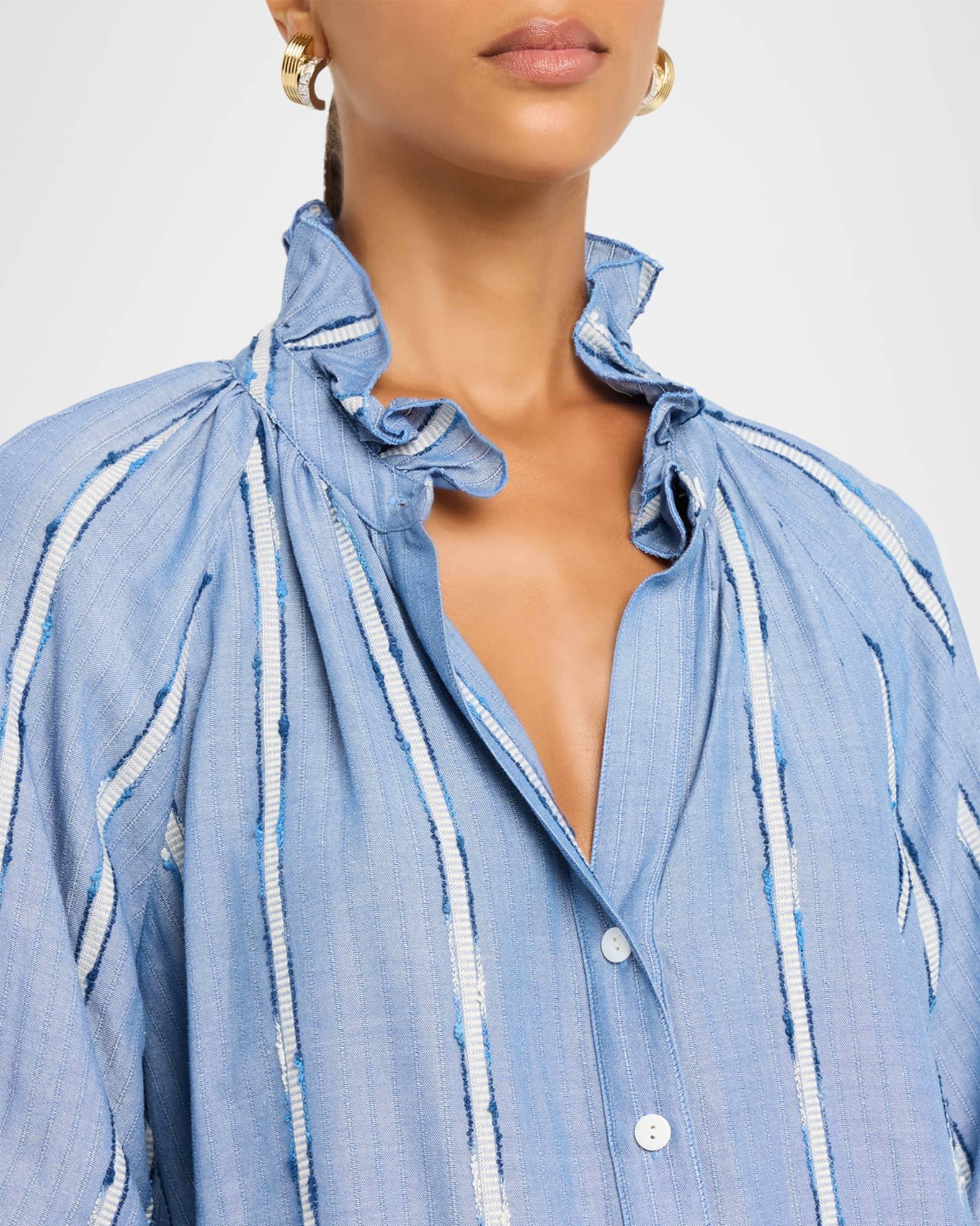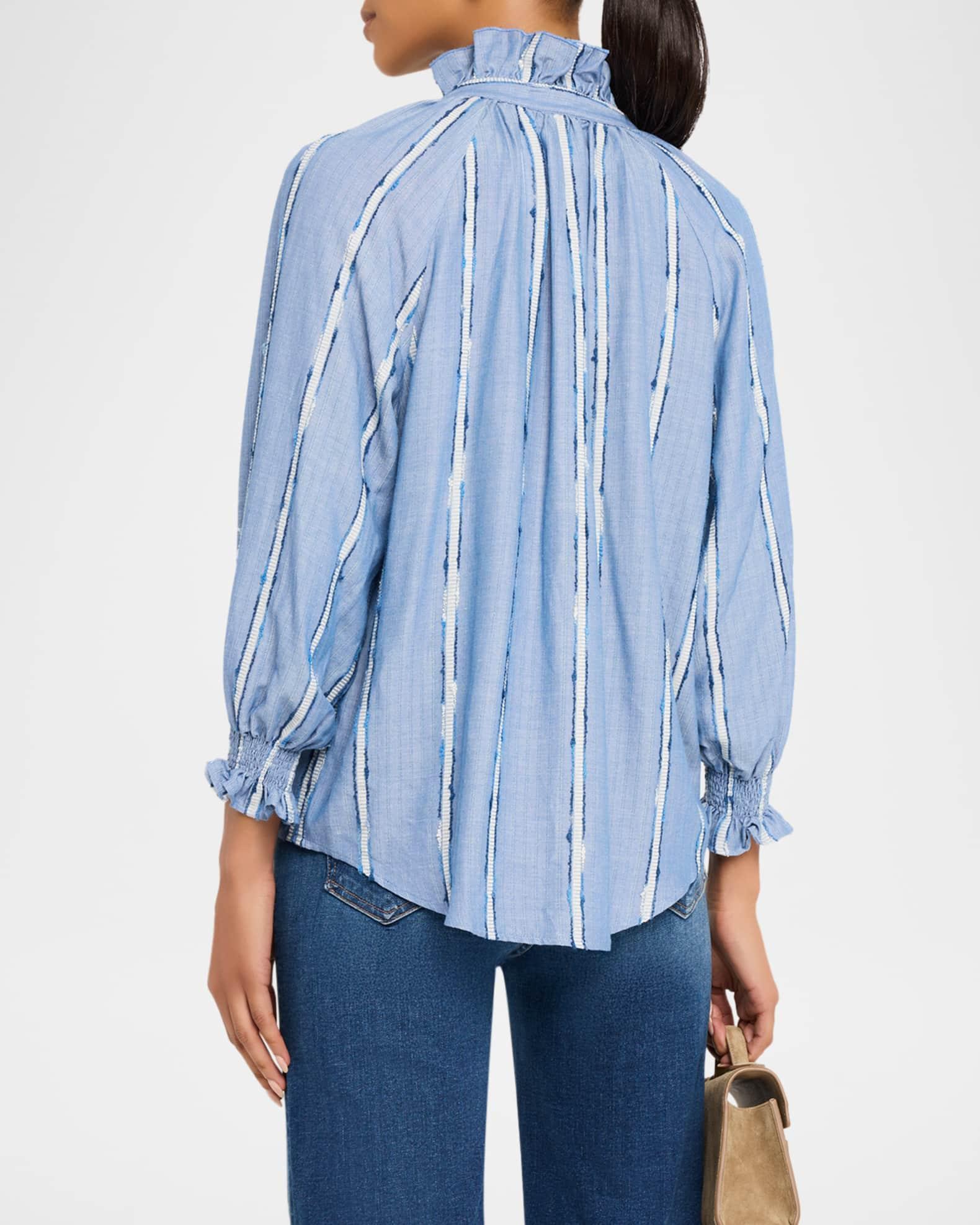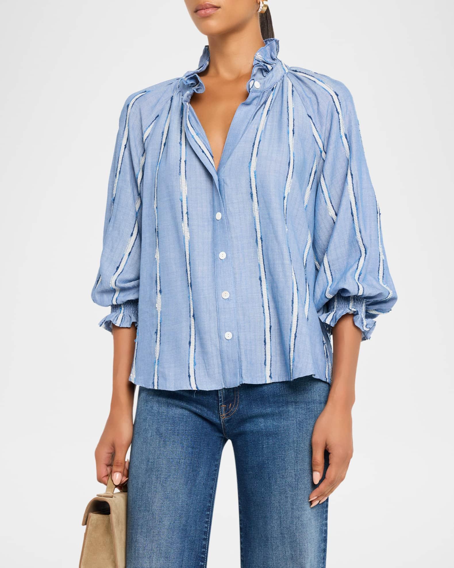 This iconic "Fiona" Finley shirt is crafted in cotton-blend dobby fabric, the textured stripes adding visual appeal to an otherwise understated design V neckline with band collar Button front closure 3/4 raglan blouson sleeves; 20"L Smocked ruffle cuffs Ruched back Rounded hem Relaxed fit Cotton/viscose/nylon/polyamide Unlined Machine wash cold Made in the USA from imported materials