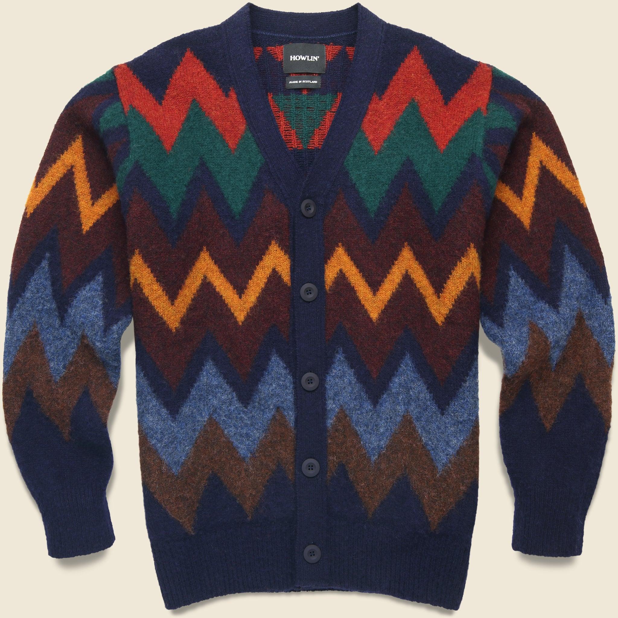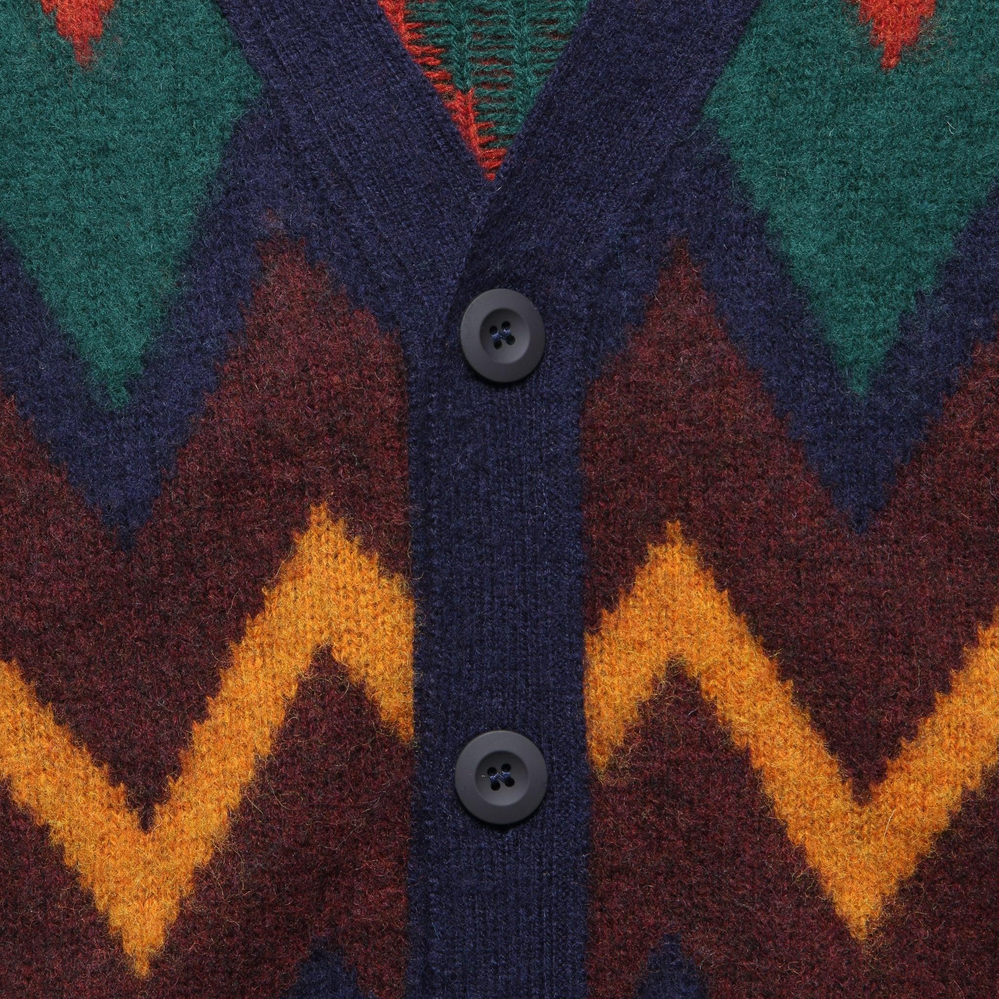 The Fire In The Mind Cardigan from Antwerp-based knitwear brand Howlin’ is completely knitted and hand-finished by traditionally skilled craftsmen from 100% local Scottish wool. Knit with a colorful geometric zig-zag pattern and detailed with a simple 5-button placket, and shallow ribbing at the hem and cuffs for a comfortable finish. Made out of 100% local Scottish wool Colorful geometric zig-zag pattern Soft brushed exterior Fully knitted and hand-finished in Scotland Simple 5-button placket Ribbed hem and cuffs Relaxed fit that runs true to size We recommend taking your normal size Made in Scotland Materials: 100% wool The following measurements are for size Medium: Chest 47” | Shoulders: 19” | Sleeve 32” | Length: 27”
