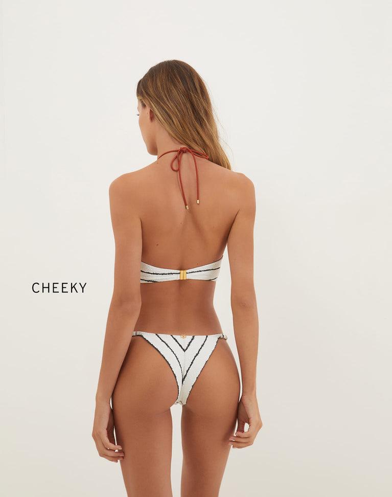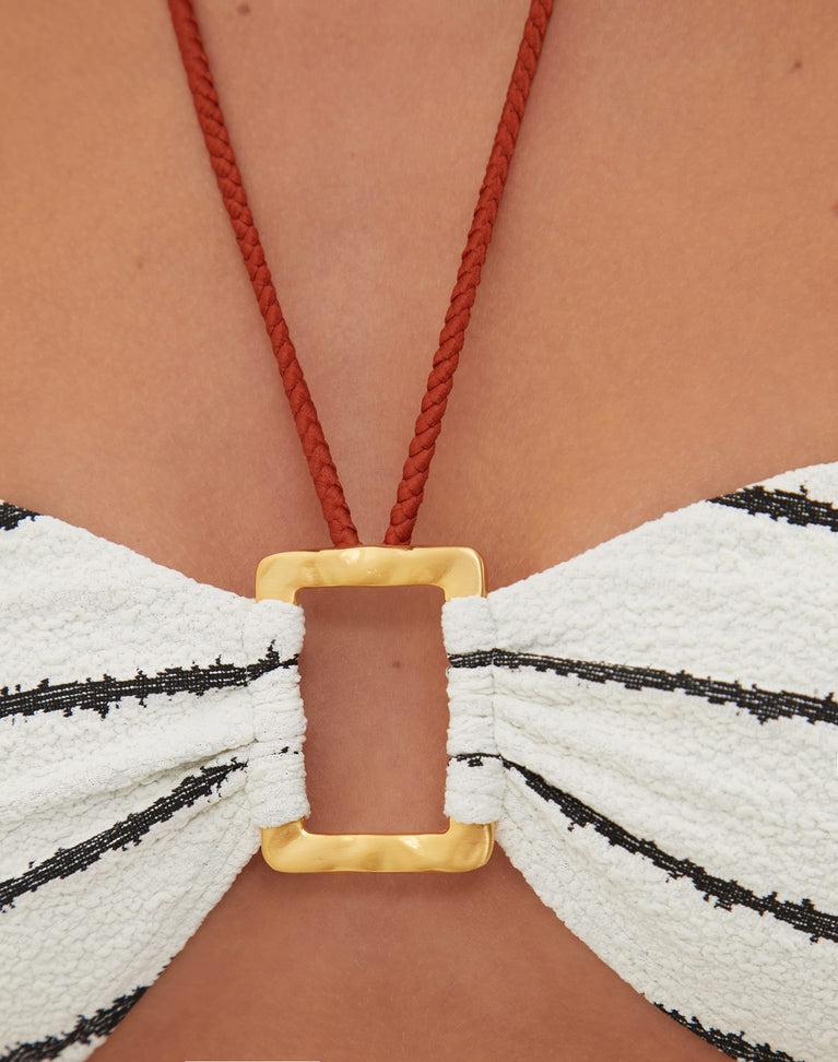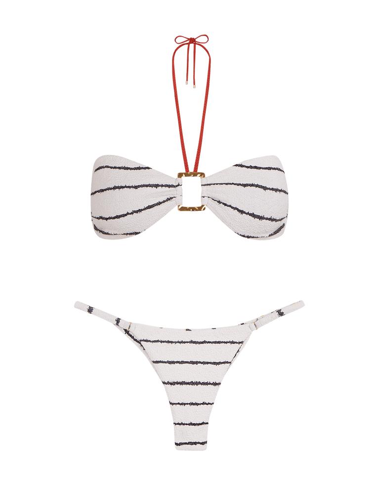 The ViX Firenze Debbie Bandeau Top is a stunning bikini top decorated with a gold-plated rectangular detail at the bust and a striped print throughout, finished off with tie closures at the back. Style the Debbie Bandeau Top with a matching bottom and cover up for a vacation-ready look. Features: Fully lined Removable