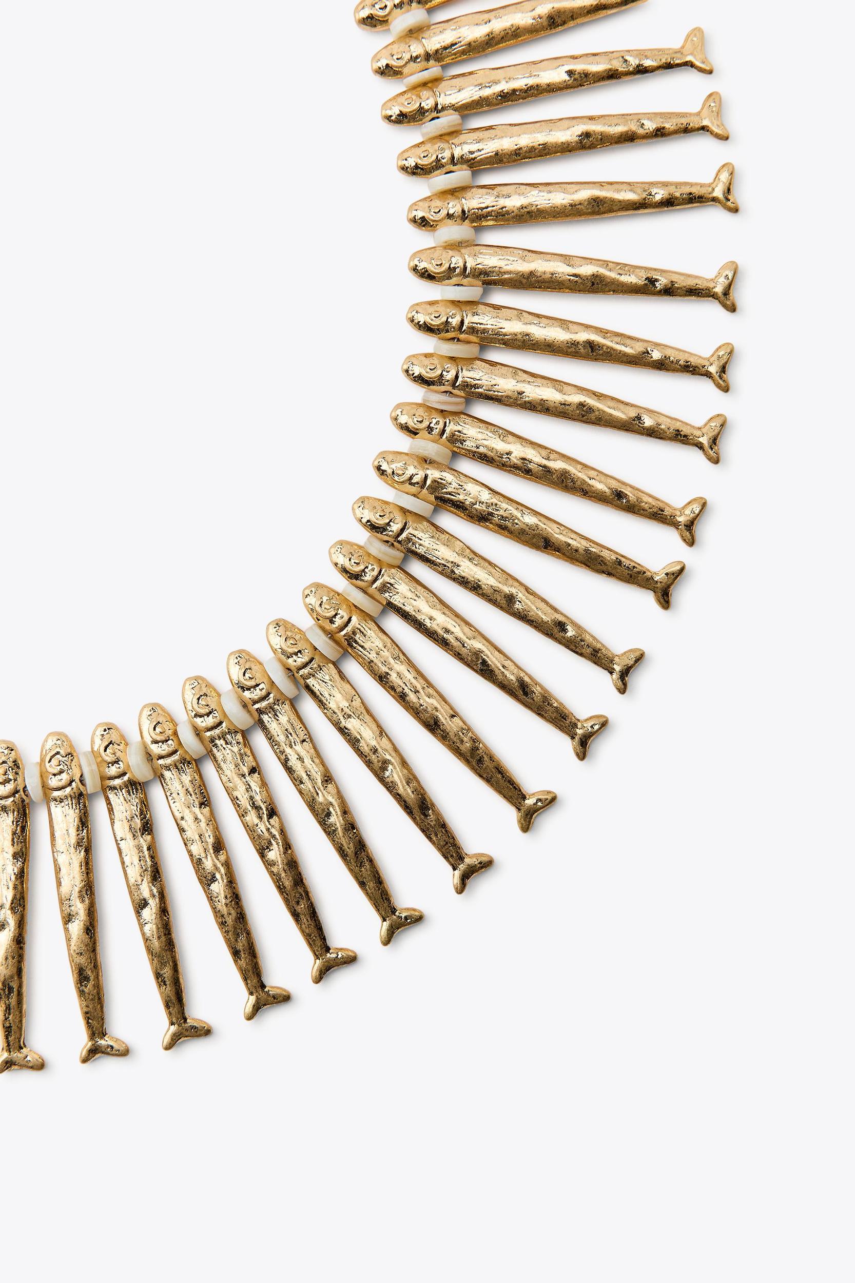 Bib-style necklace with multiple metal fish-shaped pieces. Lobster clasp closure.