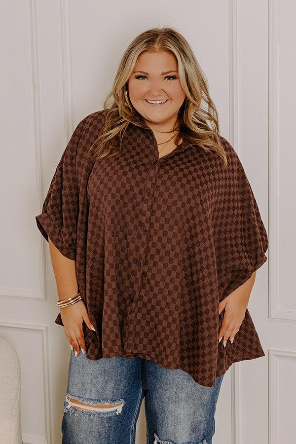- Bring on the trendy looks with this fabulous top! With its chic oversized fit, this piece is perfect for any fashion-forward wardrobe. - Unlined material with a brown hued checker pattern - A collared neckline - A button-up front - Short sleeves with drop shoulders - An oversized silhouette that ends in a curved hemline