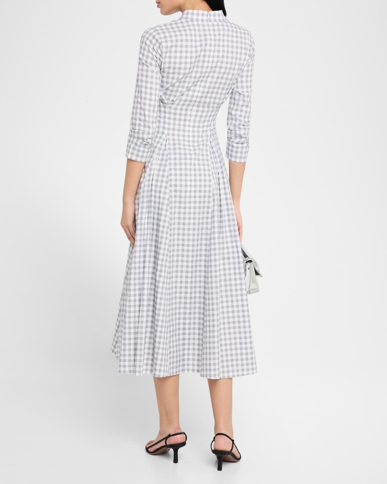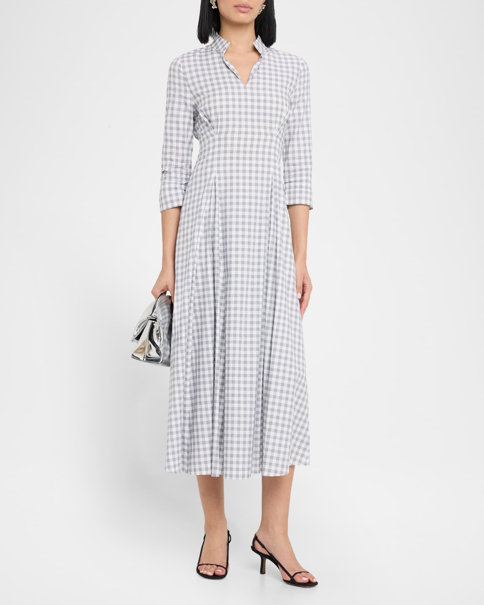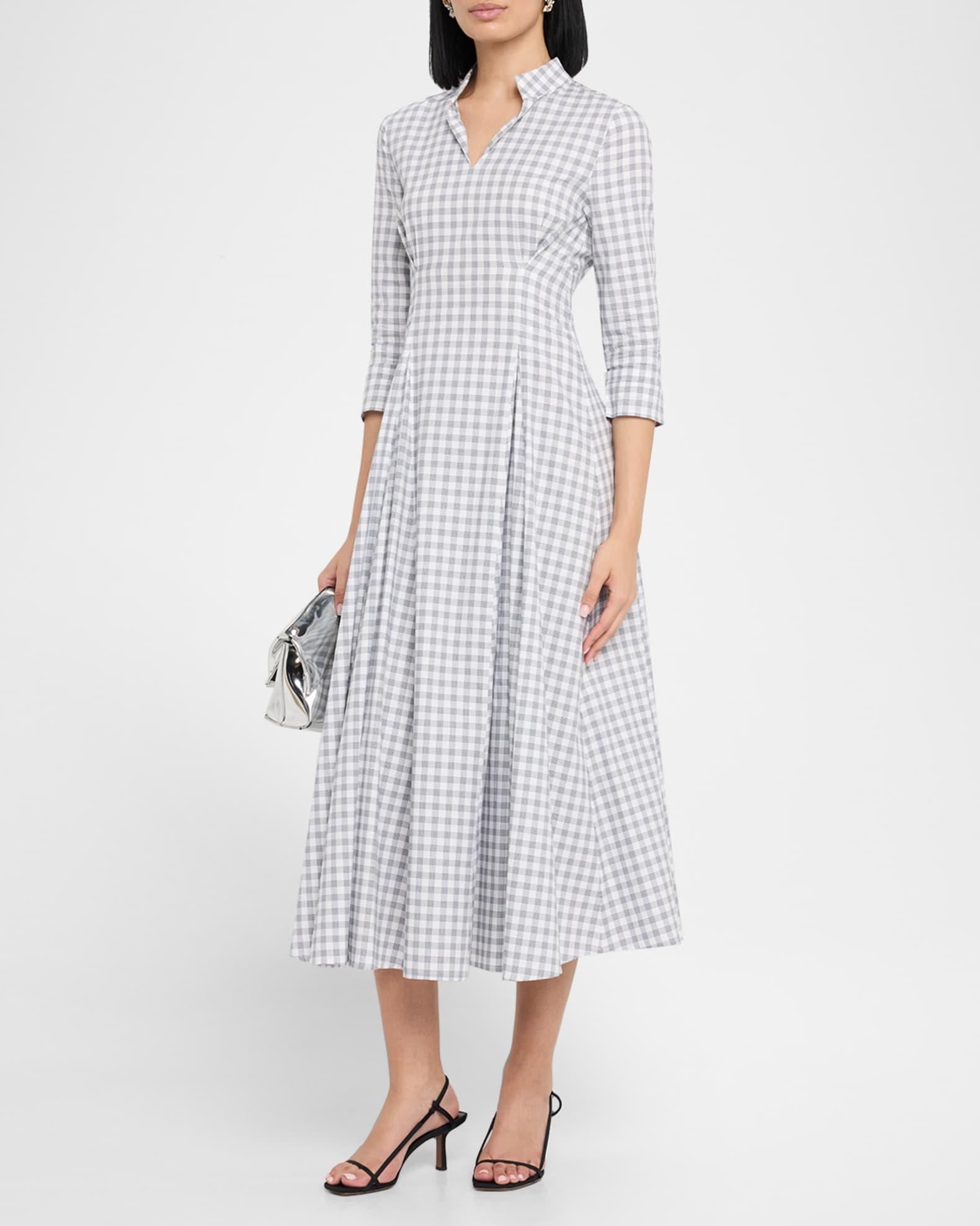 Misook gingham-print cotton maxi dress features godet skirt inserts for added flair and movement Approx. 48"L from shoulders to hem V neckline with high collar 3/4 sleeves Cinched waist Hem falls below the knee A-line silhouette Invisible back zipper Cotton Machine wash cold Imported