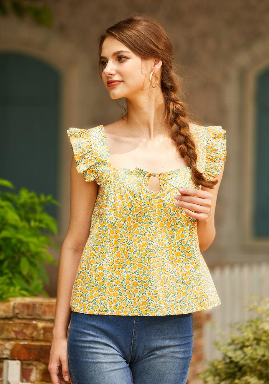 Bring a sprinkle of garden delight to your wardrobe with this whimsical ruffle-sleeved blouse from our ModCloth namesake label. Crafted from breathable cotton poplin, this top feels like a sunlit frolic through wildflower fields. The vibrant orange floral print dances across the fabric, while a playful tie-front accent and square neckline frame your silhouette with a dash of playful charm. Perfect for weekend picnics or casual office days, pair it with your favorite high-waisted jeans or a swishy skirt. 100% Cotton Machine wash cold, line dry Imported Model is wearing a US size S Model Measurements: Height 5'8"/ Bust 33''/ Waist 24''/ Hips 35''