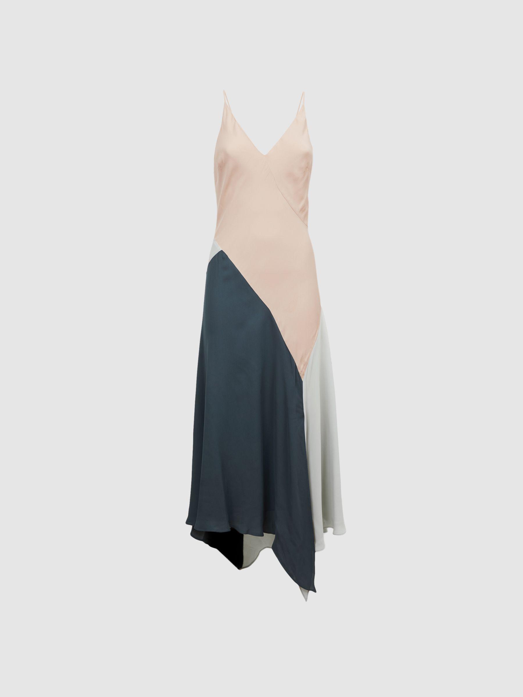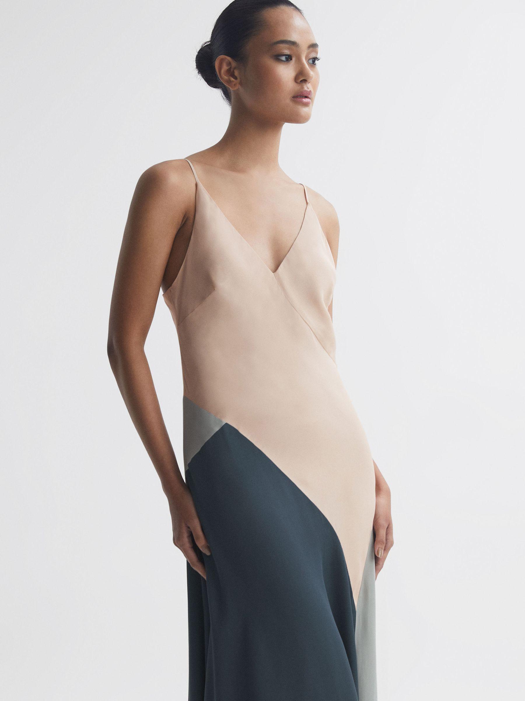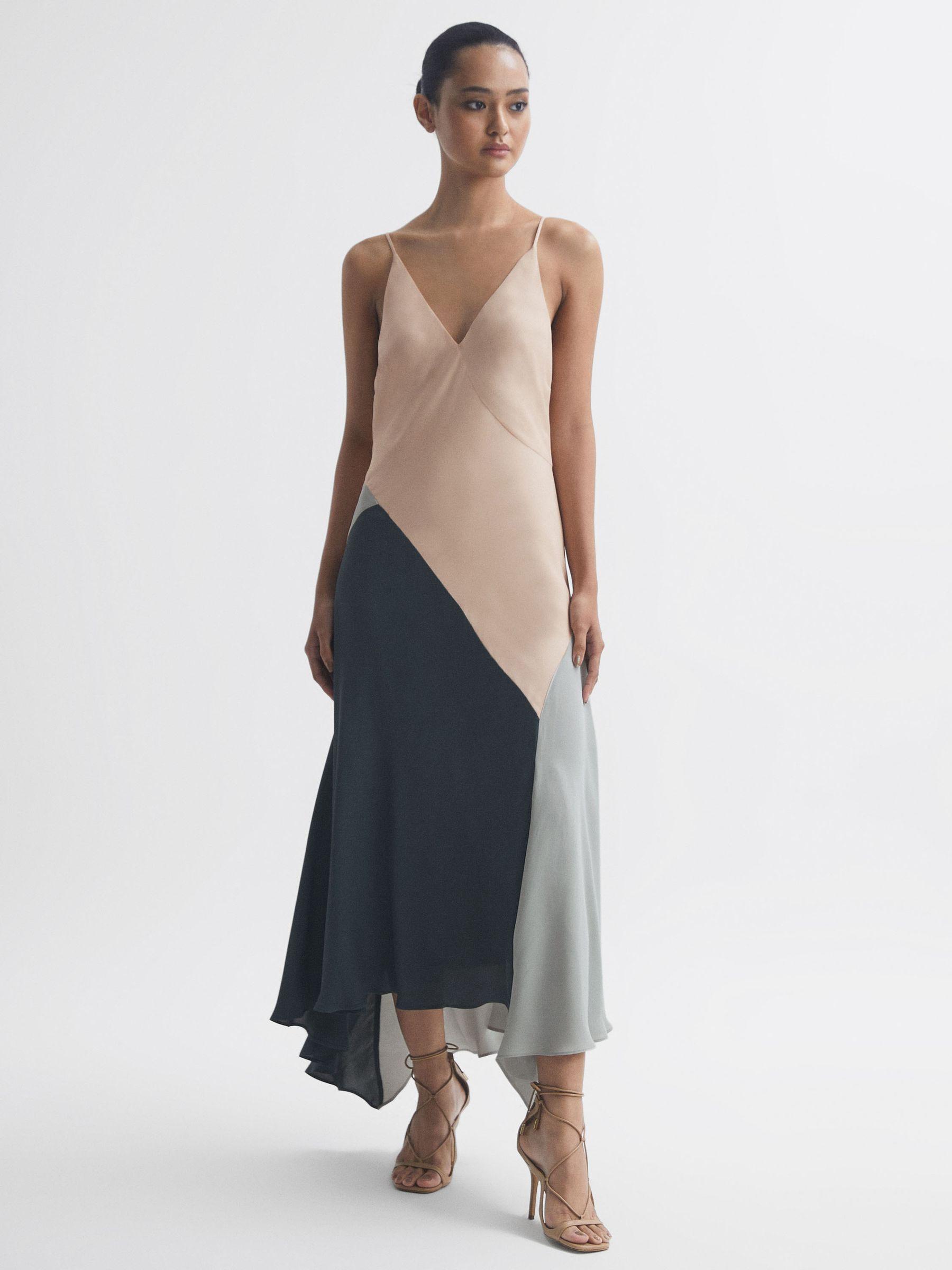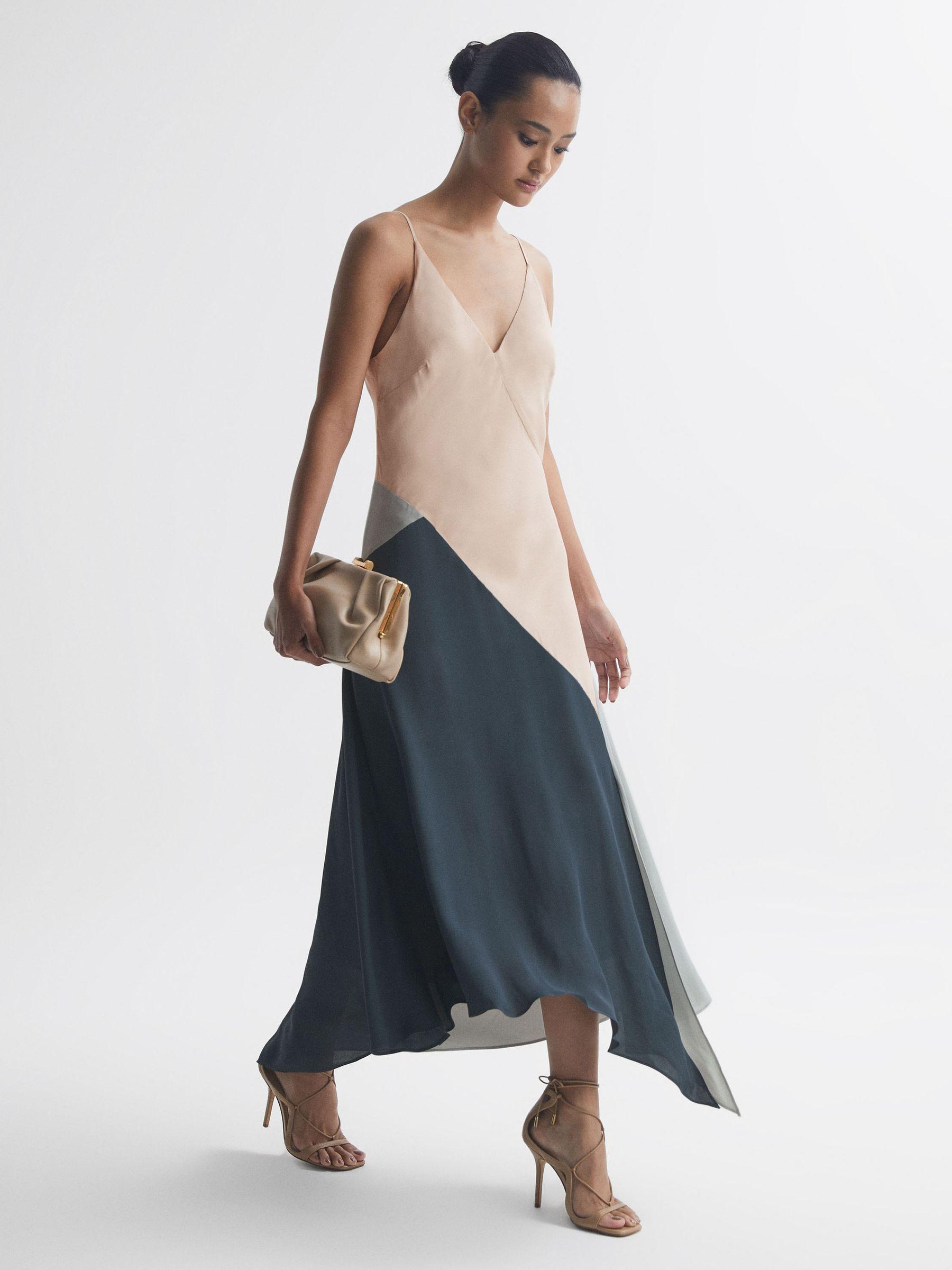 The Hudson colourblock dress is crafted from a smooth, flowing fabrication which fits elegantly against the frame, and it skims the legs to an asymmetric, midi-length finish. Thin shoulder straps and a V-neckline showcase the chest. Style for your summertime plans with heeled sandals and simple jewellery. V-neckline Thin shoulder straps Colourblock design Asymmetric hem Fitted Midi length