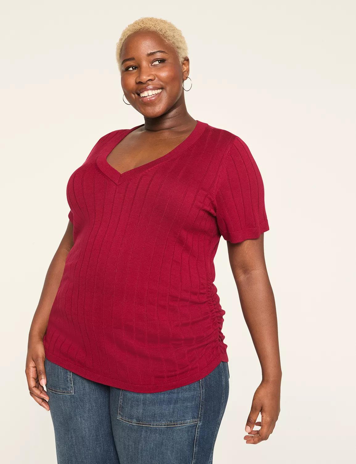 Available in Plus Size The ruching at the sides of this so-soft sweater gives a fit that feels custom-made for your curves. FIT: Fitted. Designed to fit closer to the body. Length: 30 Standard length FEATURES: V-neck Short sleeves Ribbed trim Ruching at sides FABRIC: Soft, breathable sweater knit Machine Wash 100% Rayon Item Number #412344 Imported Plus Size Top . Plus Size Fitted Short-Sleeve Side-Ruched Sweater, in Deep Red, 26/28, Womens, Lane Bryant