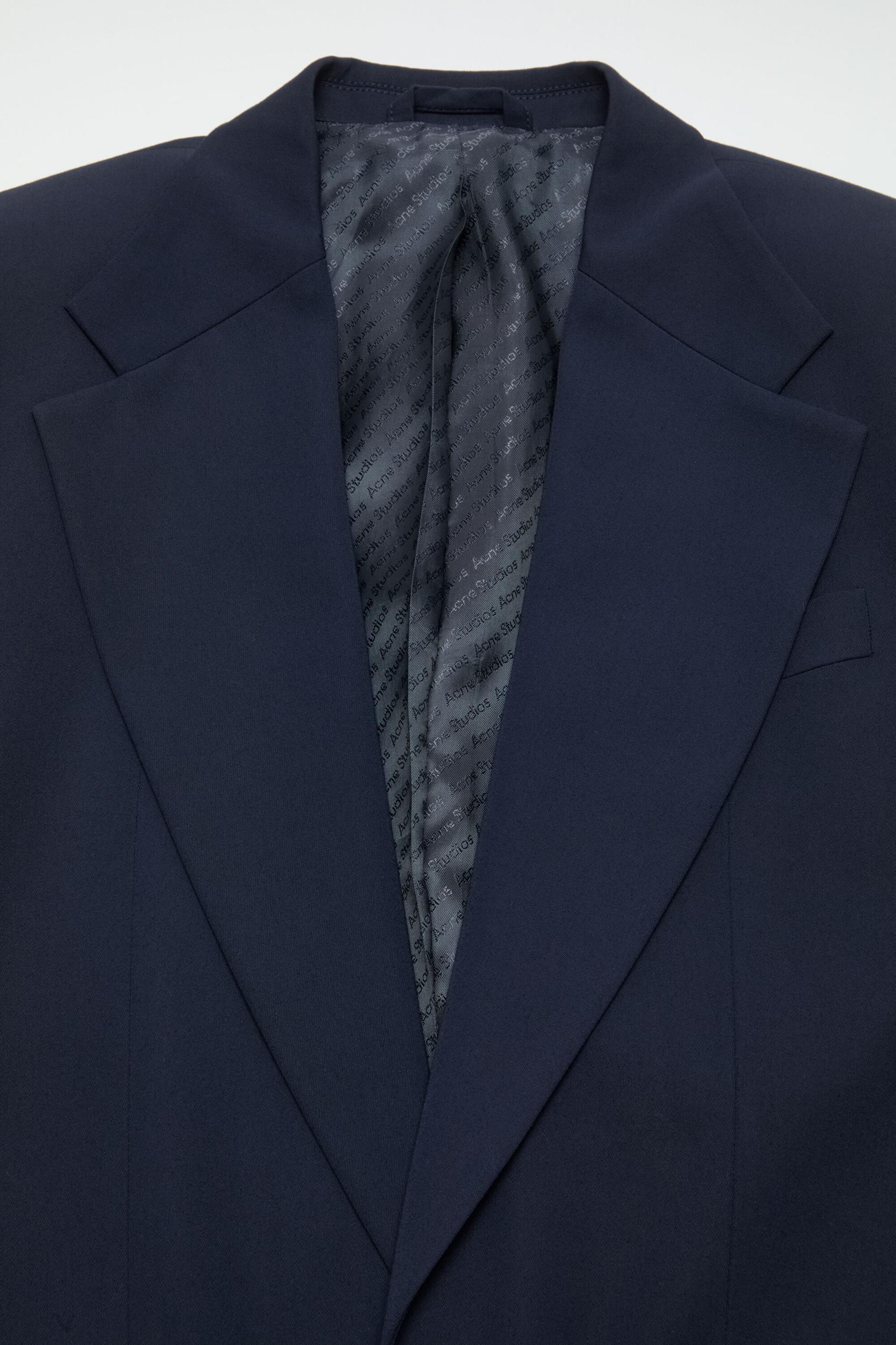 Single-breasted suit jacket crafted from soft fluid fabric with a visible single branded button closure. Constructed with shoulder padding and chest canvas for structure. Features a chest welt pocket and front flap pockets, functional cuff vents with four kissing branded buttons. Fully lined with Acne Studios monogram fabric. Cut to a slim fit and below hip length. FN-MN-SUIT000419