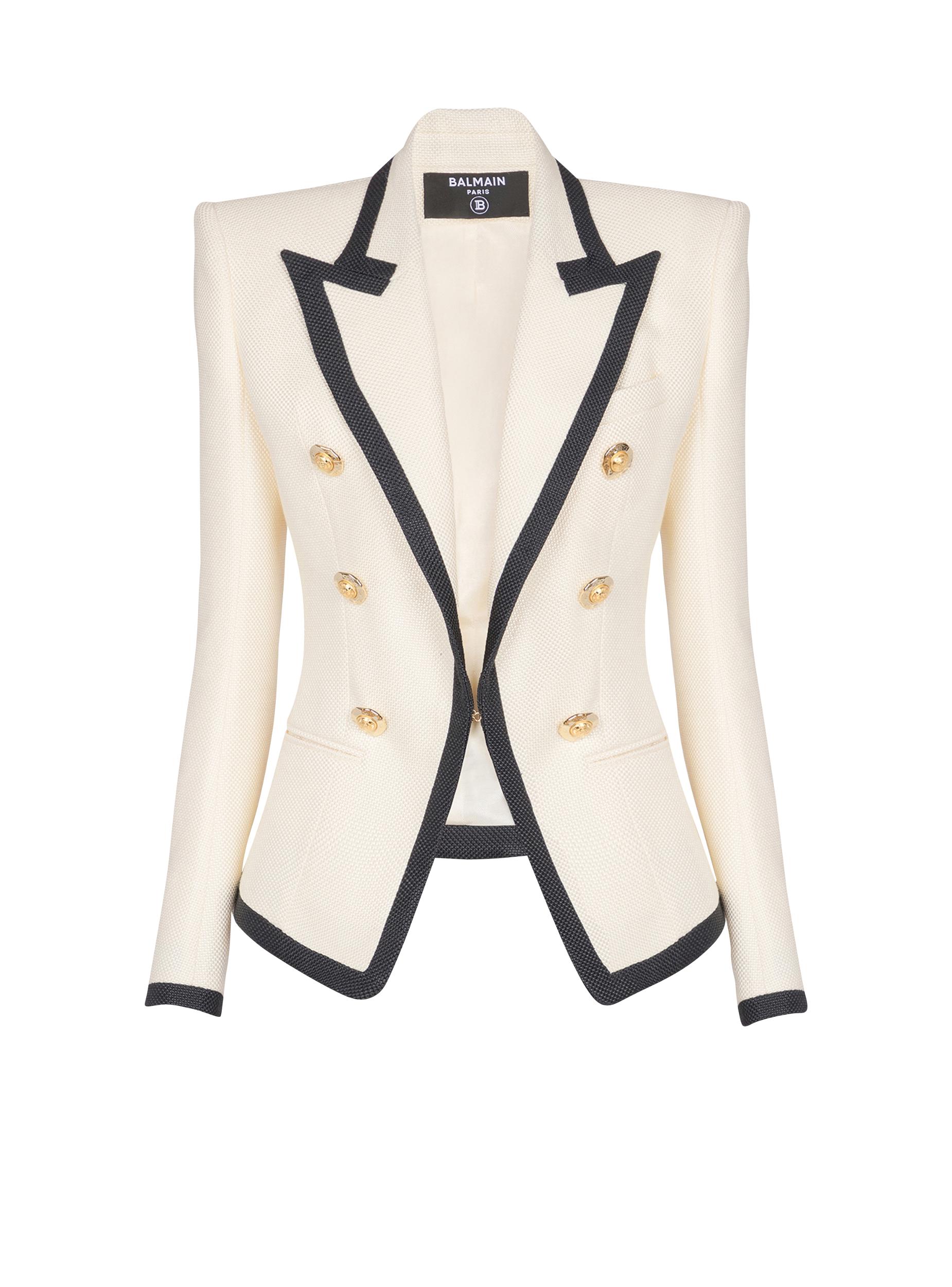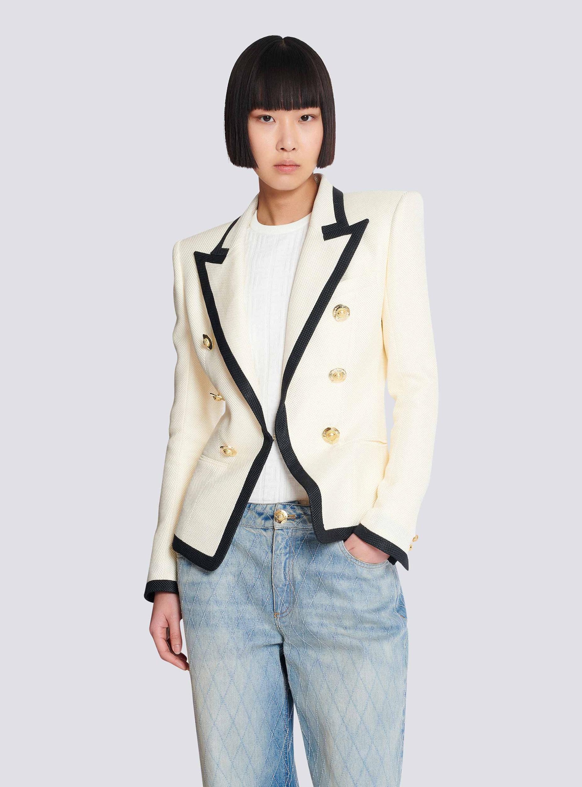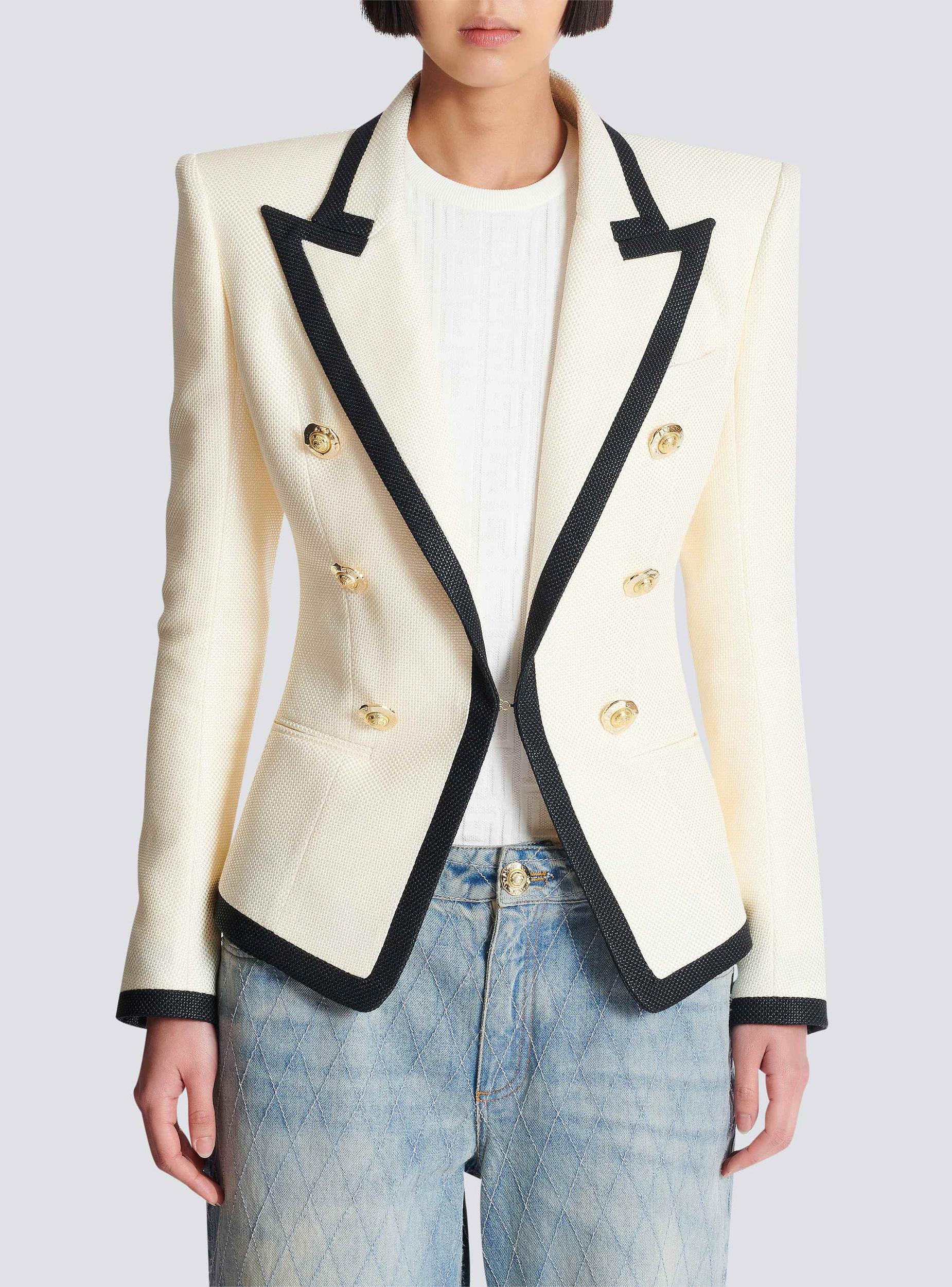 Fitted two-tone basketweave jacketItalian tailored collarStructured shouldersLong sleevesStraight cuffs with 5 golden metal ‘Coin’ buttons1 breast pocketInvisible hook fastening6 decorative "Gold and Gold Coin" buttons on the front2 slash side pocketsContrasting trimInside slash pocketTwill liningTailored fit, defined waistModel measures 178cm and wears a size 36Main material: 77% viscose 23% cottonMade in FranceItem: FF1SE165VI29