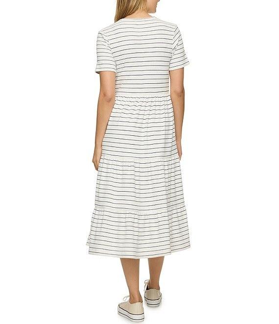 From Flag and Anthem, this dress features: Striped pattern Flattering crew neckline Short sleeves Midi-hem skirt with pockets Pullover styling Effortlessly and endlessly versatile style Approx. 47.5" high-point-shoulder length Super-soft fabric with the perfect amount of stretch Polyester/spandex super-soft knit fabric Machine wash/tumble dry Imported.