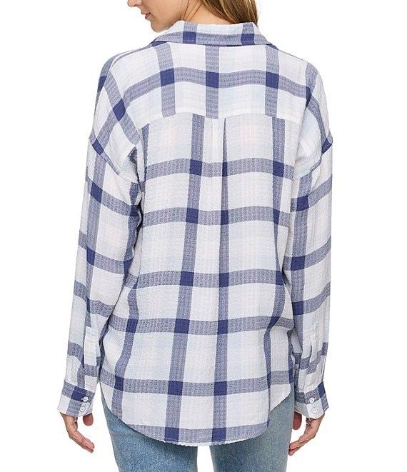 From Flag and Anthem, this shirt features:Light and airy woven fabricTimeless plaid printCollarLong sleeves with button cuffsButton frontSlightly curved, high-low hemRelaxed, oversized fitComfortable and easy-to-wear styleViscose/polyester/spandexMachine wash/line dryImported.
