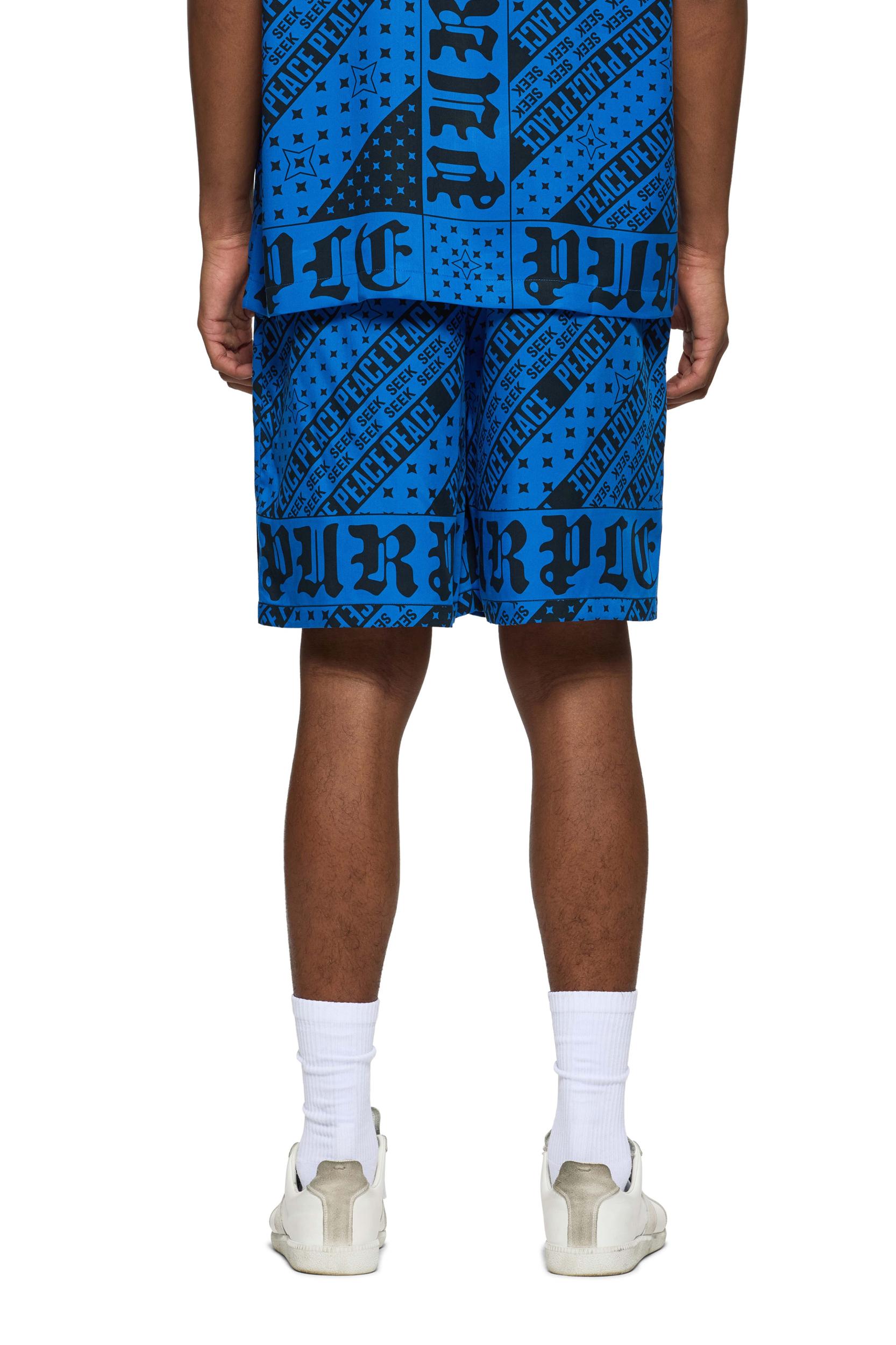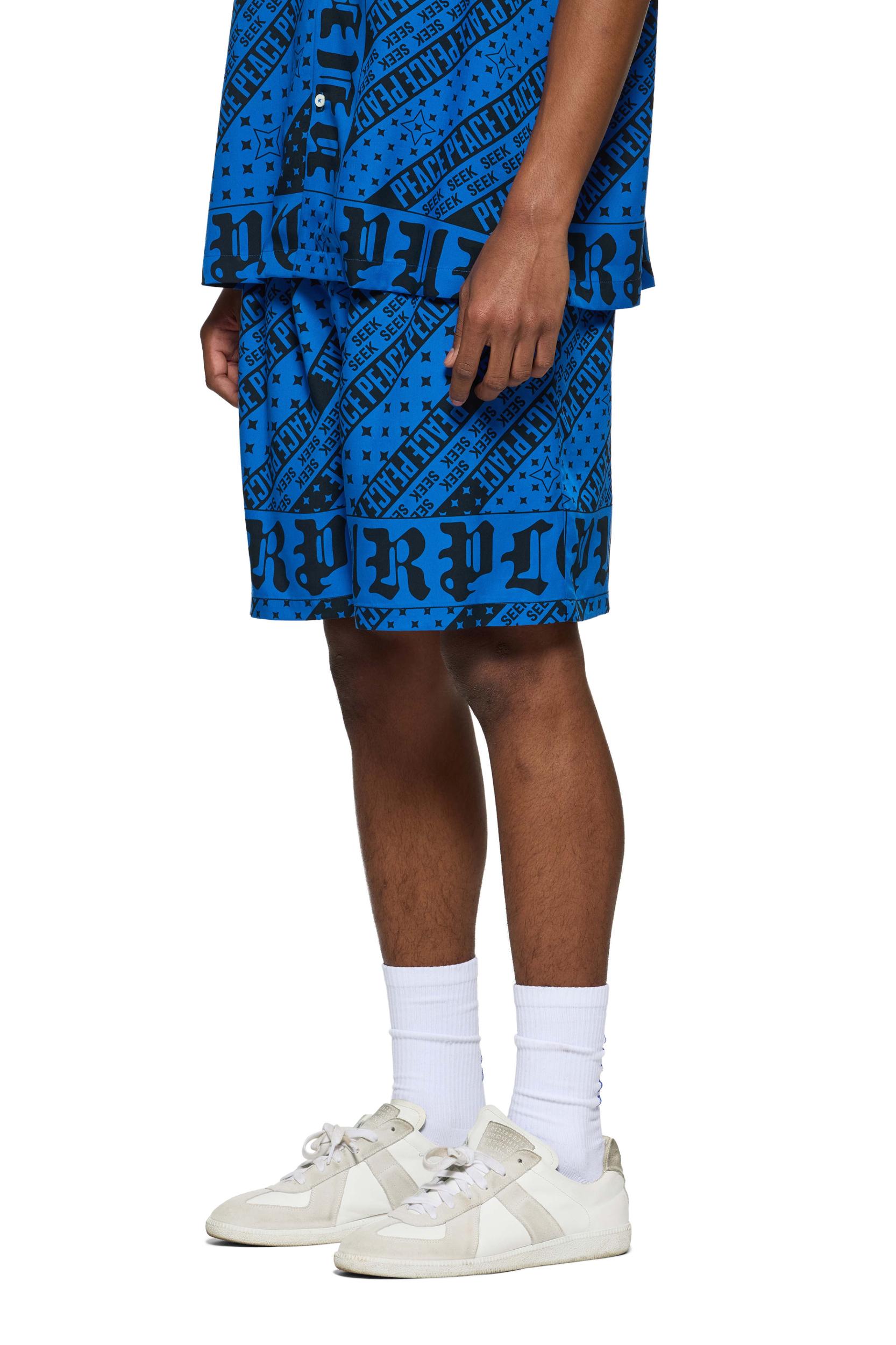 Cut from Lyocell with typeface graphics, these blue shorts are tailored for a relaxed fit with a comfortable pull-on stretch waistband. Gothic Purple Brand logo lettering is printed across both hems. Pre Fall 2024 White Label 100% Lyocell 13 1/4" Front Rise, 6 3/4" Inseam, 14 3/4" Leg Opening All Over Digital Print Built in Liner Elastic Waistband
