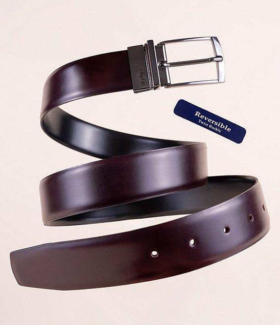 From Flag LTD., the Men's Dean Reversible Leather Belt features: Calfskin leather Belt is reversible - black leather and reverses to cordovan leather Buckle is etched with our Flag Ltd logo Soft nubuck leather lining Brushed pewter square buckle Approx. 1.25" width Made in Brazil Imported. Suggested belt size: Take your existing pants size and add two inches. E.g. if your pants size is 32, purchase a size 34.