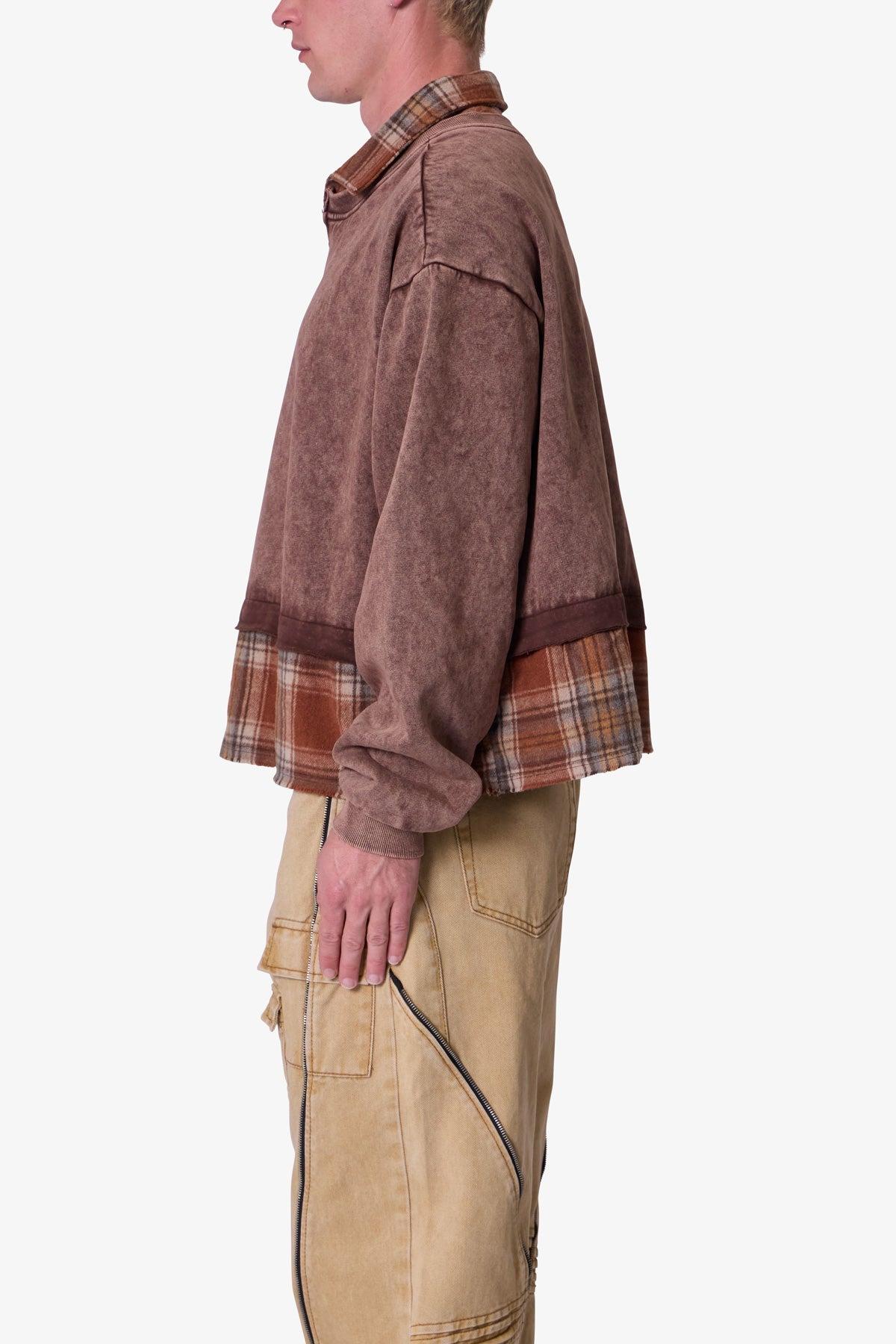 the Flannel Crew Pullover Sweater is a custom-knit sweater layered over a flannel shirt later that is constructed from cotton that is a cropped on the outer layer, distressing details, a vintage wash for improved hand feel and worn in look. details relaxed fit 100% cotton model is 6’1, 140 lbs and wears a size M