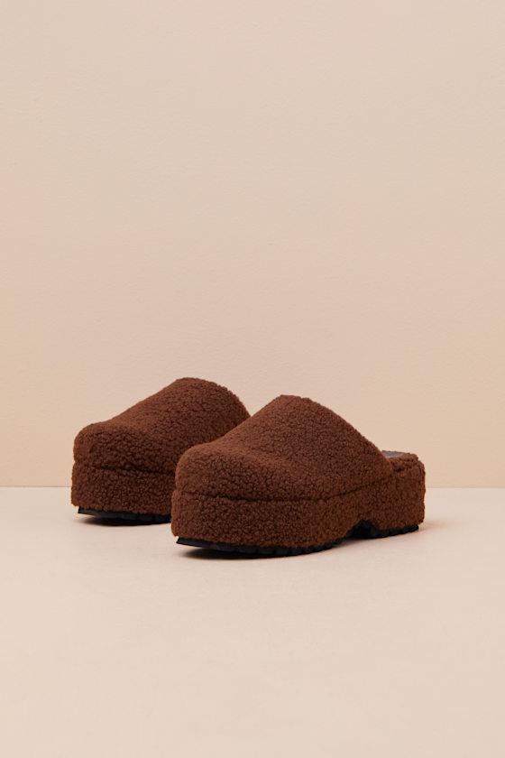 You'll be the style icon of sweater weather season with some help from the Lulus Flannerie Dark Brown Faux Fur Platform Mules! These slipper-style mules feature fuzzy faux fur that shapes a clog-inspired silhouette with a rounded-toe upper and a low-cut collar, atop a 1.5" toe platform. The simple slide-on design is perfect for effortless styling, while a chunky block heel completes the look!