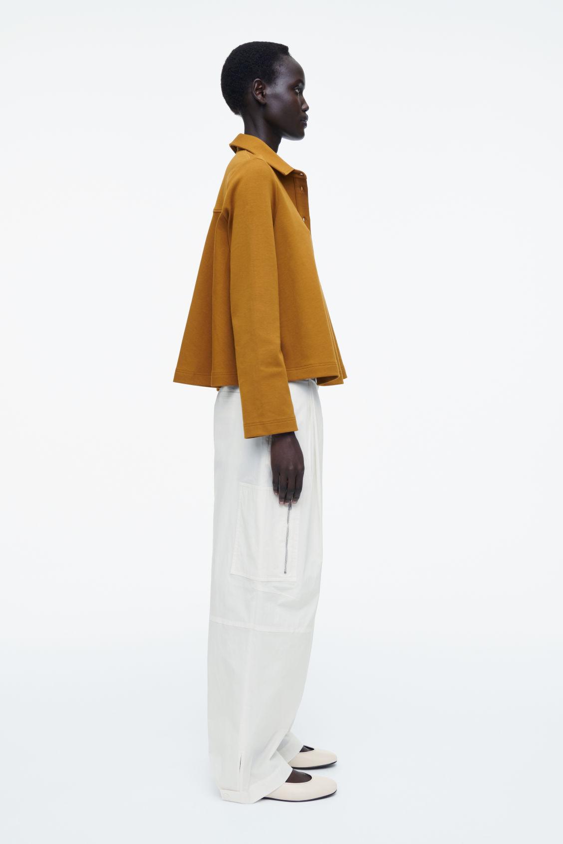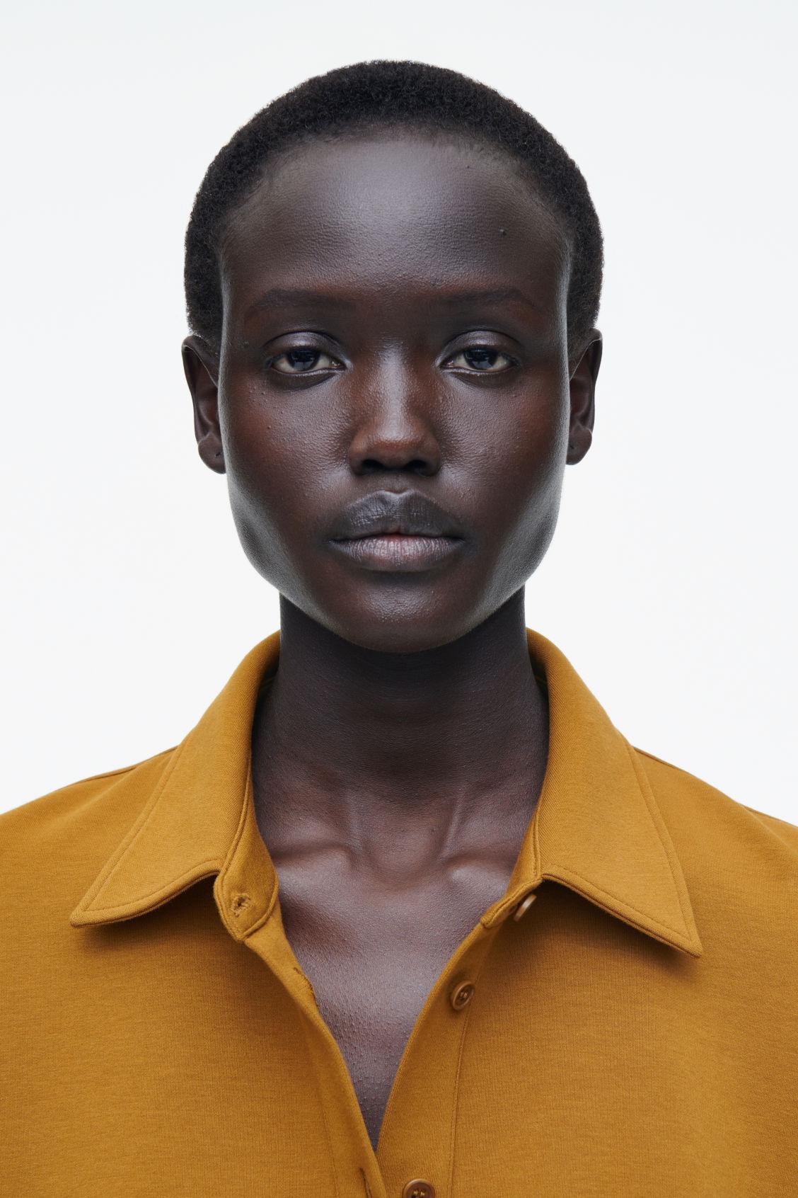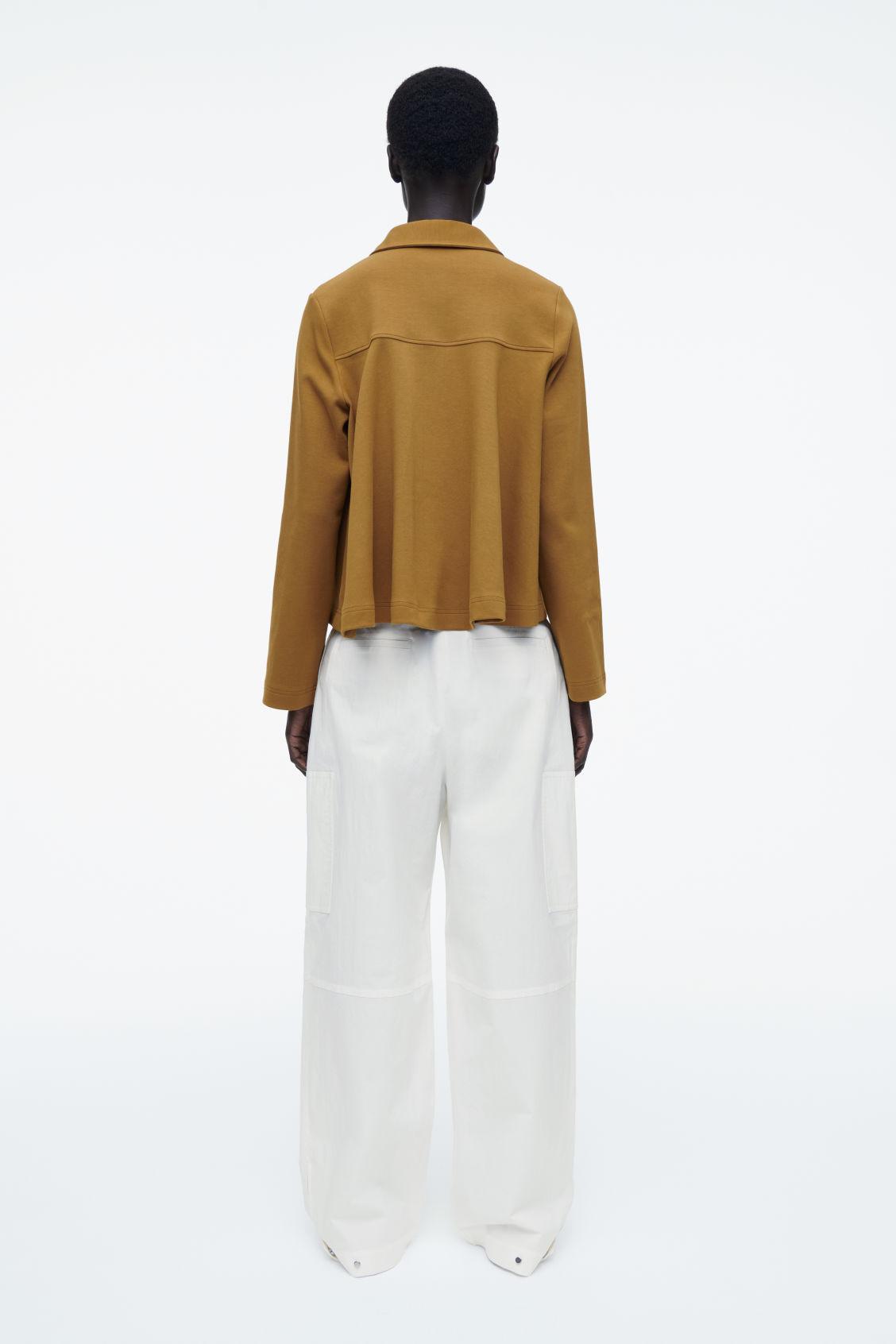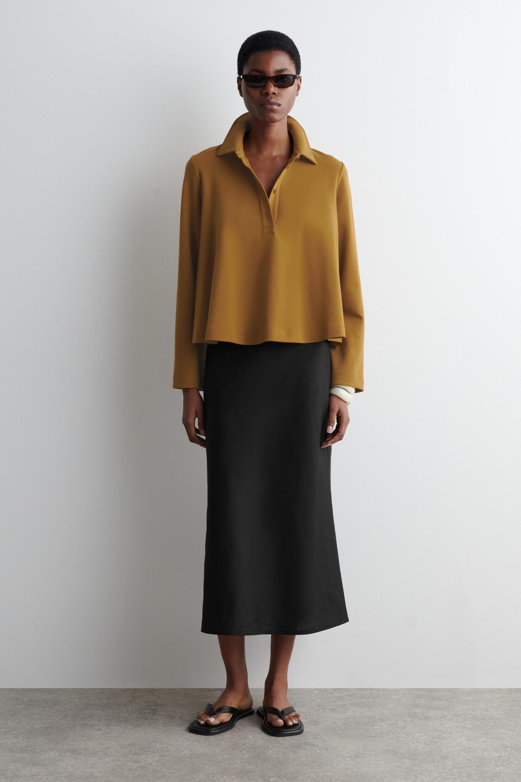 Imbuing the classic polo shirt with a feminine attitude, this flared top has a fluid hem and long sleeves. It's made from a soft cotton blend in versatile rust brown and has a pointed collar and tonal buttons. Relaxed fitButton closureA better alternative to conventional polyester, recycled polyester is made from pre‐ and post‐consumer waste Shell: 72% Cotton, 24% Recycled polyester, 4% Elastane. Excluding trims / Machine wash Back length of size S is 21.85" / Model wears a size S