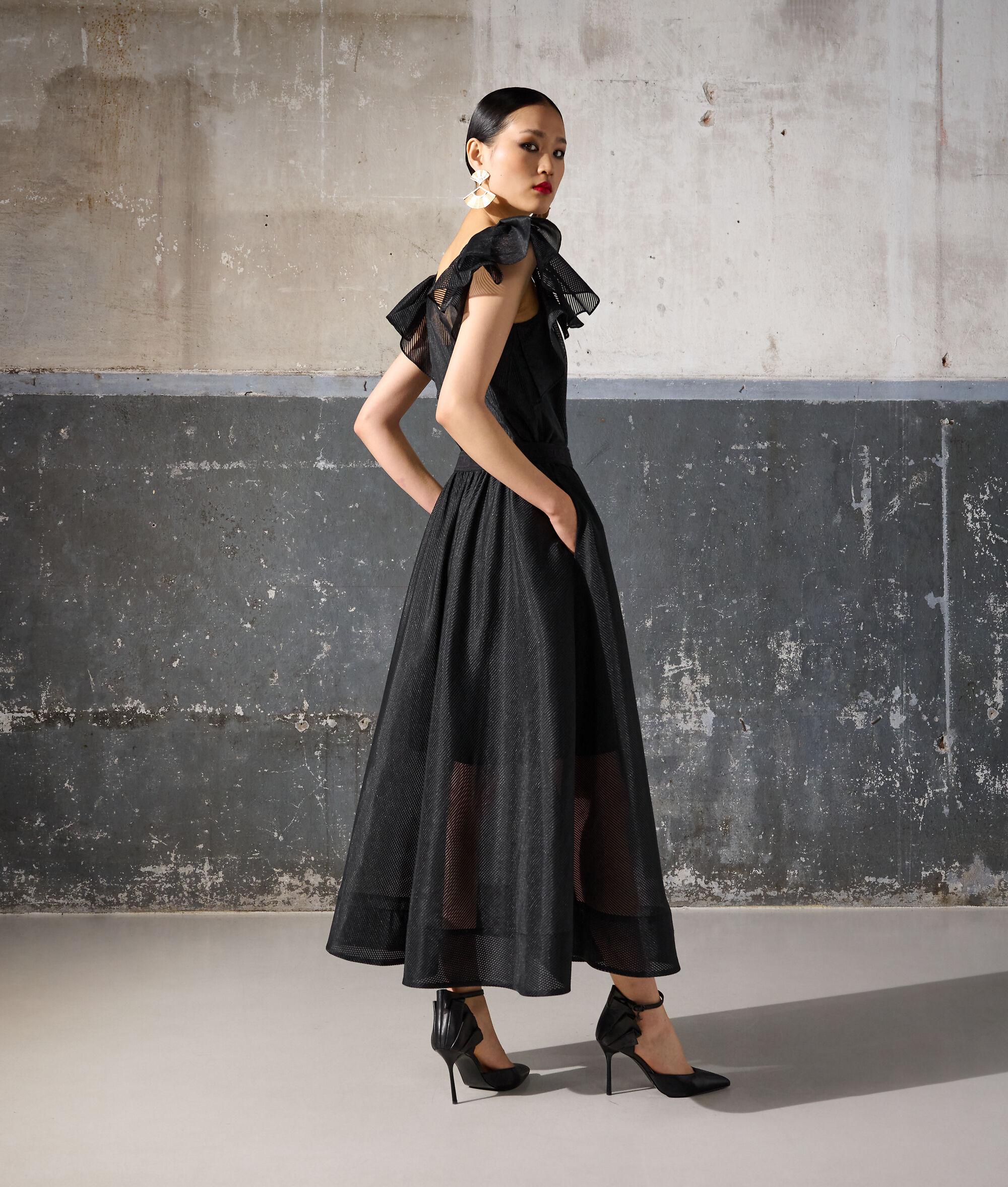 a maxi-length and flared silhouette for added drama, while a KARL-branded
