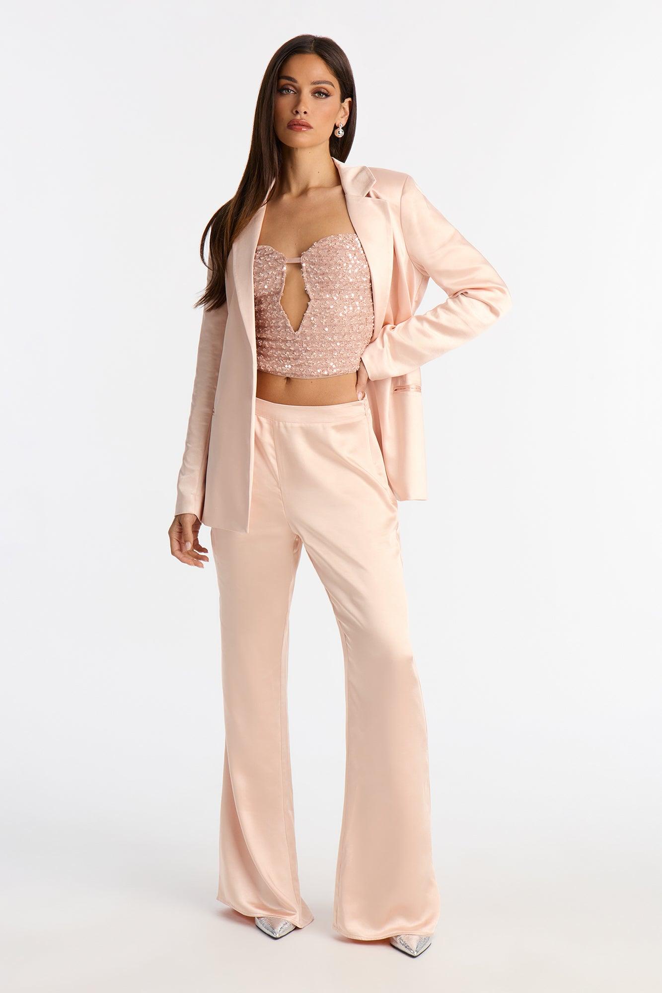 Available In Pink. Flare Pant Side Zip Closure High Rise Satin 32" Inseam Non Stretch Pair With "Flawless Energy Satin Belted Blazer" Self: 100% Polyester Imported
