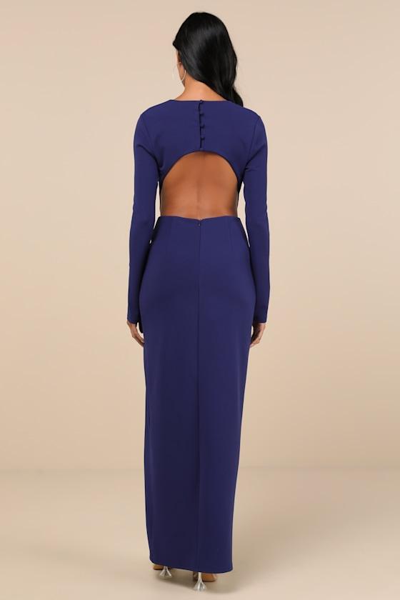 Wherever you wear the Lulus Flawless Esteem Royal Blue Long Sleeve Cutout Column Maxi Dress, admiration is sure to follow! Stretchy crepe knit shapes this sophisticated dress that features a princess-seamed bodice, a crew neckline, and long sleeves. The fitted waist tops a figure-flaunting column skirt that falls to an elegant maxi hem. Eye-catching elements like an alluring side slit and an open-back cutout (below a functional button-loop placket) lend a detailed finish to the look. Hidden back zipper/clasp.