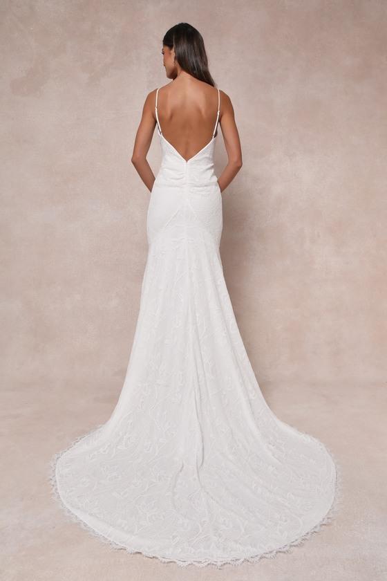 The Lulus Flawless Extravagance White Lace Trumpet Hem Maxi Dress is ready to make your big day look a reality! This dress is perfect for any Boho-style bride with its beautiful floral lace composition that shapes a sleeveless bodice, a flirty V-neckline, and adjustable spaghetti straps. The figure-flaunting silhouette continues down to a flaring, trumpet-inspired maxi hem with a dramatic train at the back (accented with eyelash lace trim). An alluring open-back design and flattering ruched detailing lend an eye-catching finish to this sensational design. Hidden back zipper/clasp.
