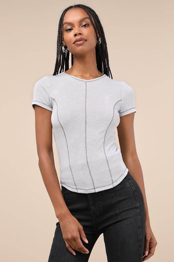Looking cool and casual comes easy when you have the Lulus Flawless Fit Heathered Light Grey Seamed Short Sleeve Top! Stretchy jersey knit, with a heathered effect throughout, shapes this better-than-basic tee with a crew neckline and short sleeves. The fitted bodice features corset-style paneling down to the slightly curved hem. Contrasting seaming throughout lends a modern finish.