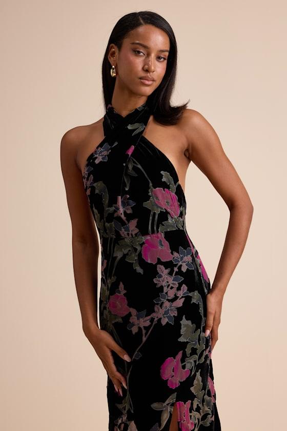 You'll be the envy of every event when you arrive in the Lulus Flawlessly Gorgeous Black Burnout Floral Halter Maxi Dress! Plush velvet boasts a stunning burnout floral motif as it shapes a tying halter neckline and a darted, cross-front bodice with a flirty open back. High, fitted waist flows into a figure-skimming, seamed skirt (with an asymmetrically lined effect) that falls to a sophisticated maxi hem with a sultry side slit. Hidden zipper/clasp at back.