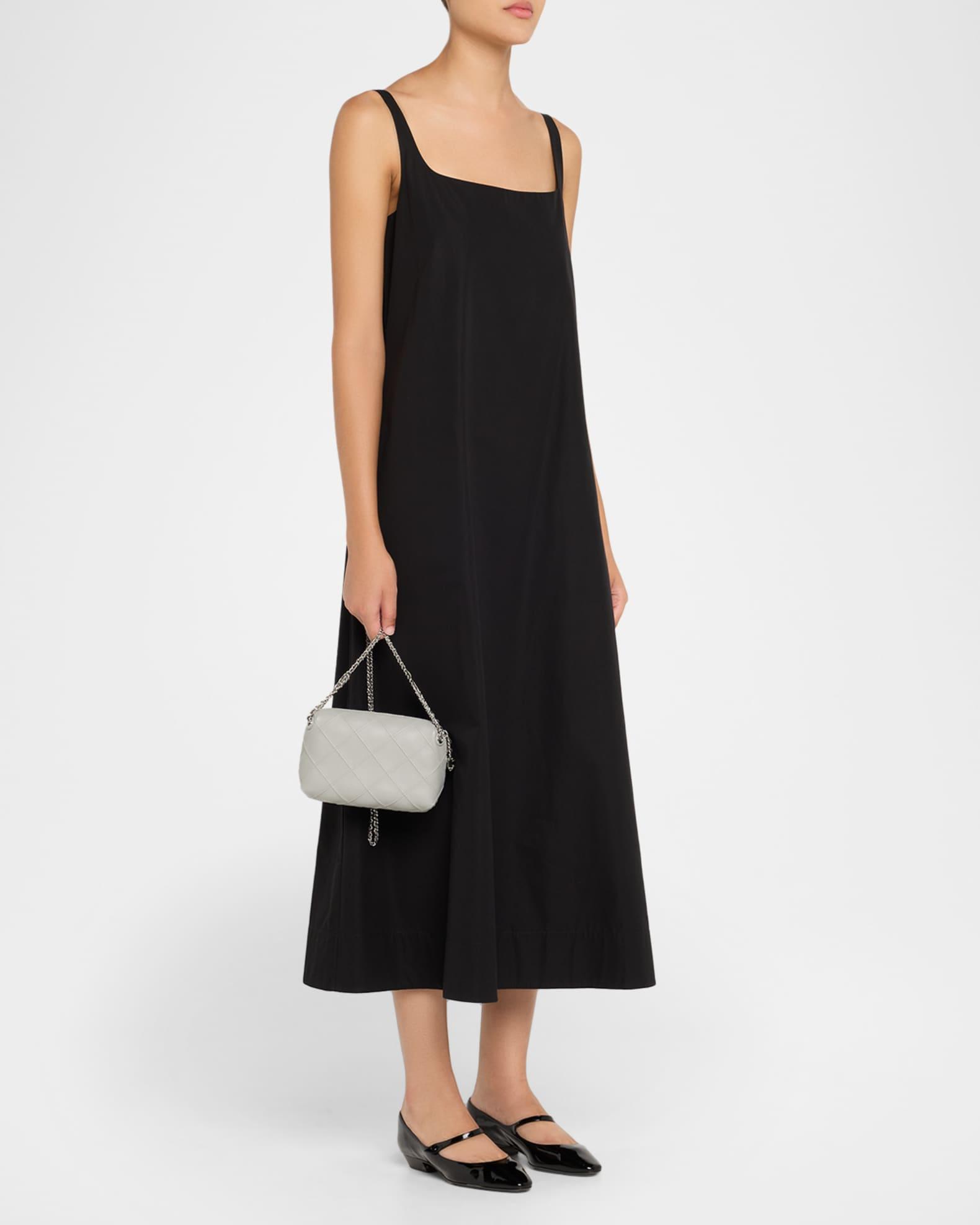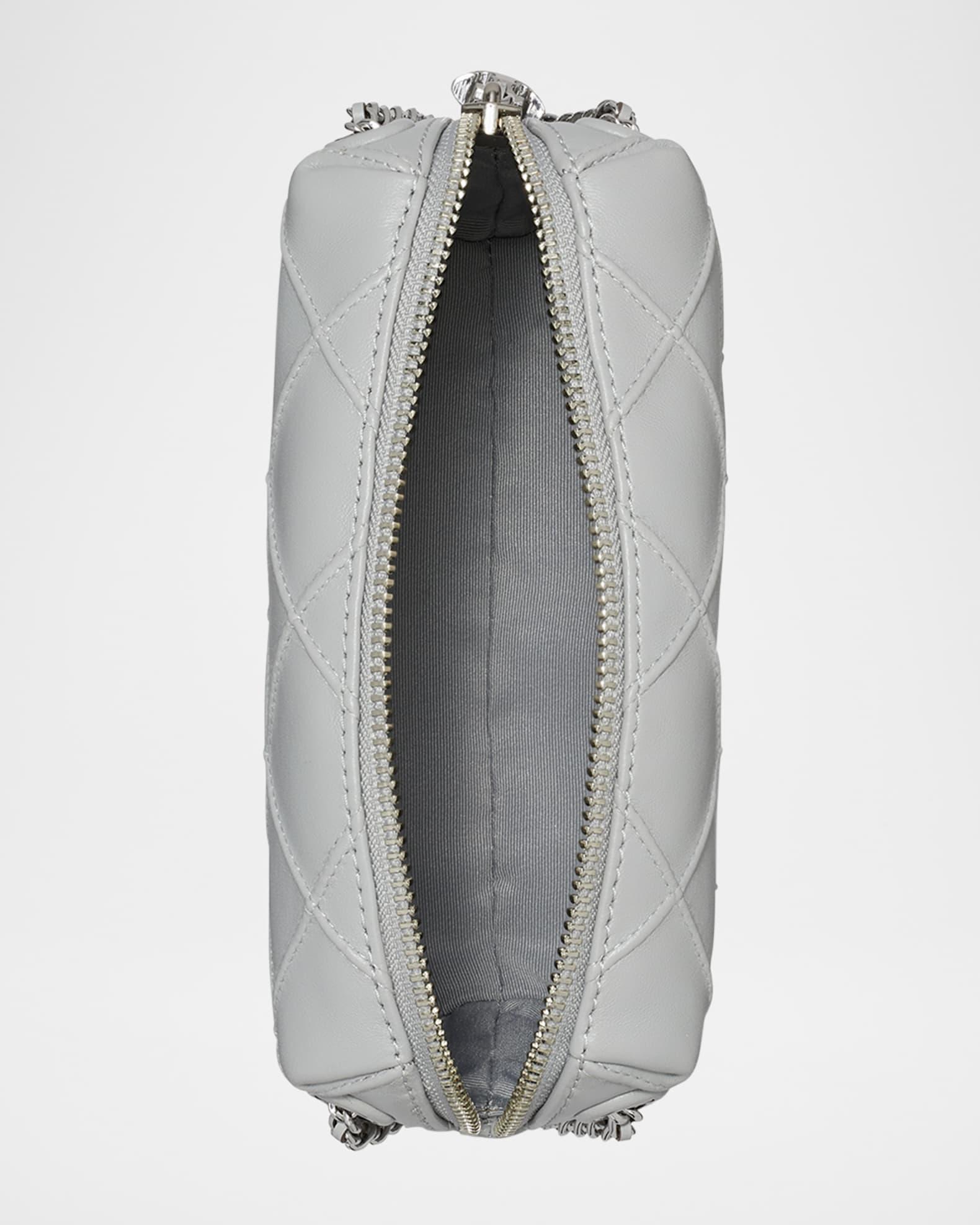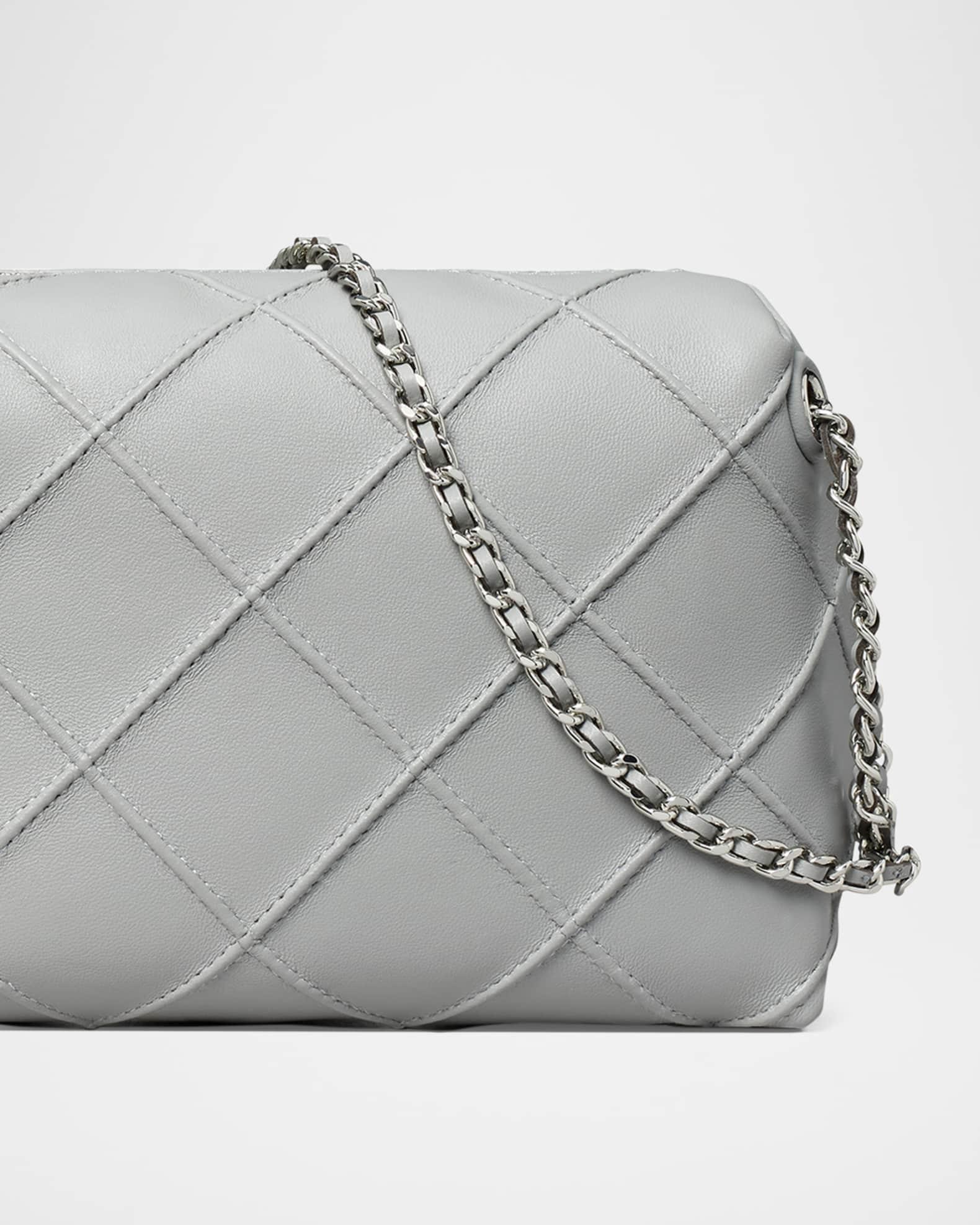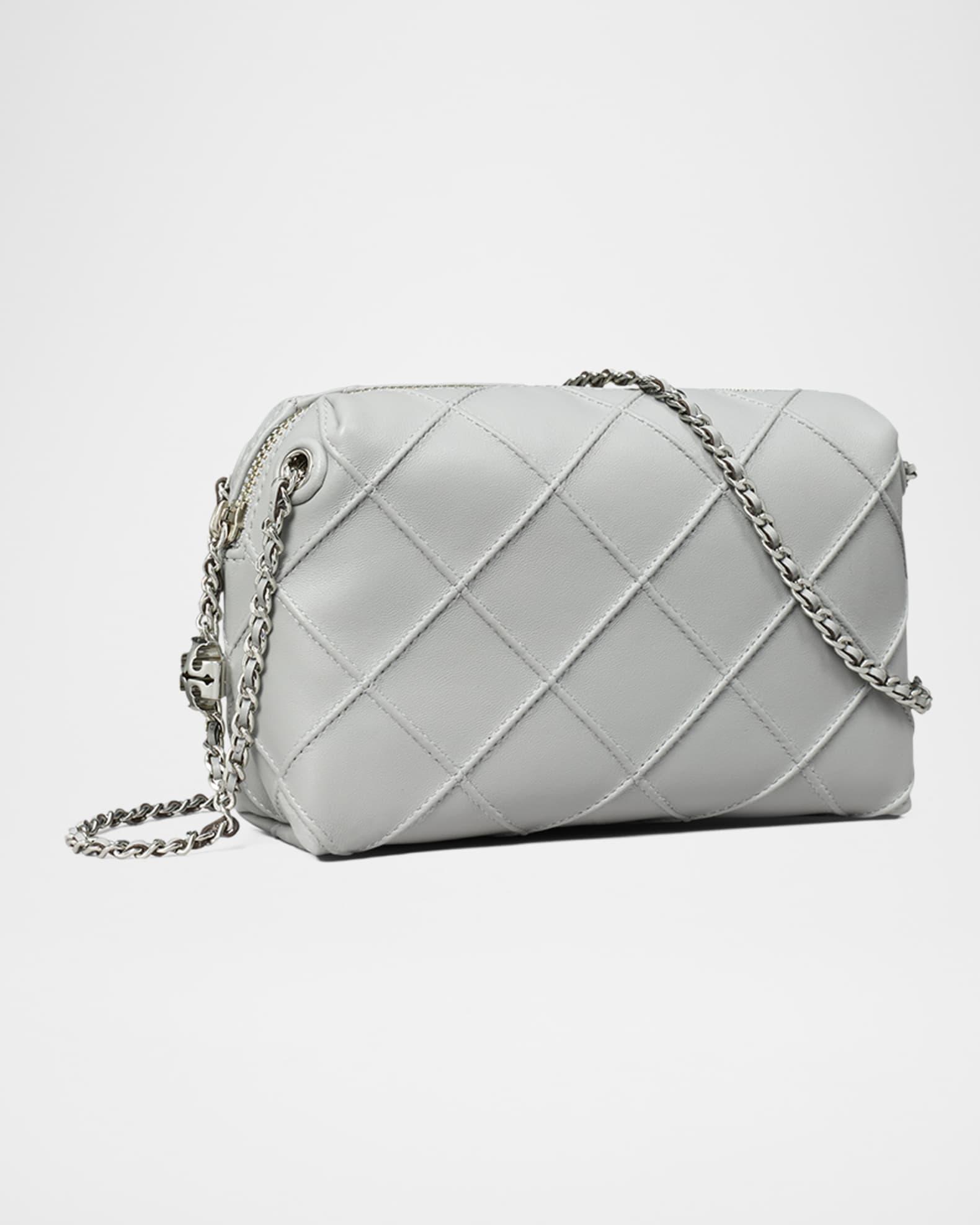 Crafted from buttery soft napa leather, the Tory Burch "Fleming" camera bag defines cutting-edge elegance with intricate diamond stitching and pintuck quilting. A braided chain strap adds a polished twist. Zip top Chain and leather interwoven crossbody strap, 22.2" drop Interior card pocket Hanging logo charm 4.5" H x 7.1" W x 2.4" D Lining: Polyester Imported