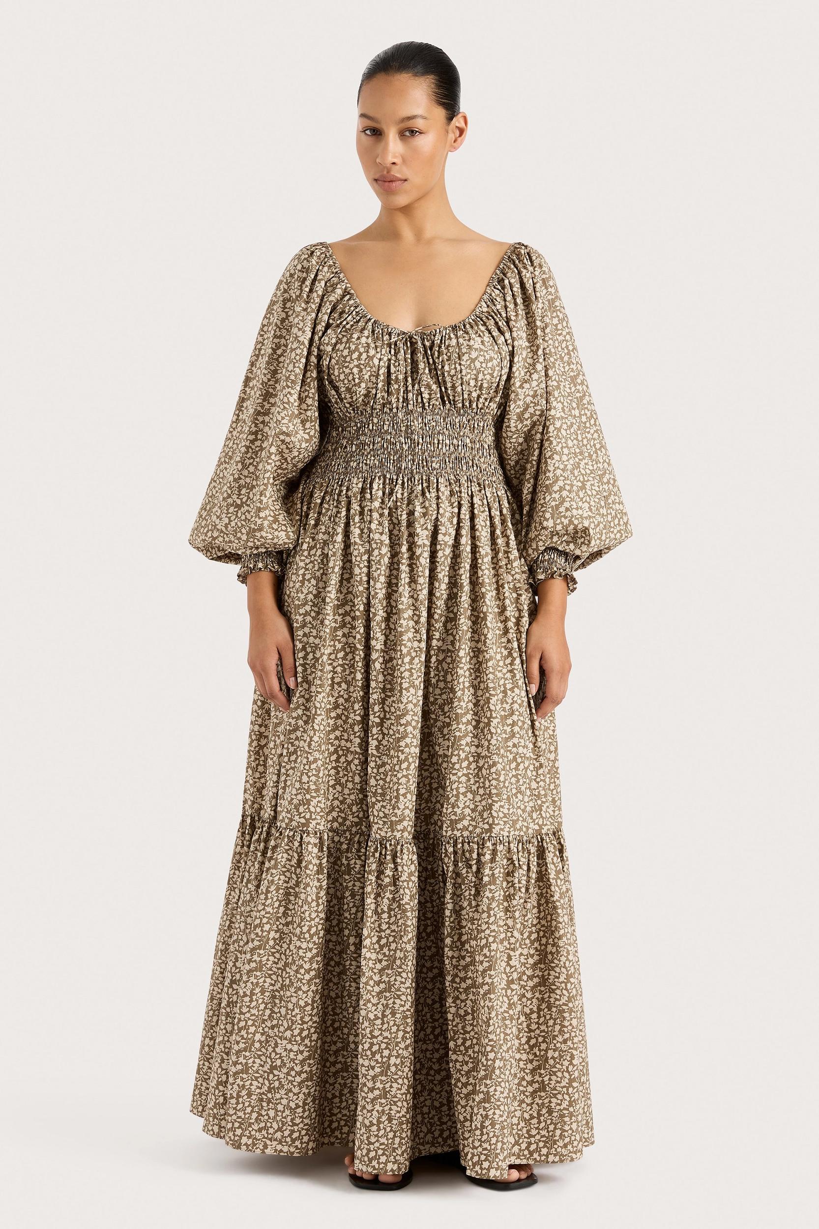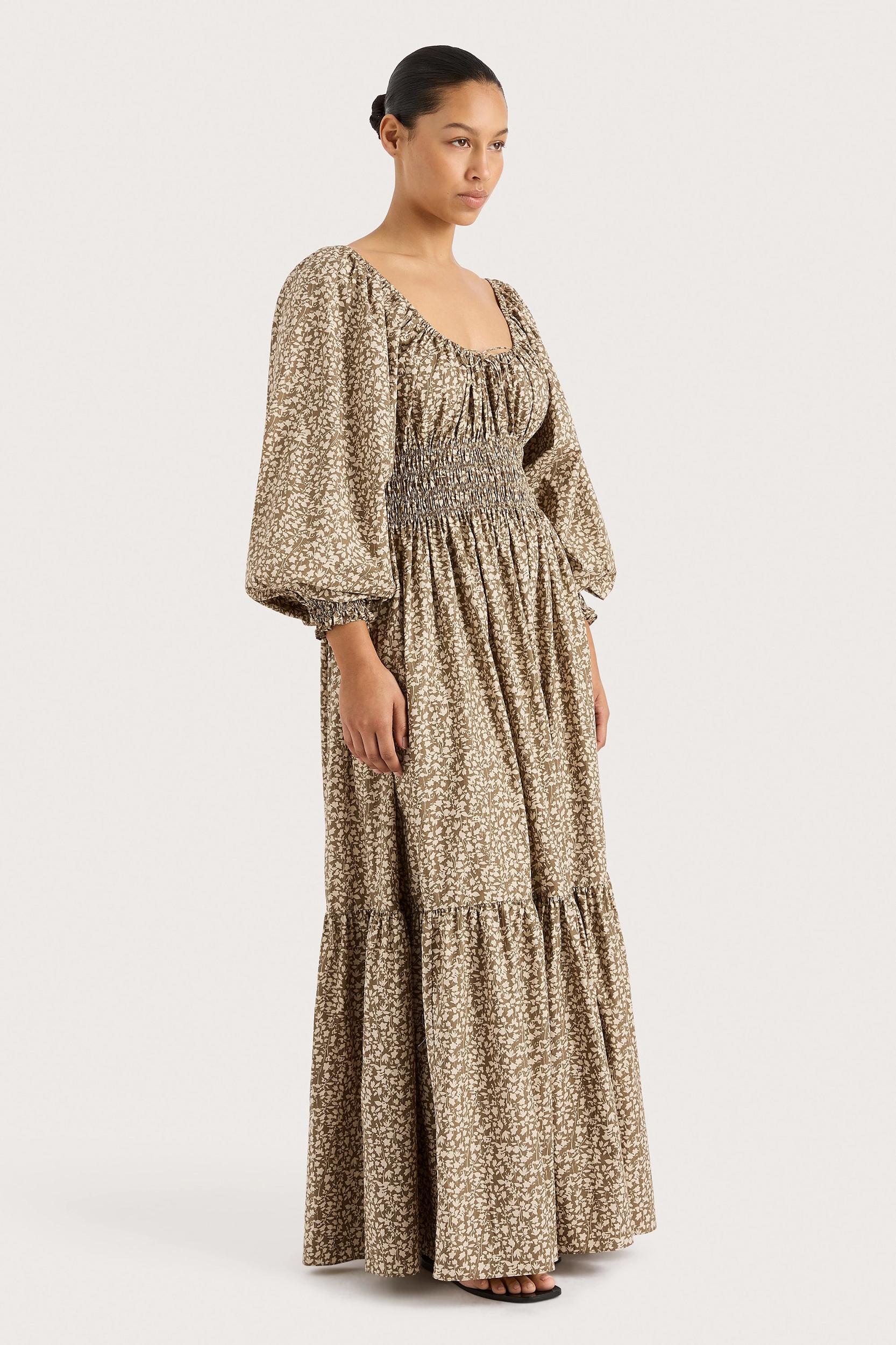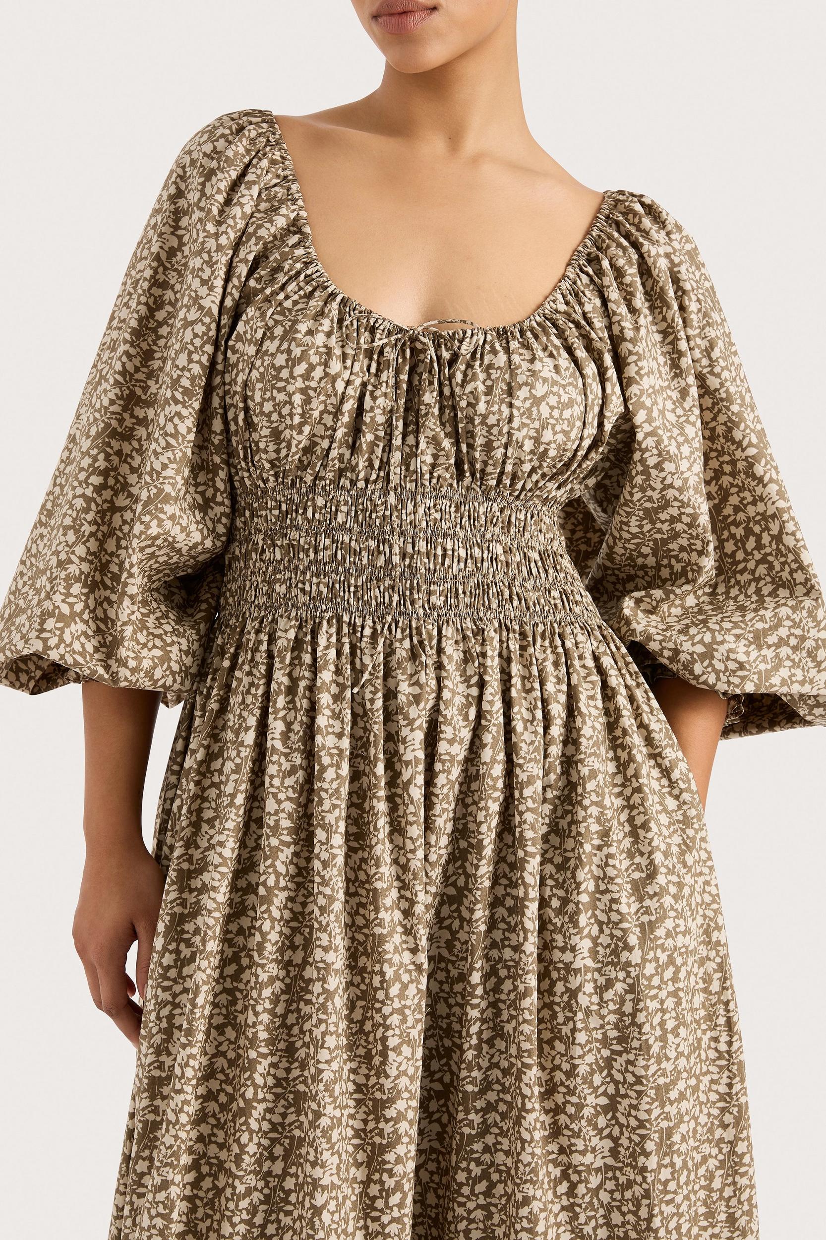 A bohemian-inspired silhouette that is versatile and effortless in wear. Featuring a scooped neckline and long balloon sleeves with an elasticated cuff, it is fitted through the upper body with a shirred bodice. It then leads into a floating A-line skirt with a tiered hem frill that crops at the ankles. Designed in a vintage-inspired micro floral motif, wear with a simple sandal on your next vacation.