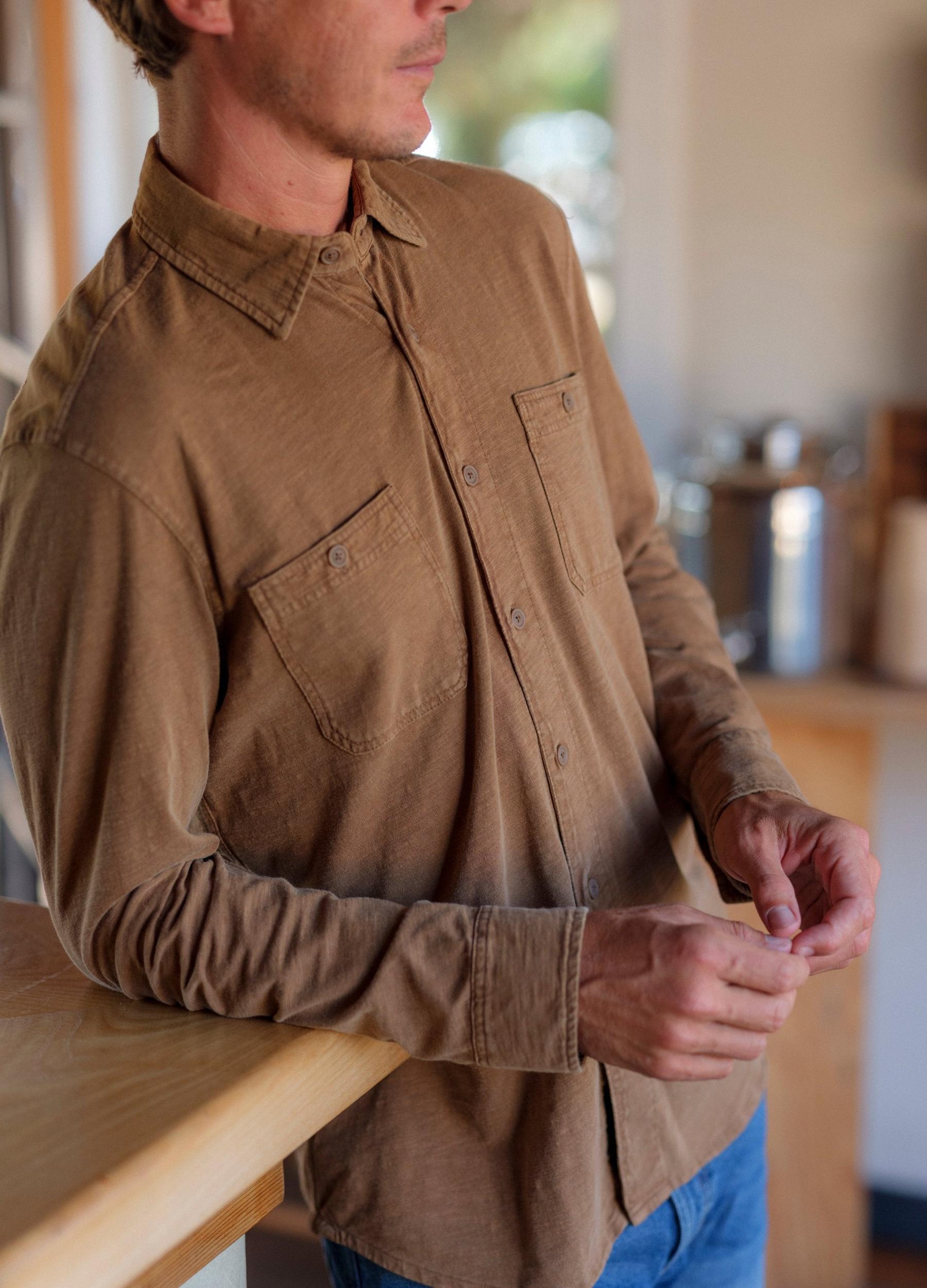 The great pretenders are back. It's like our ultra soft slub-cotton tees parading as button-up shirts. Finished with a faded weathered wash, this hybrid is made with finely spun slub cotton yarn, knit into a flexible jersey and cut and sewn with the details of a conventional casual shirt. Breathable, stretchable, with absolute softness. The Model is also wearing: Thompson Flex Stretch Chino (Relaxed Fit) - Birch. Model: Chris is wearing size medium and is 6'. ----Details---- Spread collar Button front placket Two patch pockets Curved hem Button through sleeve cuffs Reinforced with tonal poplin in yoke, placket and gusset. Imported ----Materials---- 100% Cotton ----Size & Fit---- Measuring Method: All measurements are in inches and based on a “flat” garment, as shown below. For comparison with one of your existing garments, please lay garment on a flat surface and follow the key measurement points. For chest and neck, if you double the flat measurement, you will get close to the full body measurement. ----Care---- Machine Wash Cold Separately Do Not Soak Before Washing Do Not Bleach Remove Promptly Tumble Dry Low Or Hang Dry In Shaded Area Cool Iron If Necessary