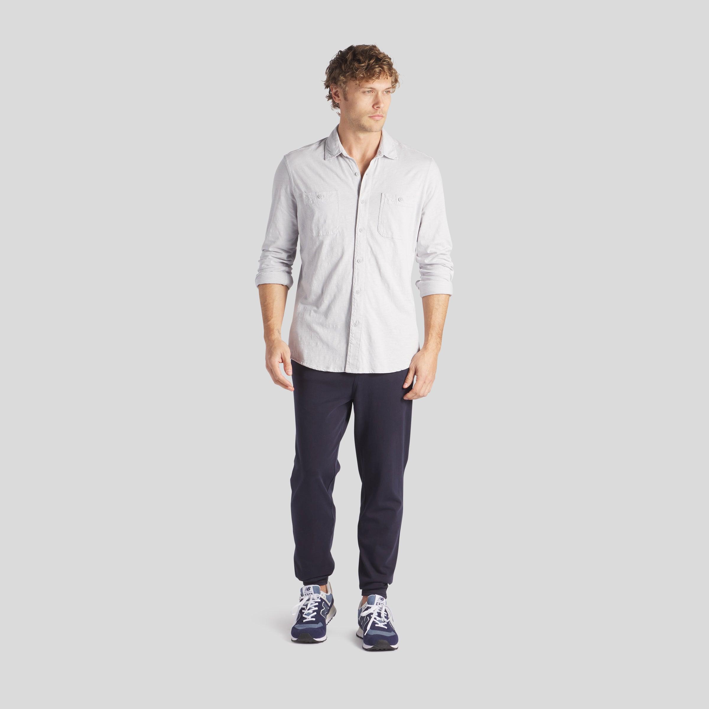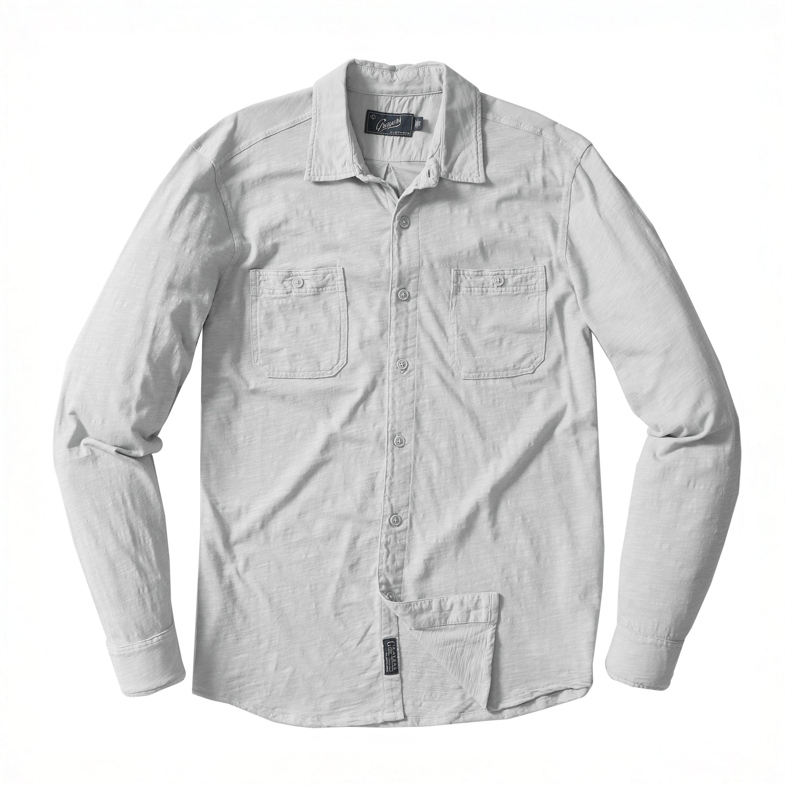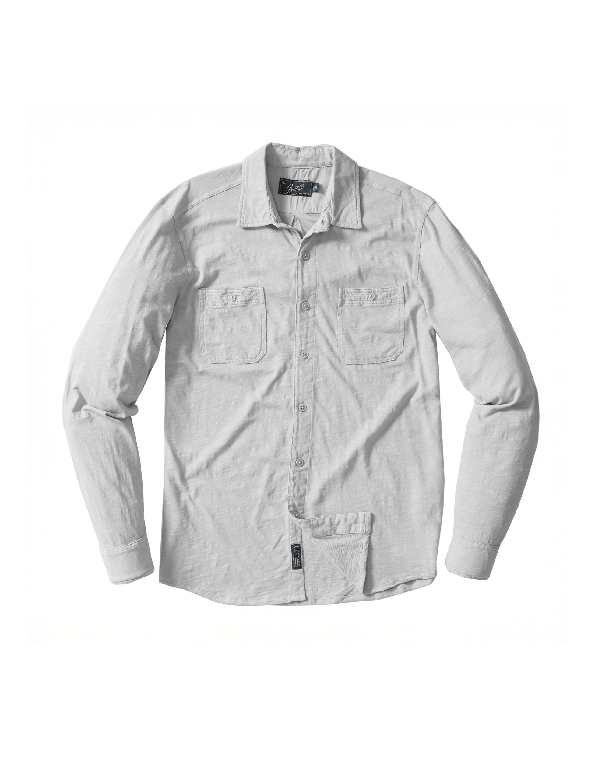 The comfort of a long sleeve tee shirt yet refined like a woven shirt. This hybrid shirt is made with finely spun slub cotton yarn, knit into a flexible jersey and finished with the details of a conventional casual shirt. Breathable, stretchable, with absolute softness. The Model is also wearing: Elevated Compact Jersey Jogger - Dark Navy Model: Chris is wearing size medium and is 6'. ----Details---- Spread collar Button front placket Two patch pockets Curved hem Button through sleeve cuffs Reinforced with tonal poplin in yoke, placket and gusset. Imported ----Materials---- 100% Cotton 32's singles fine cotton yarn ----Size & Fit---- Measuring Method: All measurements are in inches and based on a “flat” garment, as shown below. For comparison with one of your existing garments, please lay garment on a flat surface and follow the key measurement points. For chest and neck, if you double the flat measurement, you will get close to the full body measurement. ----Care---- Machine Wash Cold Separately Do Not Soak Before Washing Do Not Bleach Remove Promptly Tumble Dry Low Or Hang Dry In Shaded Area Cool Iron If Necessary
