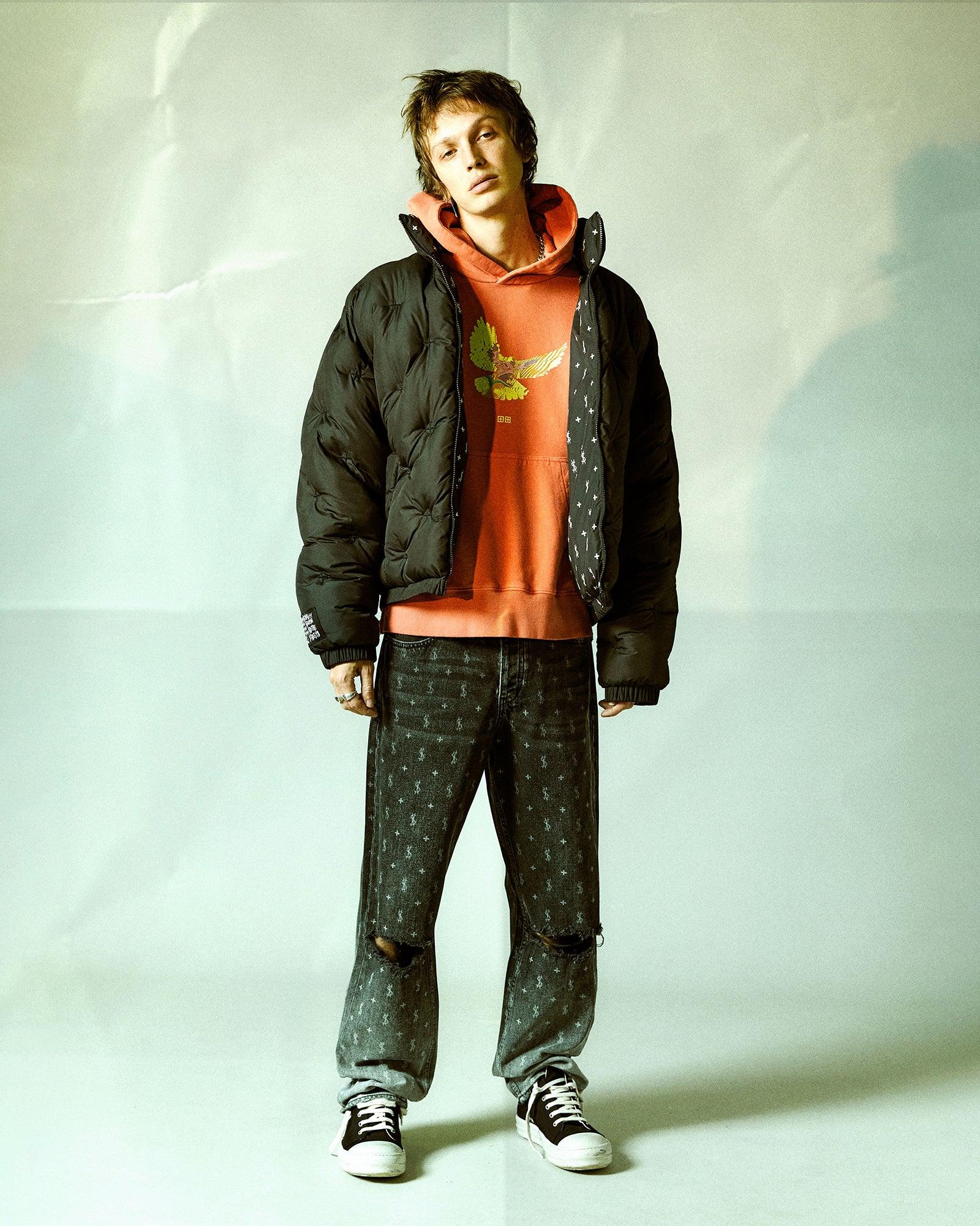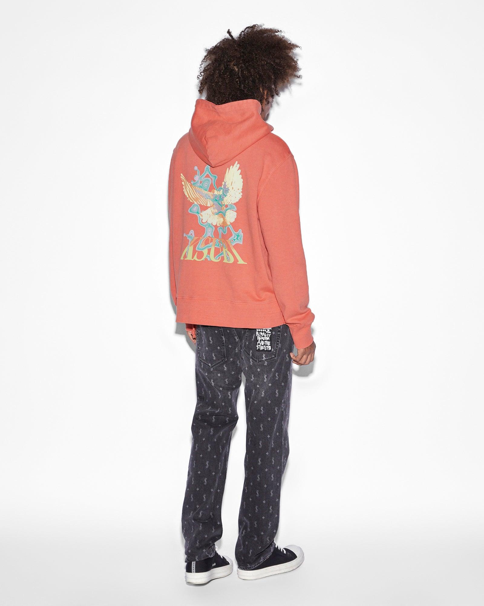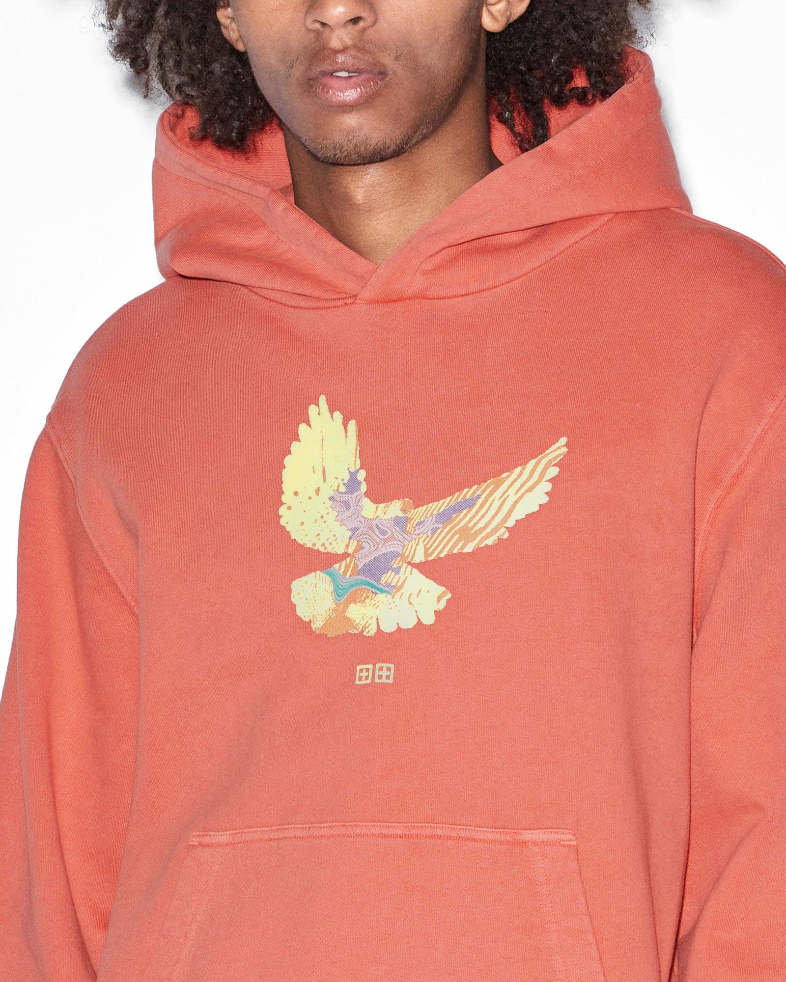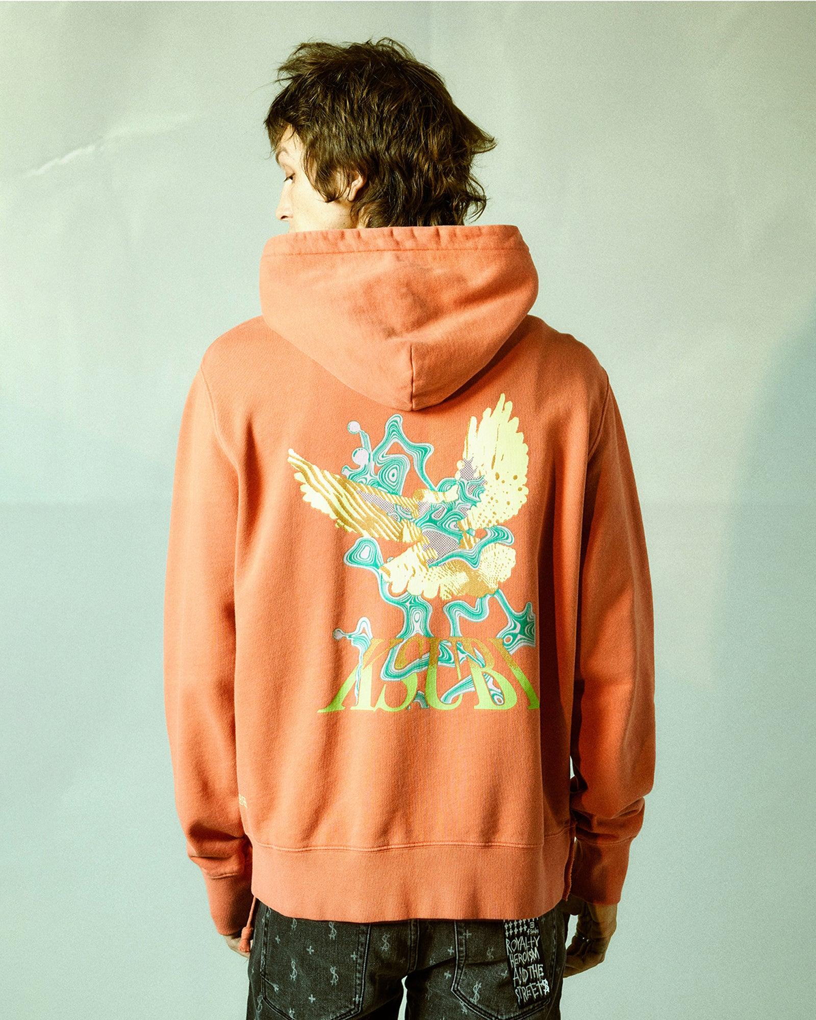 The Flight Kash Hoodie Torch is an age washed red fleece sweater made from a loopback cotton. This regular fit hoodie has an exaggerated rib height and signature rats tail at the hem. This style has an original artwork screen printed on the front and back with a signature t-box screen print on the back.