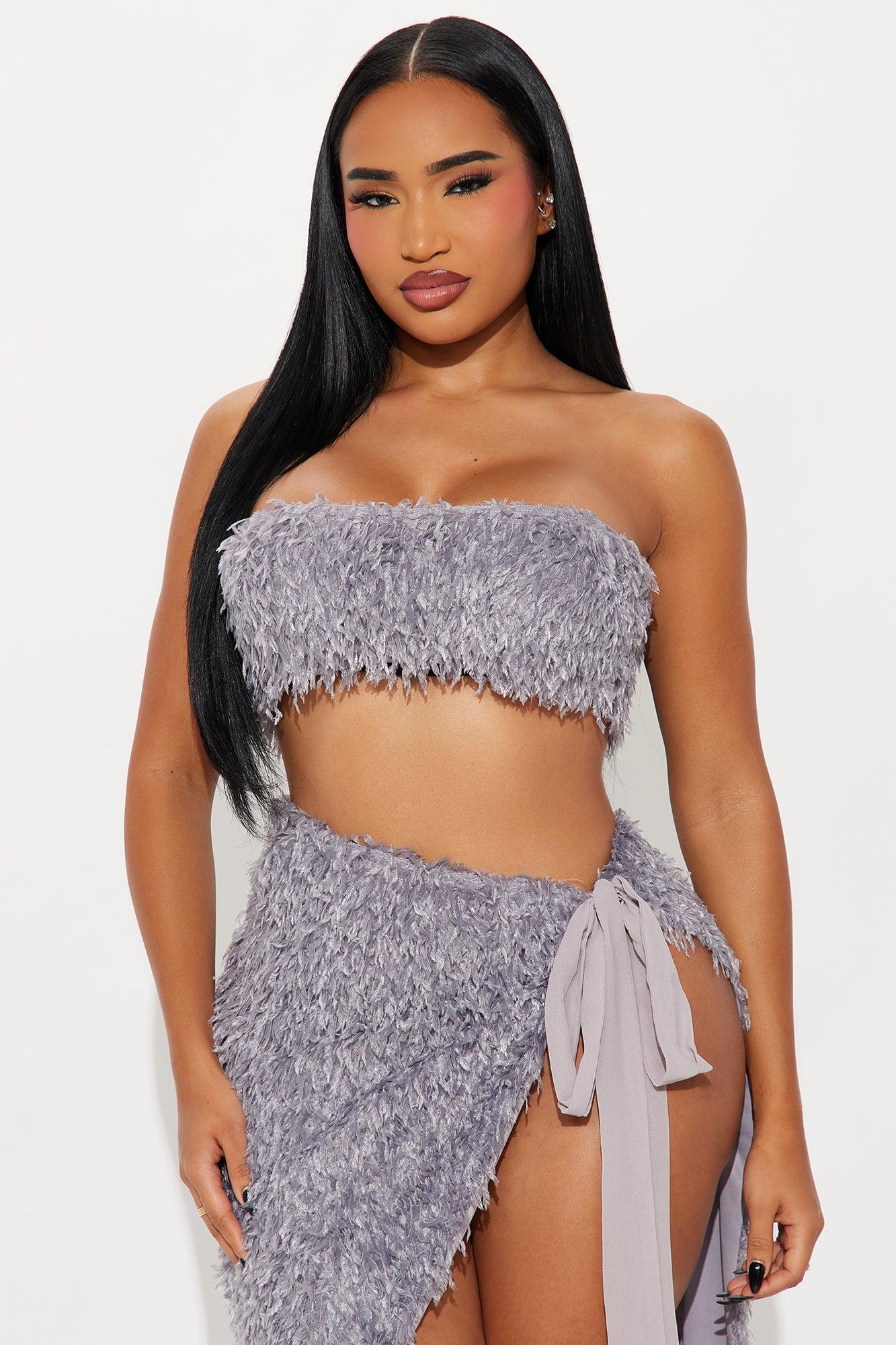 Available In Burgundy, Grey And Pink. 2 Piece Ensemble Strapless Top And Wrap Maxi Skirt Set Stretch Fully Lined Back Zipper On Top Side Tie Closure On Skirt Disclaimer: Feather Fall Out May Happen. Self : 100% Polyester Contrast: 100% Polyester Lining: 100% Polyester Imported