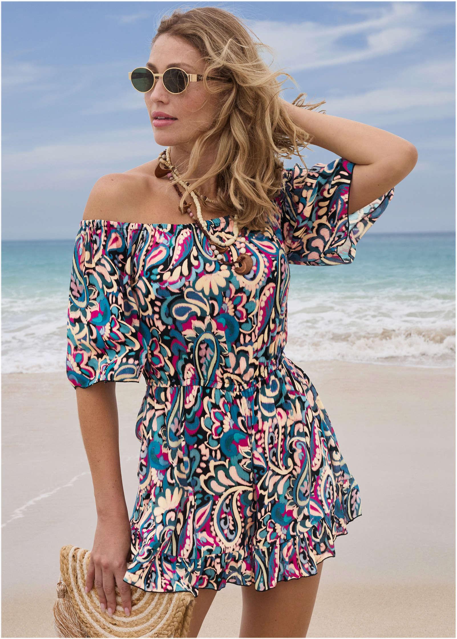 Beach day or date on the boardwalk? Either way, you're covered in this flirty romper. Show off your sun-kissed glow with an off-the-shoulder neckline and short, flowy shorts. Slide it on over your favorite VENUS swimsuit for daytime or add your favorite flats for a versatile look.