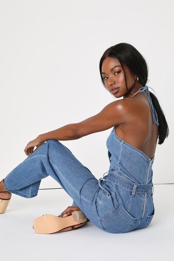 You're sure to be the cutest in any room with a revamped retro look like the Lulus Flirty Throwback Medium Wash Denim Surplice Halter Jumpsuit! Stretchy, medium wash denim shapes this super cute jumpsuit that has a surplice bodice with princess-seam details and a tying halter neckline. A high, fitted waist features belt loops and a matching sash belt, atop wide pant legs with diagonal front pockets and twin patch pockets at the back before ending at ankle-length hems. Back zipper/clasp.