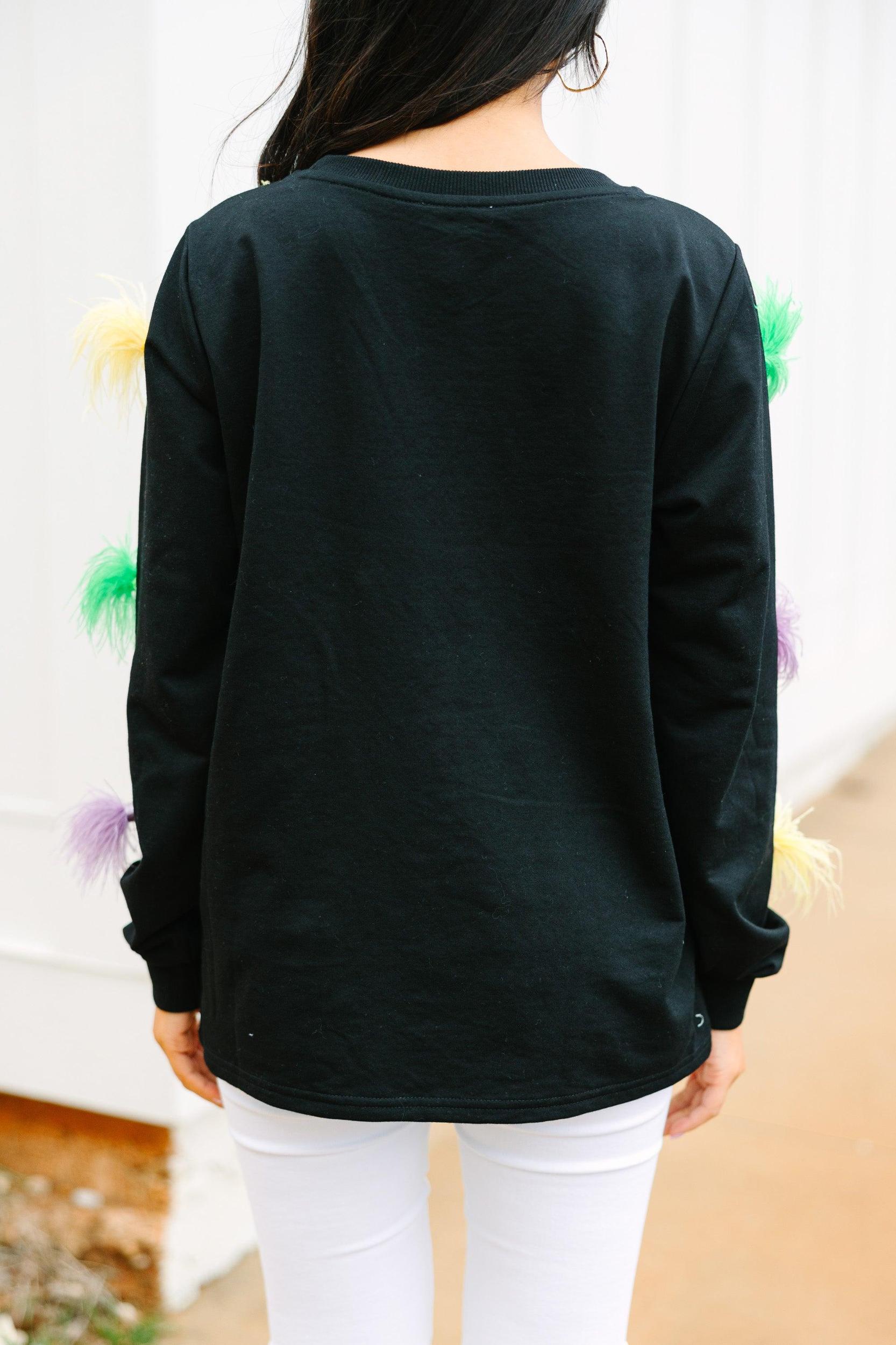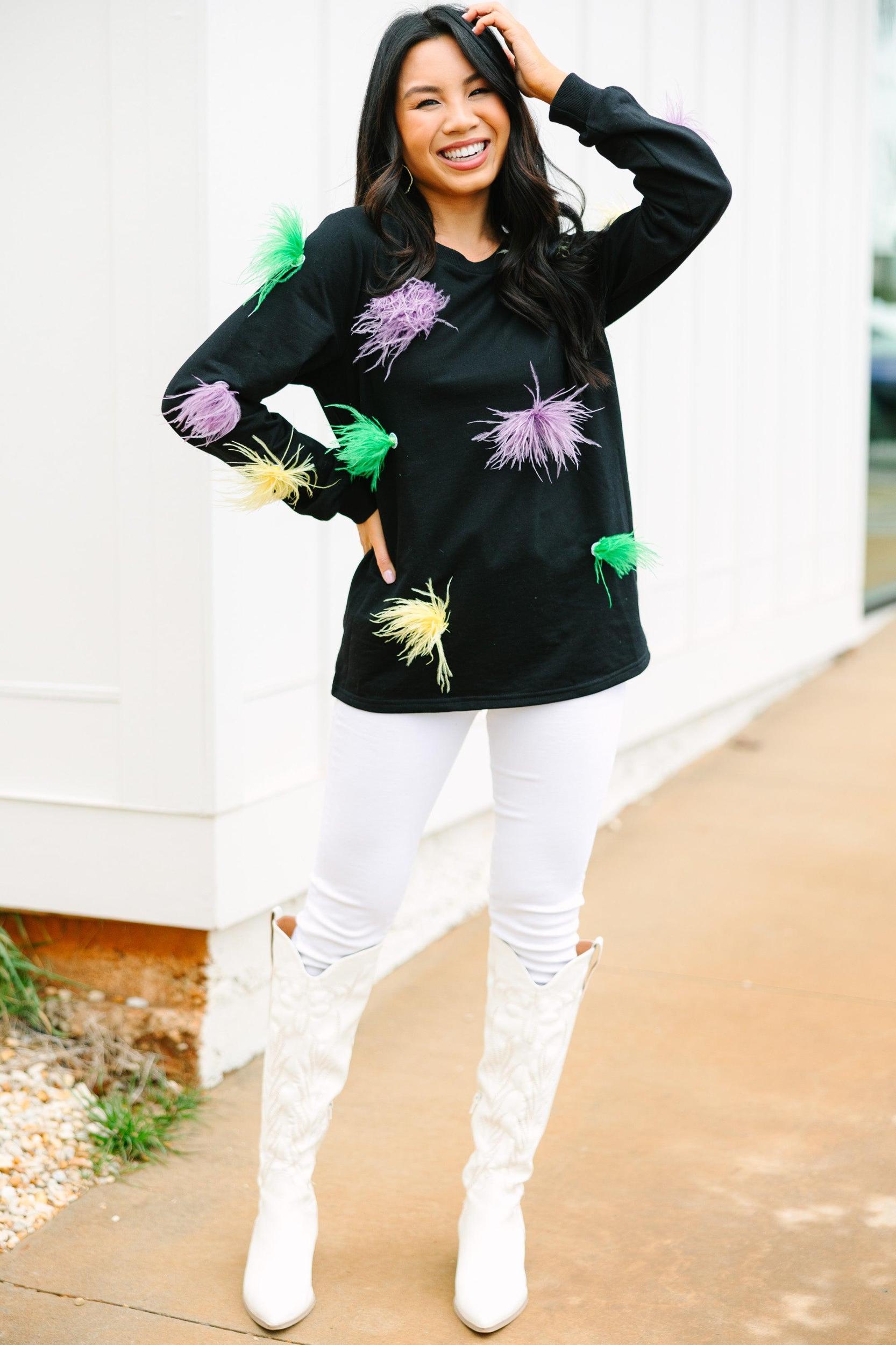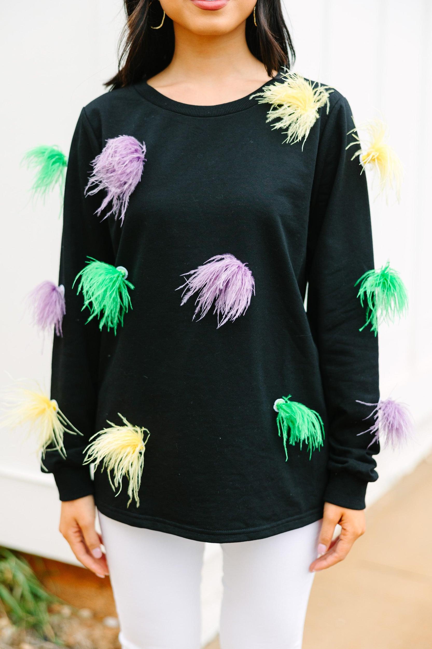 How much fun is this top?! Those feathers stand out beautifully on that dark background! Plus, they give this top all the movement you could ask for! This top will have you Mardi Gras ready in no time! This top features long sleeves, a round neckline, and feather detailing. Material has a generous amount of stretch.Cindy is wearing the small.