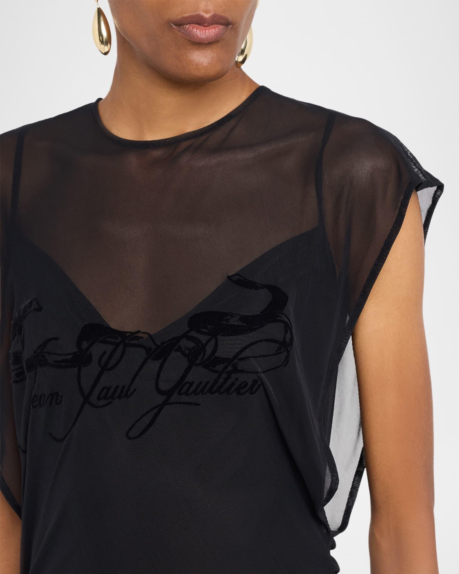 Jean Paul Gaultier mesh dress featuring a flocked tattoo logo on the chest, an open back, and a draped waist Round neckline; hook/keyhole back Sleeveless Body-conscious silhouette Full length Slipover style Nylon/polyamide/elastane Made in Portugal