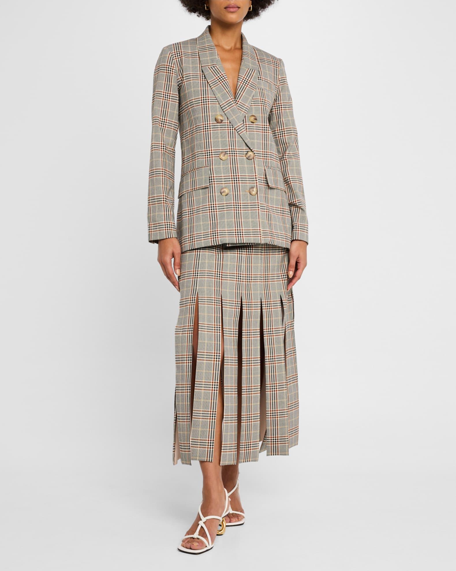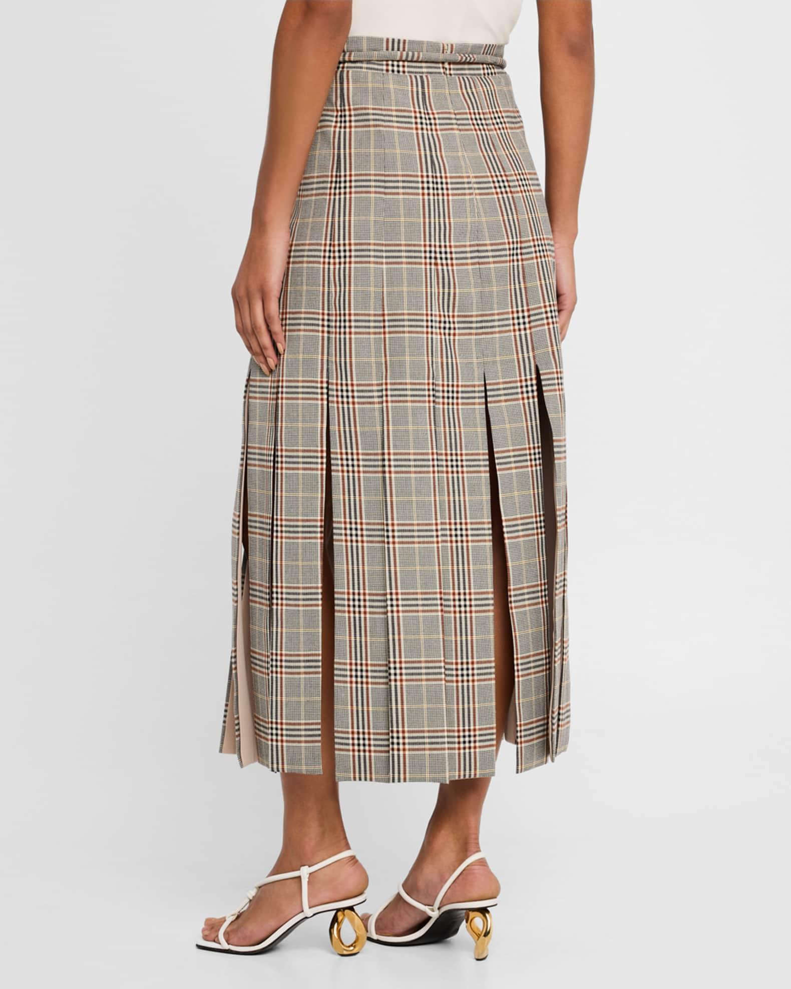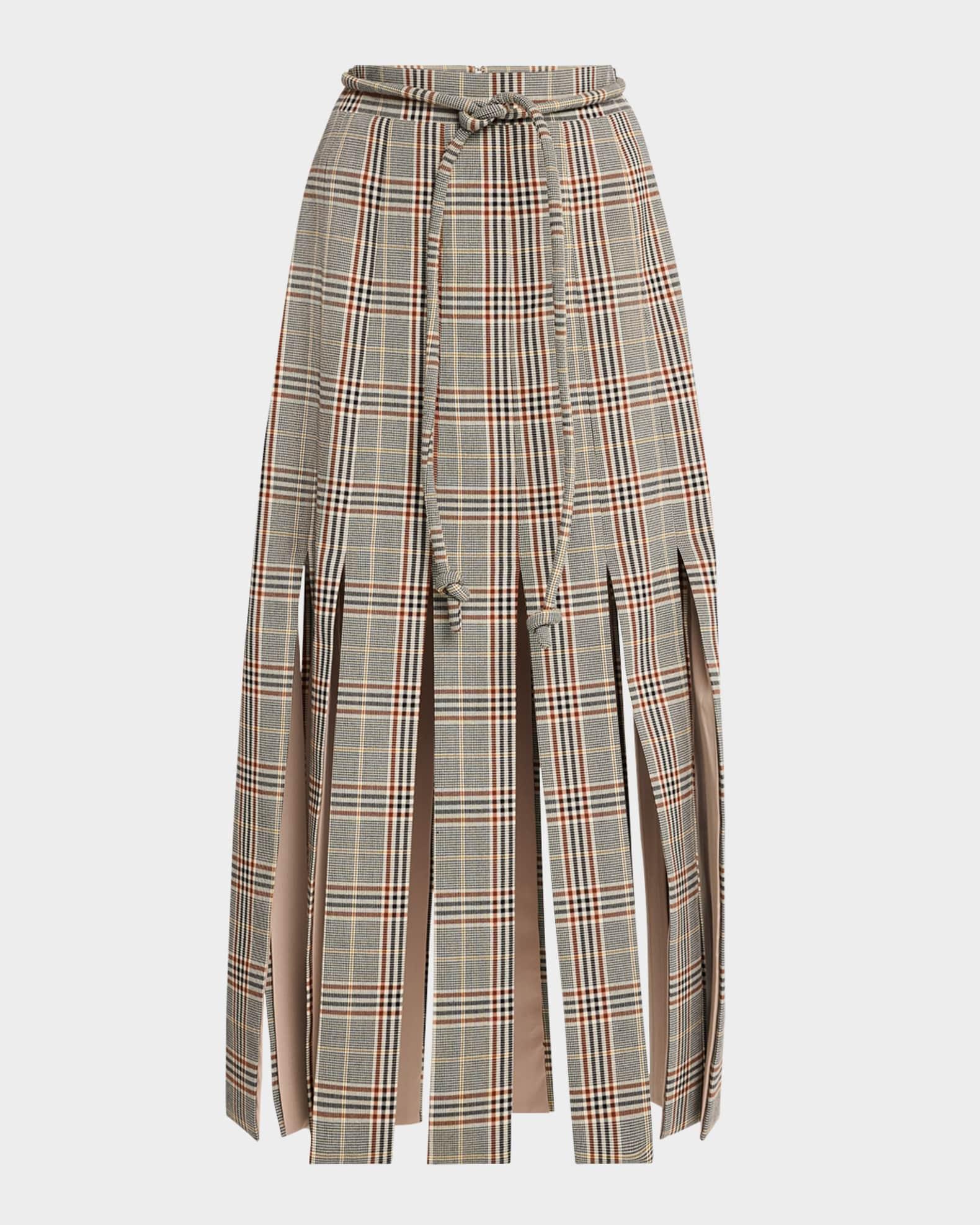 No Pise La Grama "Flora" plaid wool-blend maxi skirt featuring a split hem High rise Self-tie belt A-line silhouette Full length Invisible back zip Cotton/wool Made in Colombia Model is 5'10"/177cm.