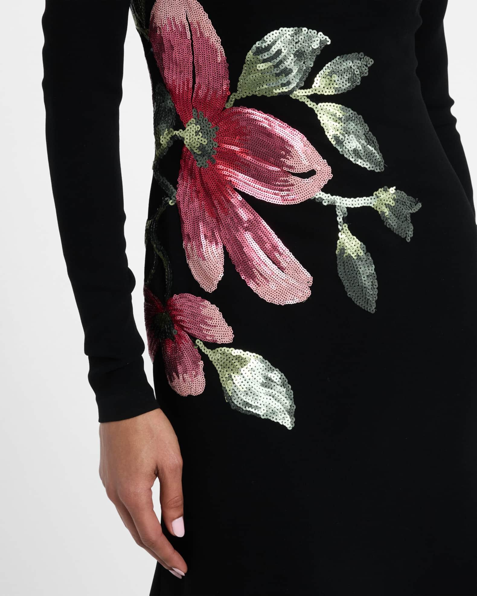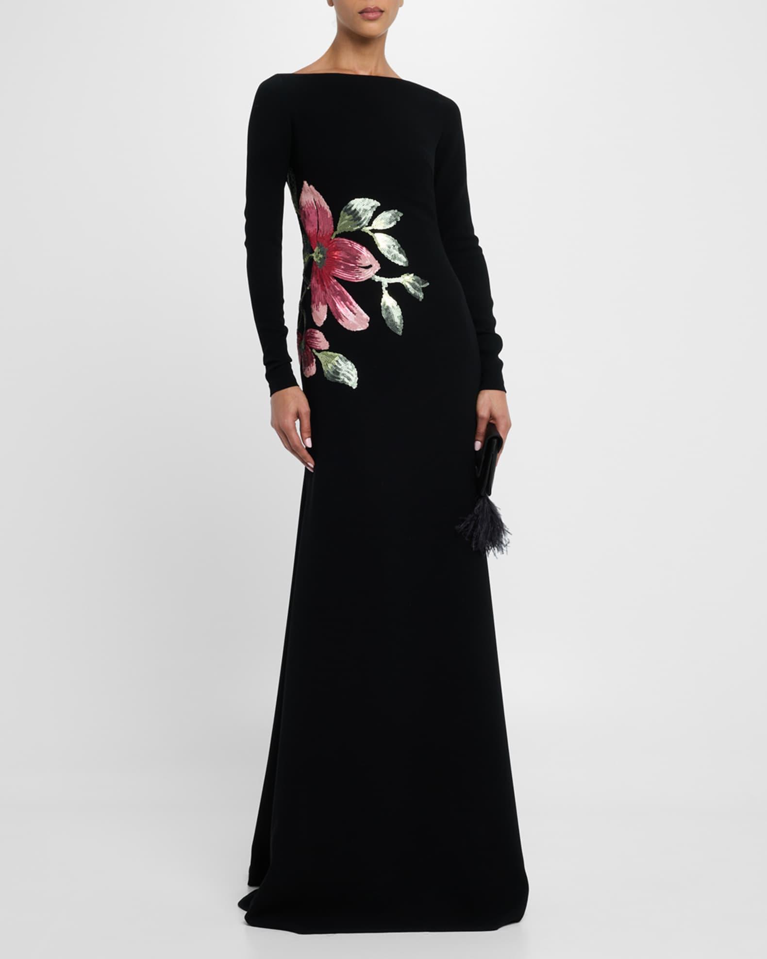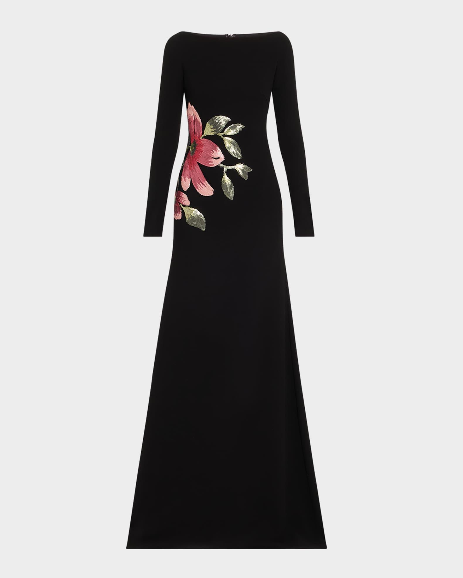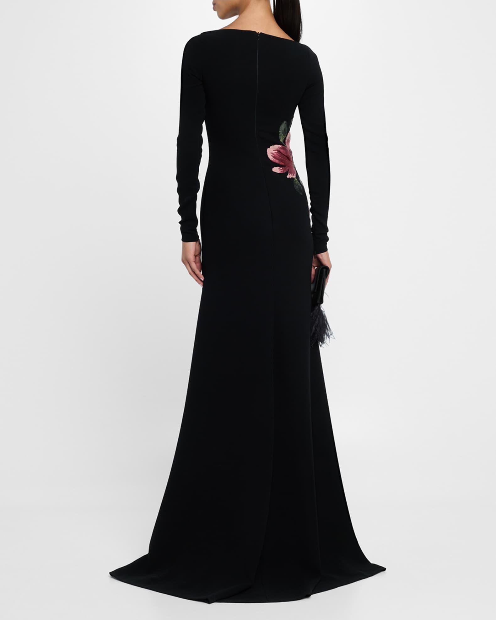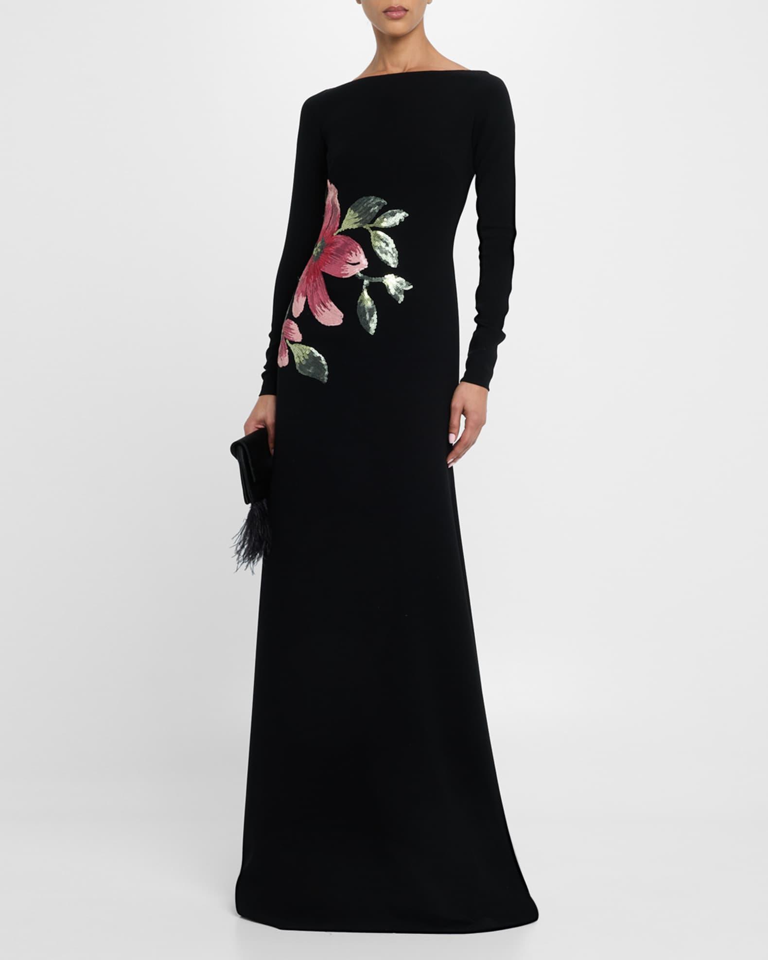 Floral Beaded Crepe Long-Sleeve Trumpet Gown