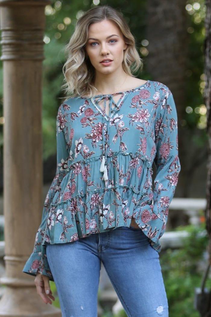 This Floral bell sleeve presents a fashion-forward look with its floral embellishments. It boasts a front neck tie to complete the ensemble. Fabric 100% rayon