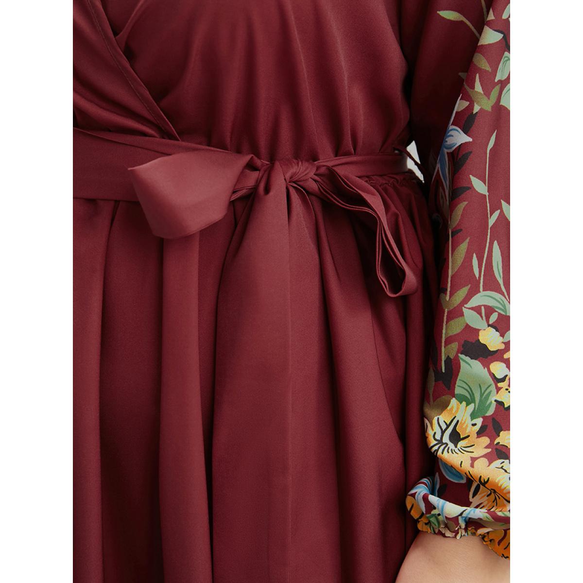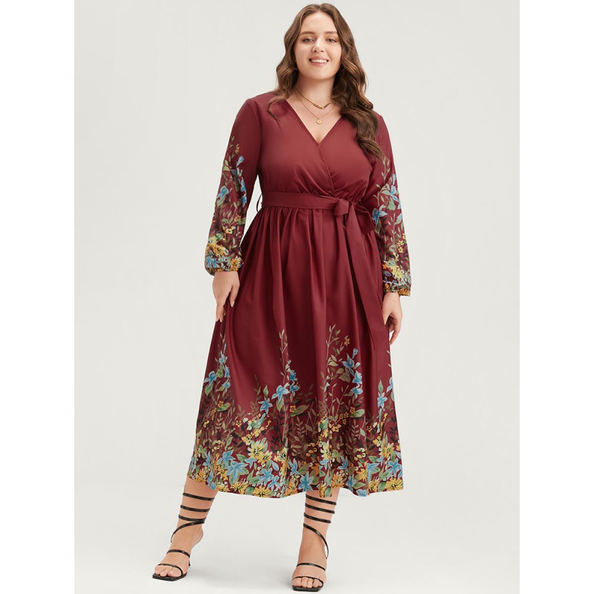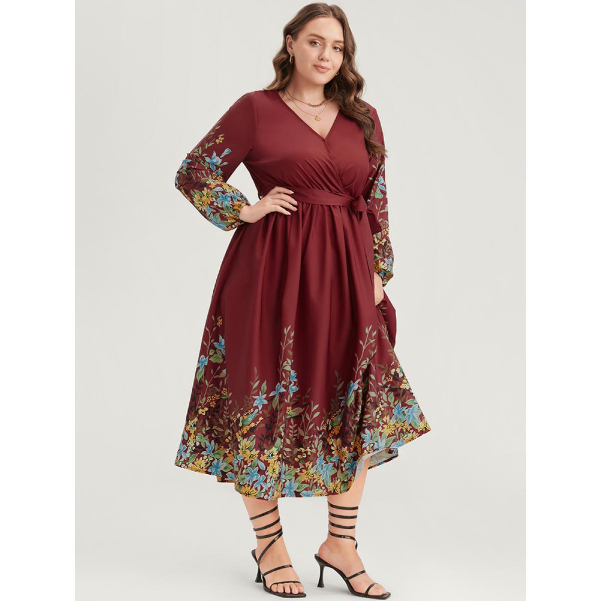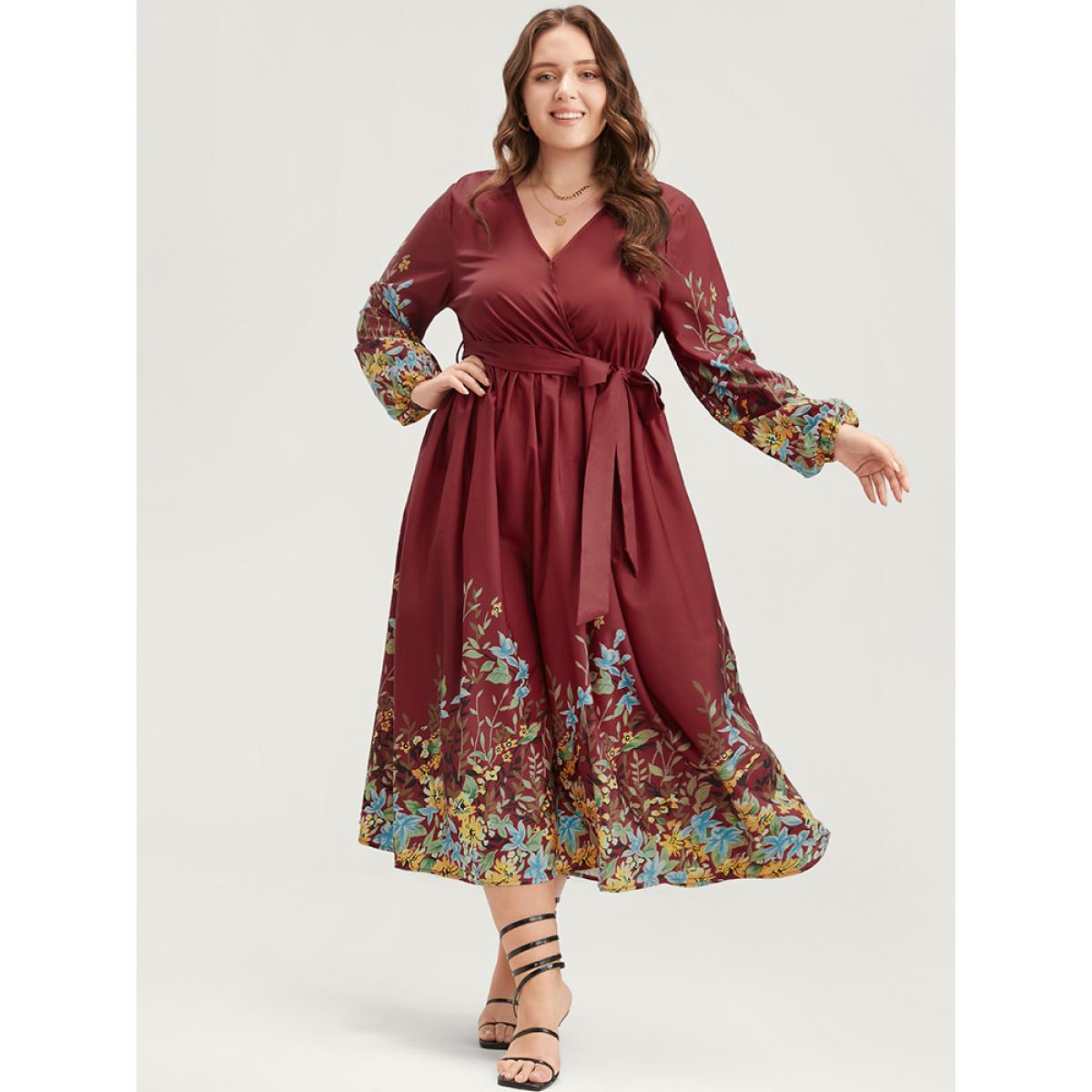 Floral Belt Boho Plus Size Women Vacation Dress Bohemian Print Scarlet Printed Lantern Sleeve Long Sleeve V Neck Dailywear Midi Dress Dresses BloomChic