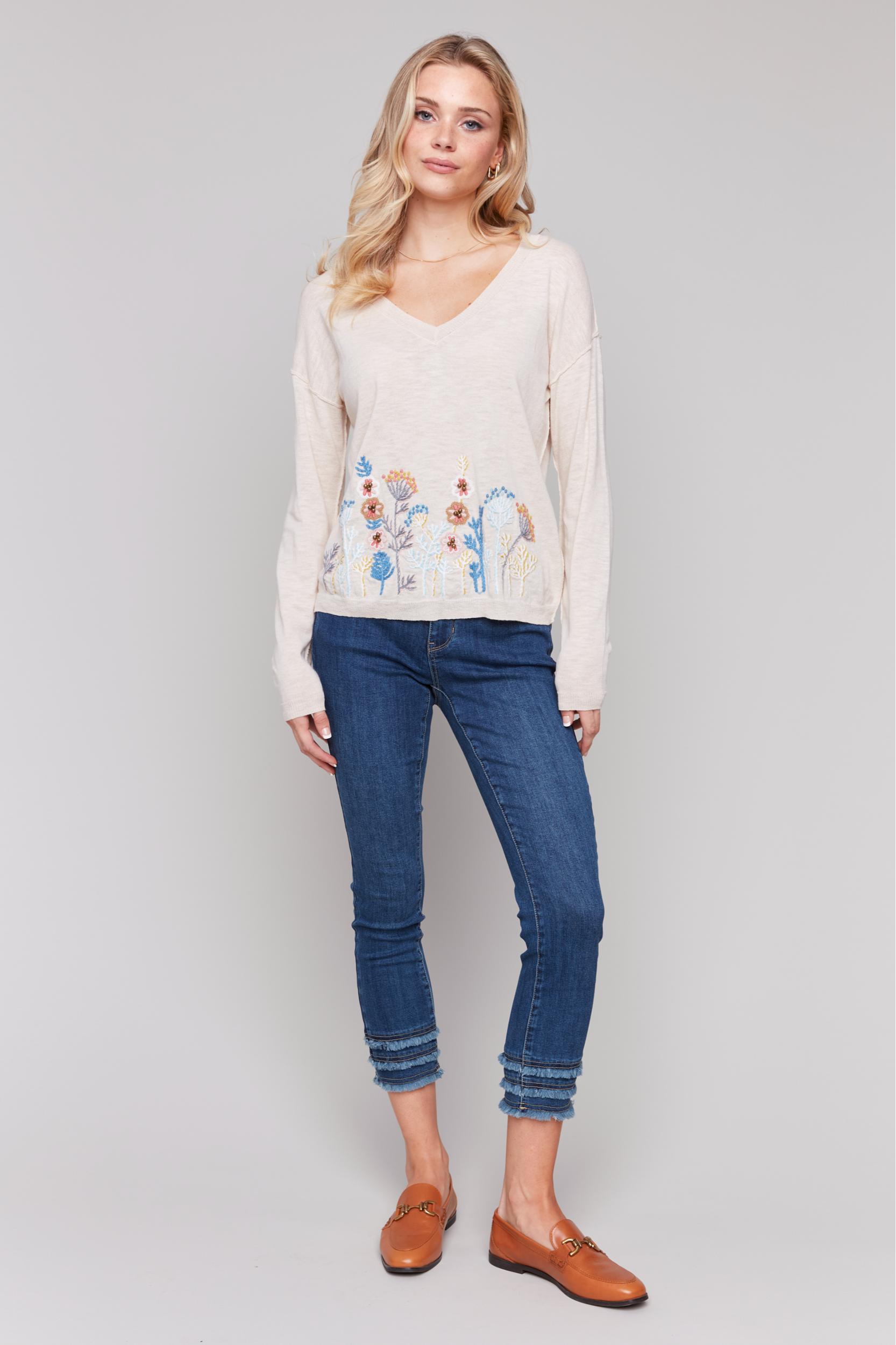 Slip into this charming cotton sweater, perfect for adding a playful touch to your style. Featuring delicate floral embroidery and a comfortable fit, it’s ideal for cooler spring and summer days. The lightweight fabric ensures optimal comfort, while the elegant V-neckline adds a feminine touch.