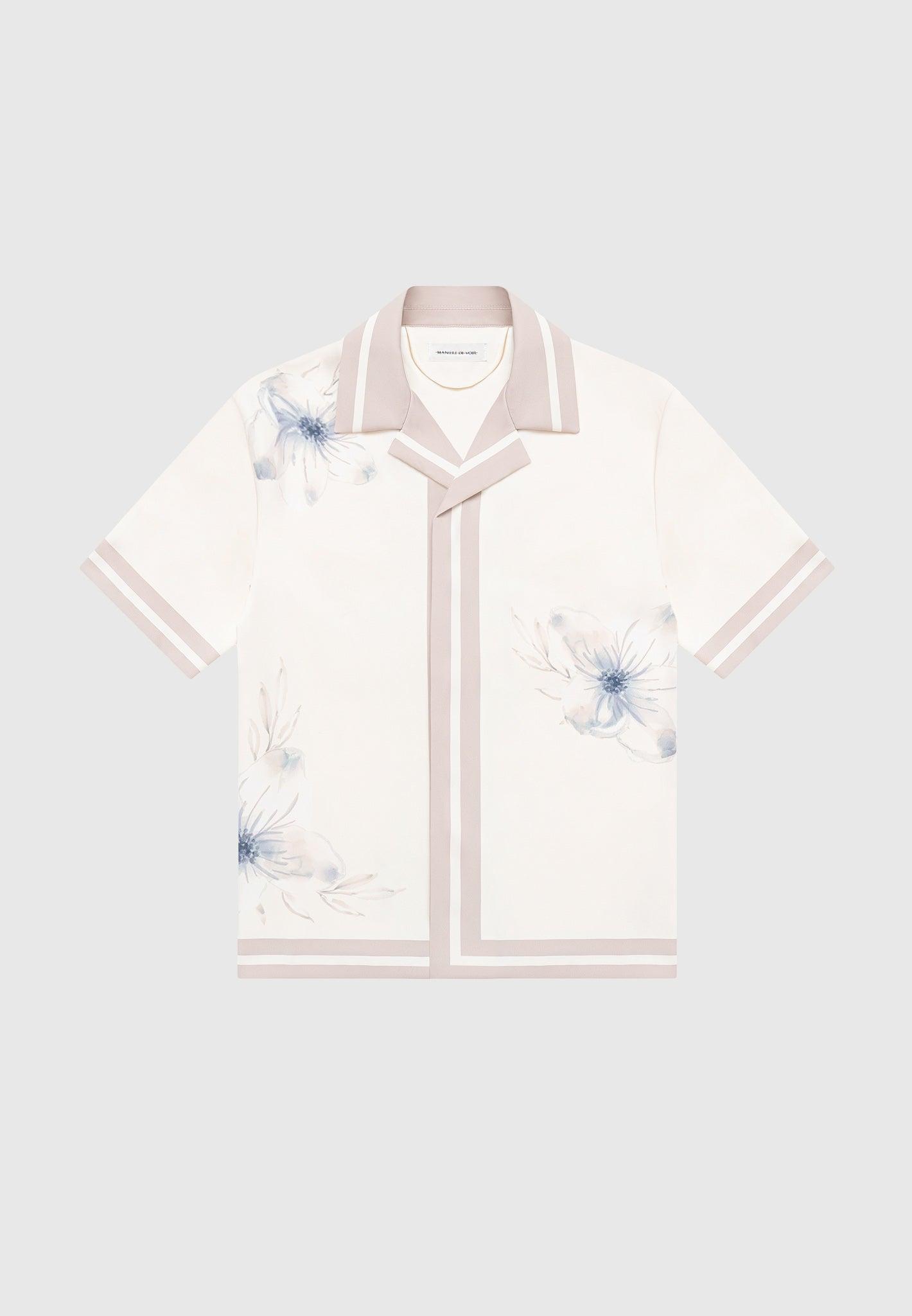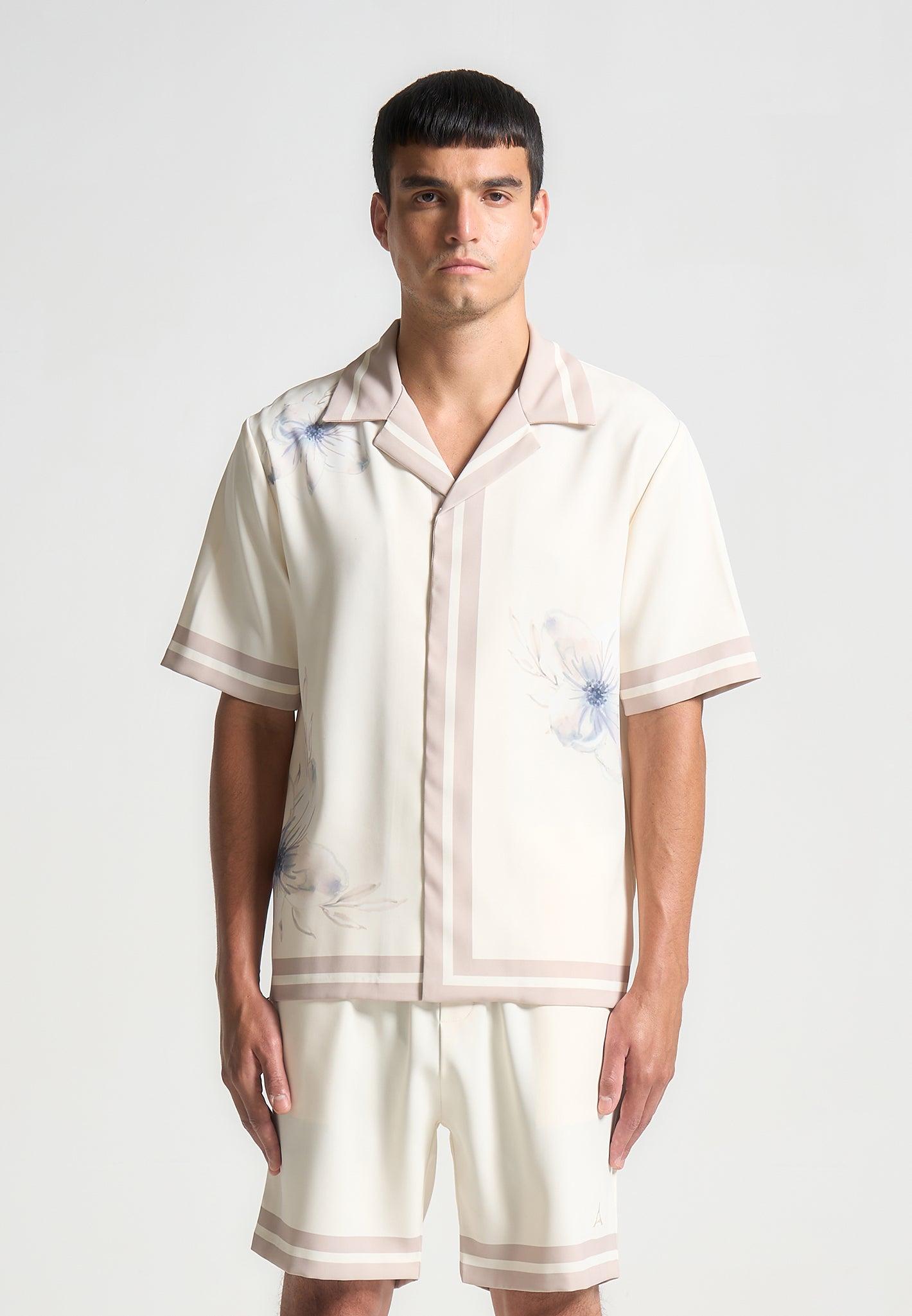 Impeccably tailored from an opulent, satin-finish fabric, our Floral Eiffel Shirt in Cream exudes timeless sophistication. Enhanced with a striking contrast collar and hem, it presents a modern twist on the classic floral print, marrying refinement with contemporary style. Elevate your sartorial repertoire with this essential shirt, perfect for any casual or smart casual occassion this season. Fabric: Always check the care label for wash instructions. Model is 6'0", 40" Chest, 30" Waist and Wears Size Medium Based On Size M - Front Length cm/in, Chest cm/in, Sleeve Length cm/in Stretch Factor - /3