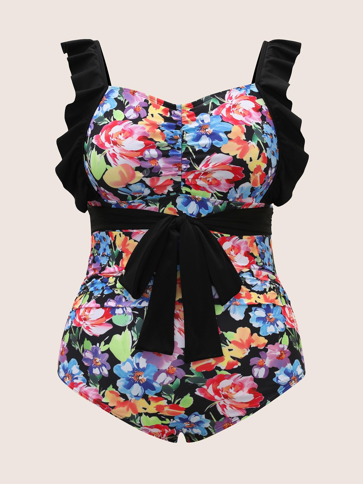 Shop Floral Contrast Tie Knot Ruffle Trim One Piece Swimsuit now and redefine your style with confidence at BloomChic. Tailored for mid and plus-size women. This trendy Swimwear Women, sizes 10-30. Season:Summer;Color:Black;Style:Beach;Cup Type:Removable cups;Waist Design:High Rise;Neckline:Heart neckline;Sleeve Type:Sleeveless;Pattern Type:Natural Flowers;Prints:Floral;Details:Tie knot, Patchwork, Gathered, Ruffles;Pocket:No-pocket;Belt:No-belt;Chest pad:Removable Padding;Lining:Lining;Closure Type:Non