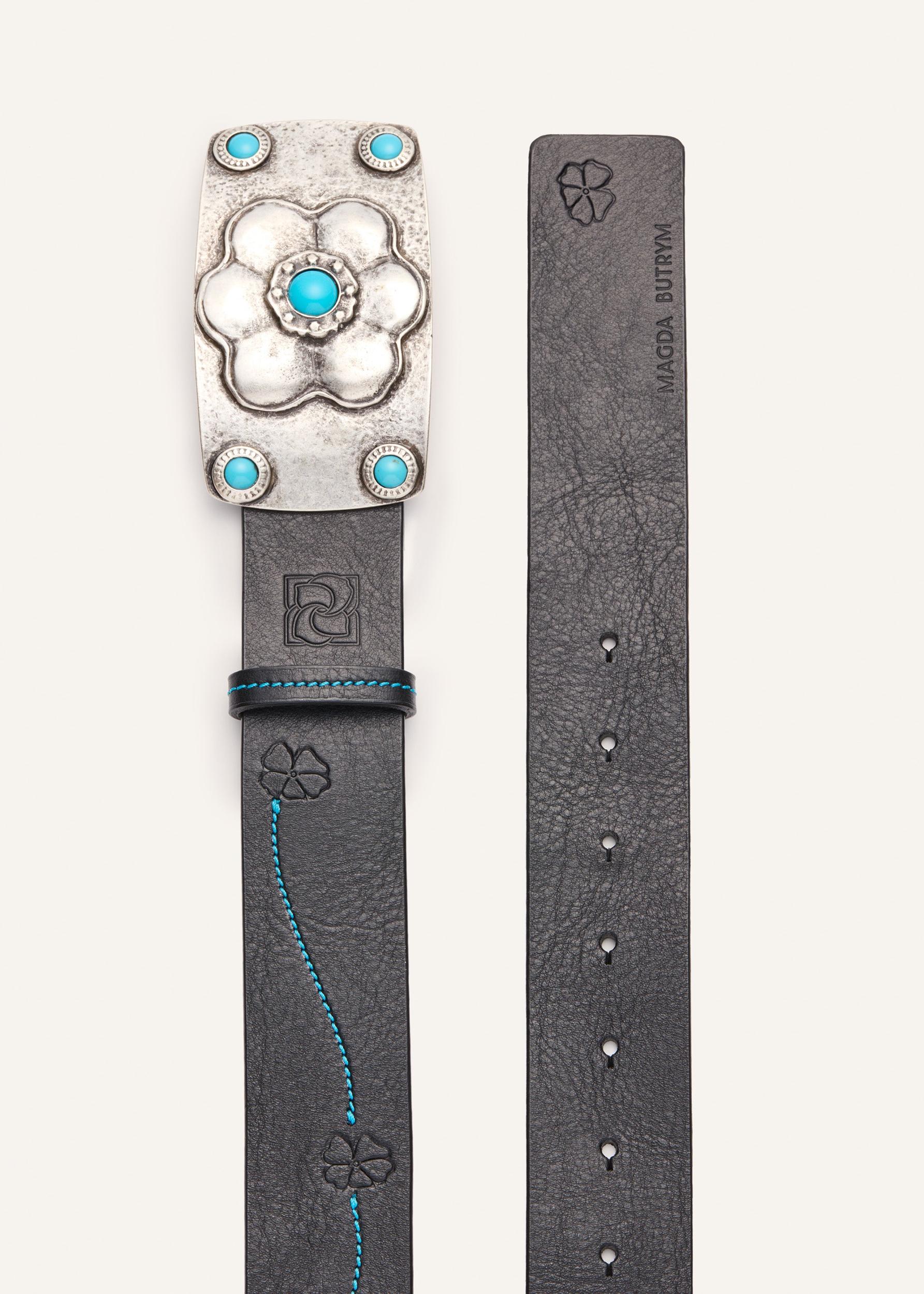 This black leather belt features a bold silver-tone buckle with a floral motif, accented by vibrant turquoise stones. The strap is detailed with subtle floral embossing and turquoise stitching, adding a unique artisanal touch to this Western-inspired design.