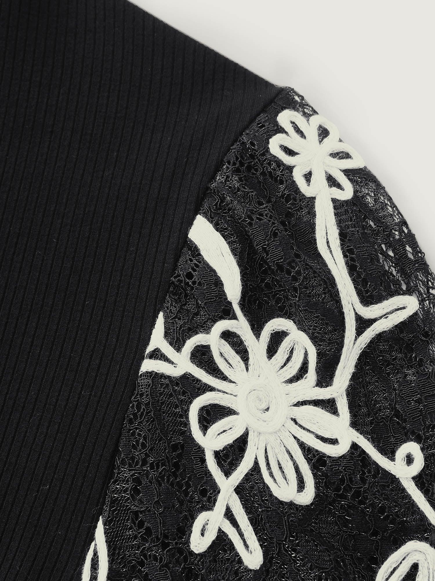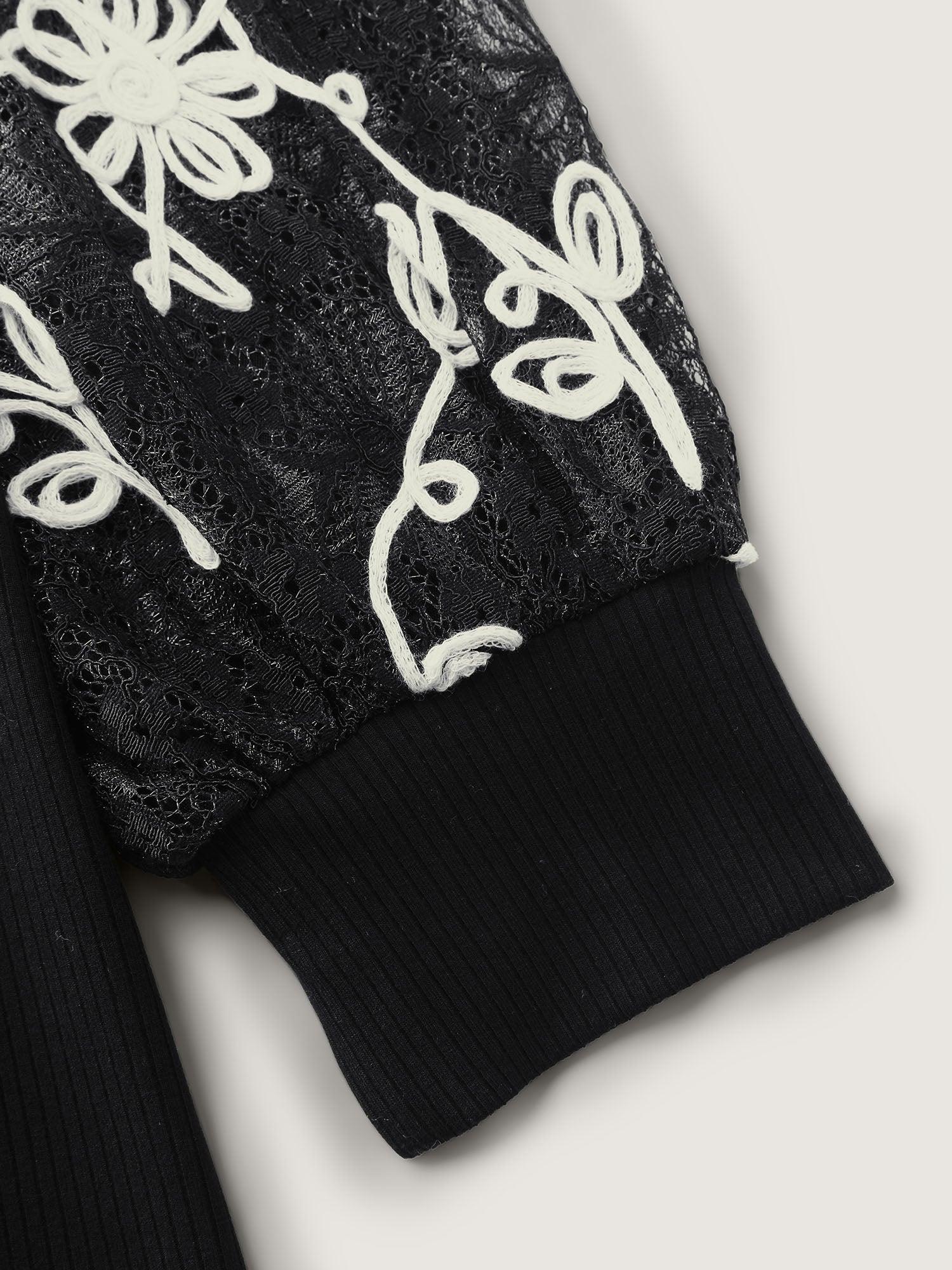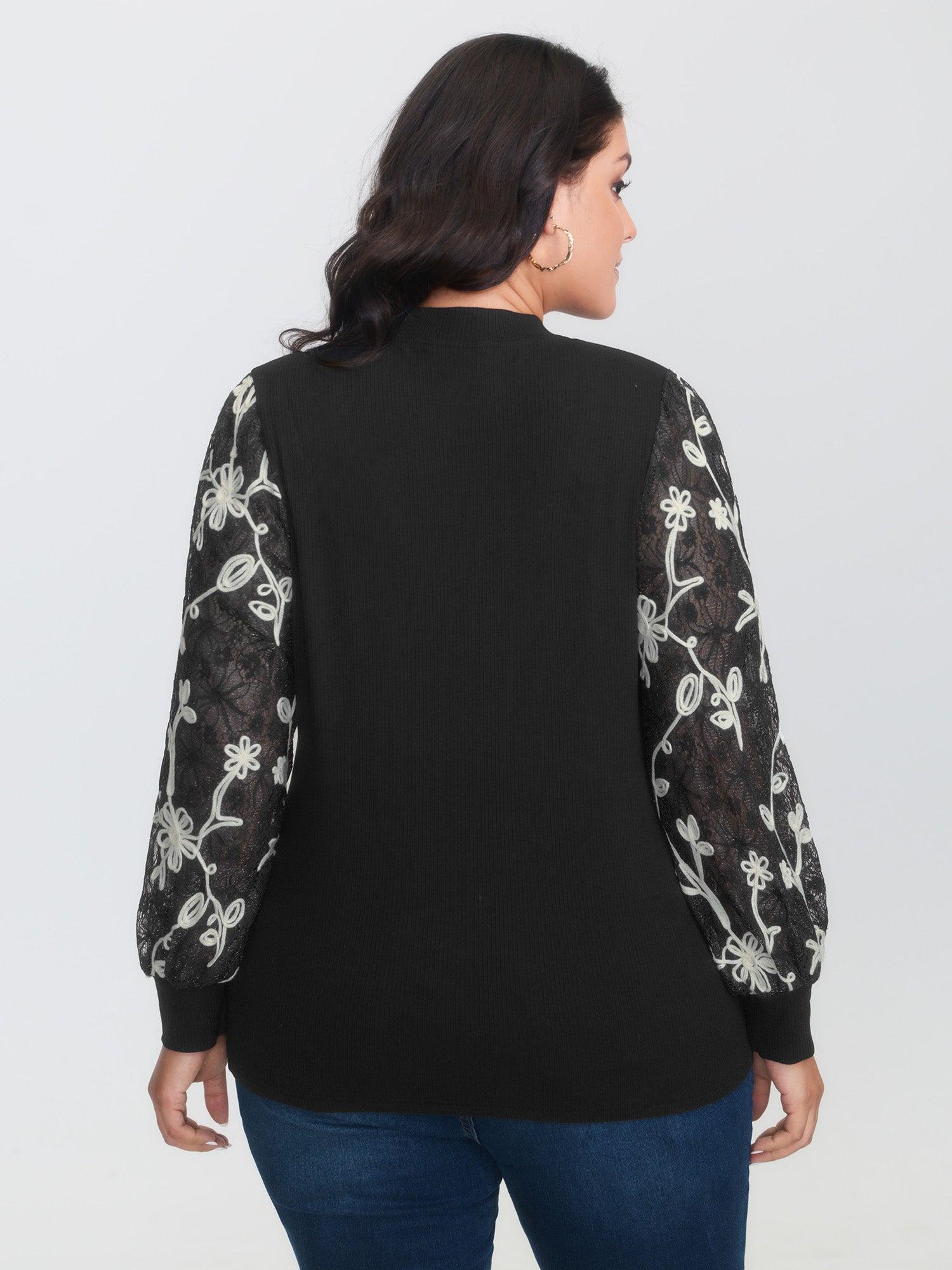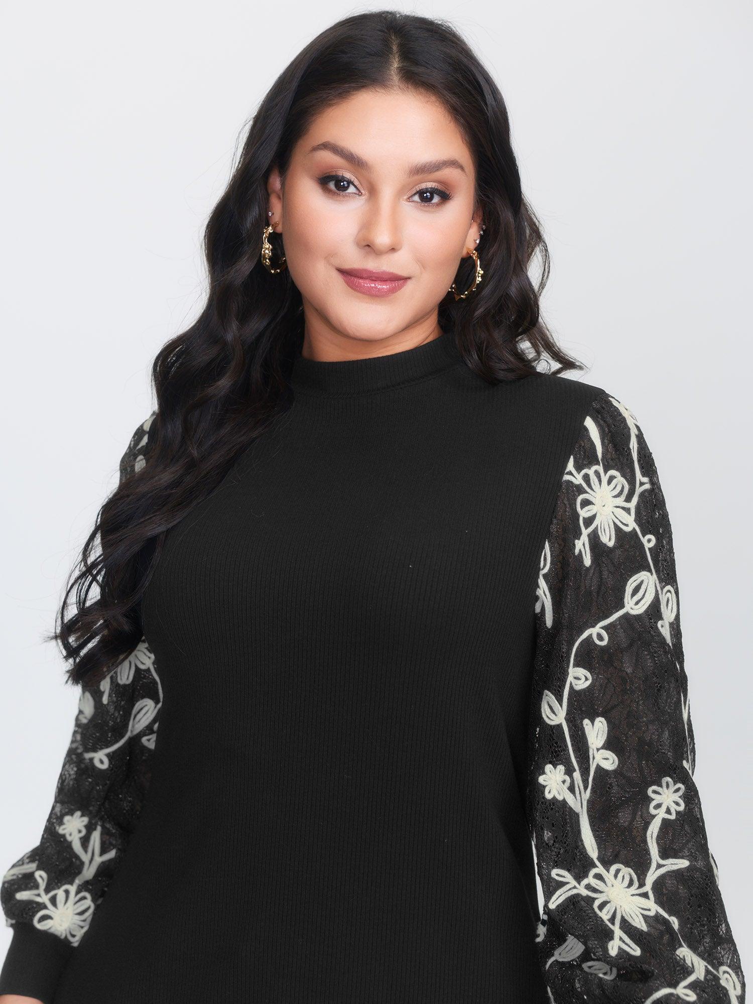 Shop Floral Embroidered Lace Mock Neck Knit Top now and redefine your style with confidence at BloomChic. Tailored for mid and plus-size women. This trendy Tops Women, sizes 10-30. Color:Black;Style:Timeless;Prints:Synthetic texture;Neckline:Stand-up collar;Sleeve Type:Lantern Sleeve;Details:Texture, Contrast, Patchwork;Pocket:No-pocket