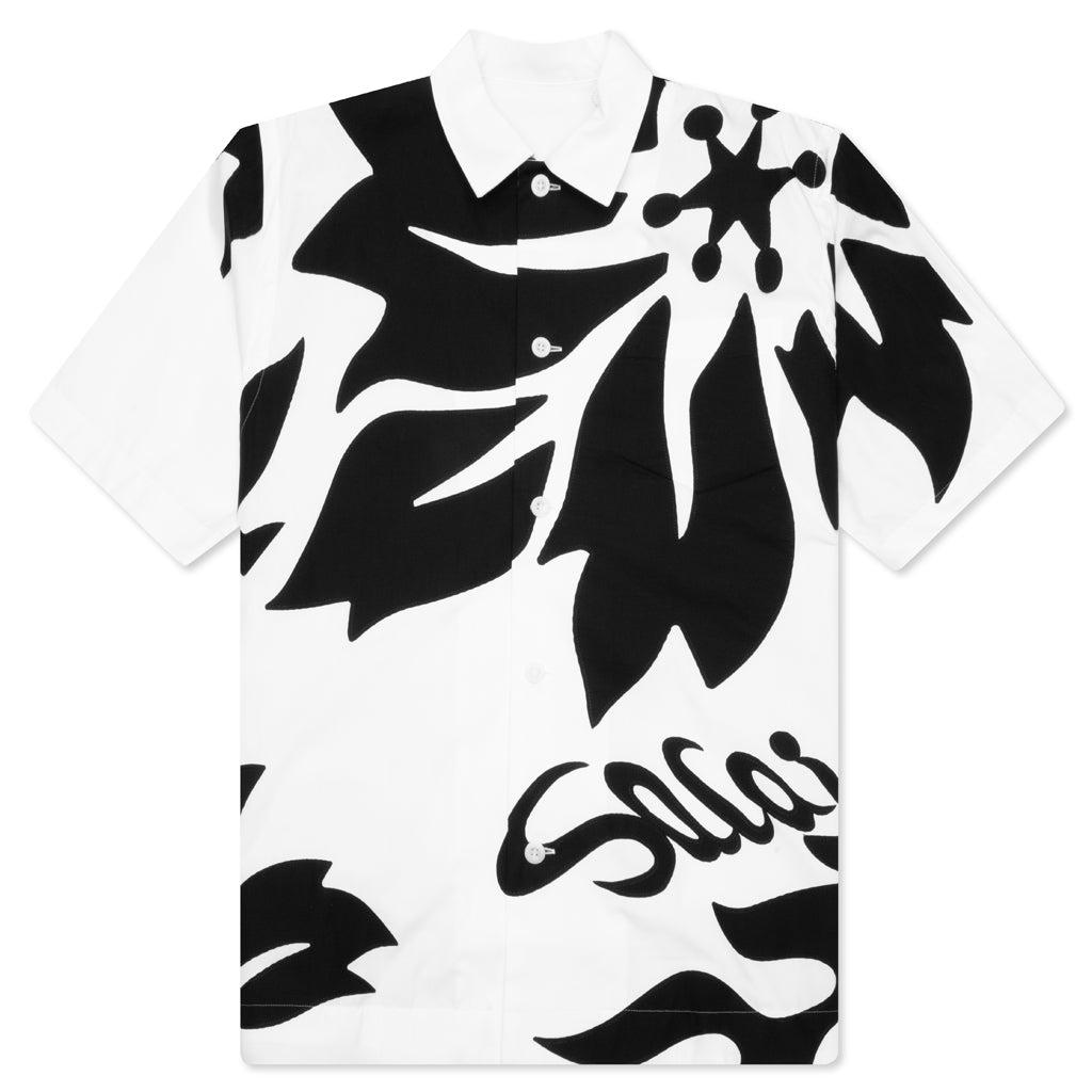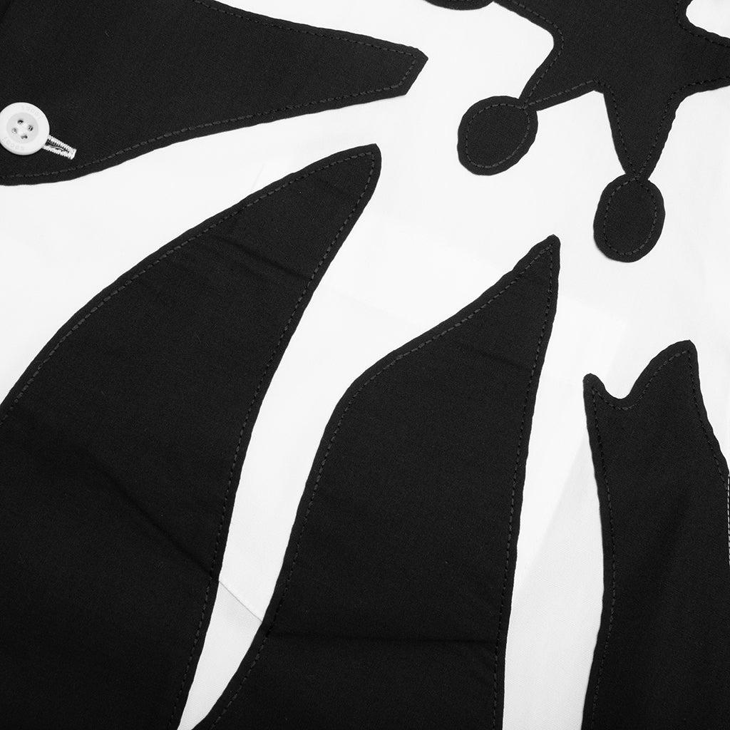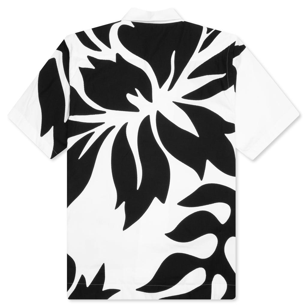 Waist-length plain woven shirt made from a polyester and cotton blend with floral appliqués throughout. Made with a longer length short sleeve, the shirt is flattering with a droptail hem and vented side seams Spread collar Button closure Logo appliqué at front Style No: 24-03282M-152