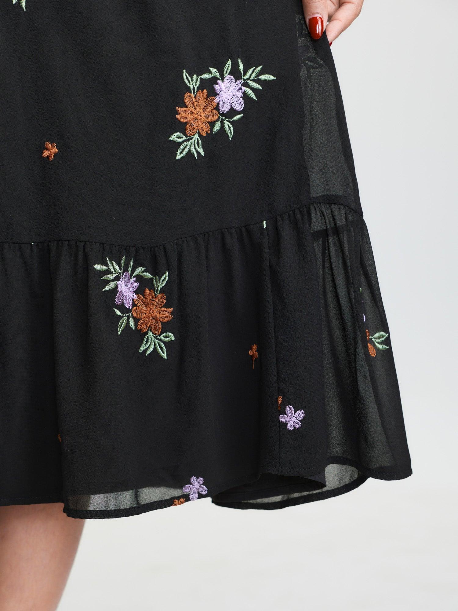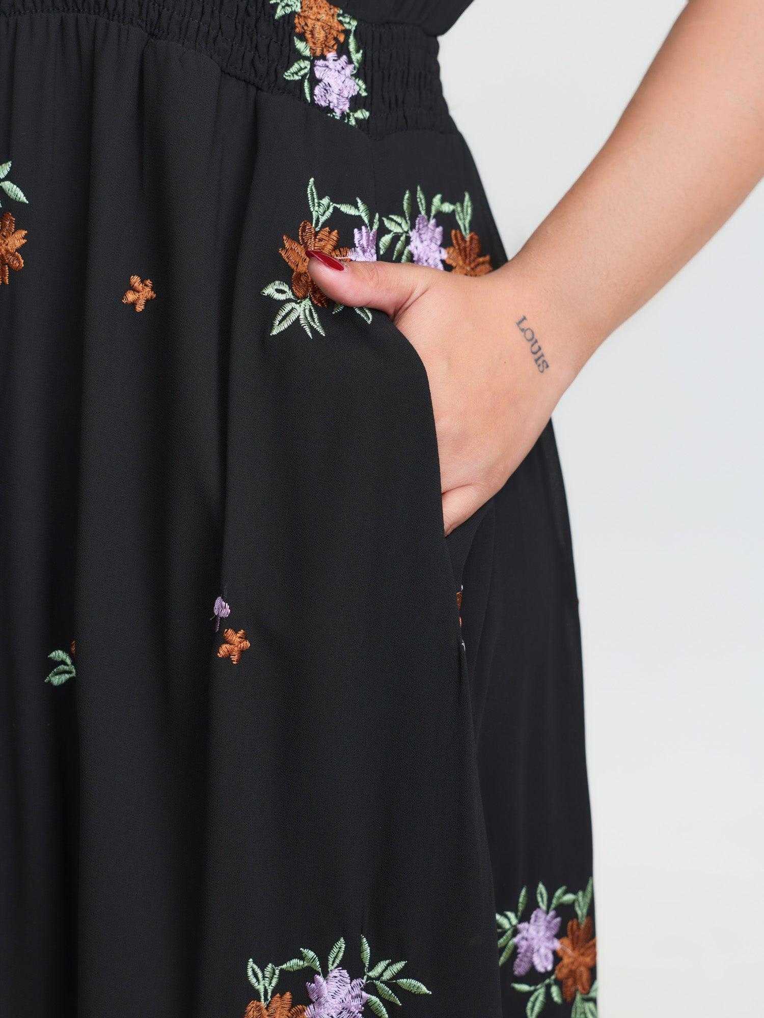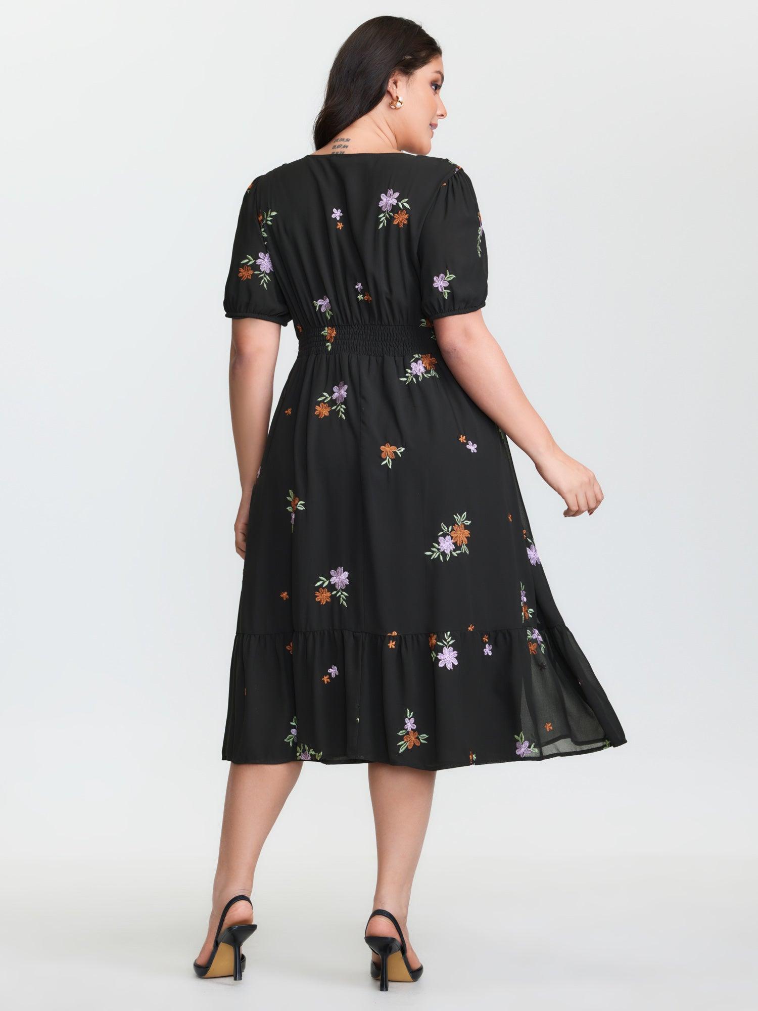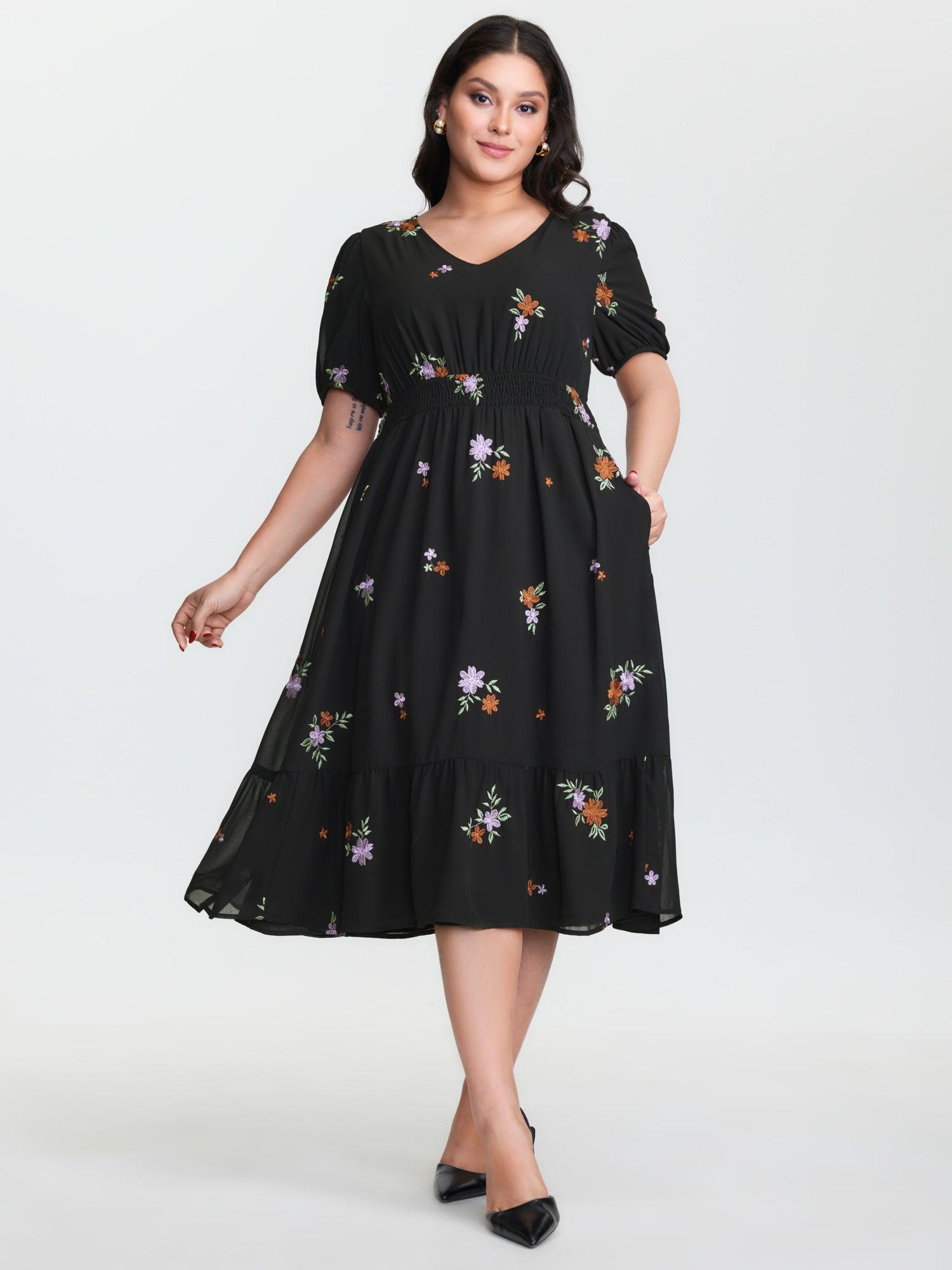 Shop Floral Embroidered Shirred Waist Midi Dress now and redefine your style with confidence at BloomChic. Tailored for mid and plus-size women. This trendy Dress, sizes 10-30. You can never go wrong with BloomChic Dresses. Color:Black;Style:Timeless;Neckline:V-neck;Sleeve Type:Elastic cuff;Prints:Synthetic texture;Details:See through, Gathered, Texture, Shirred;Pocket:Side seam pocket;Belt:No-belt;Closure Type:Non