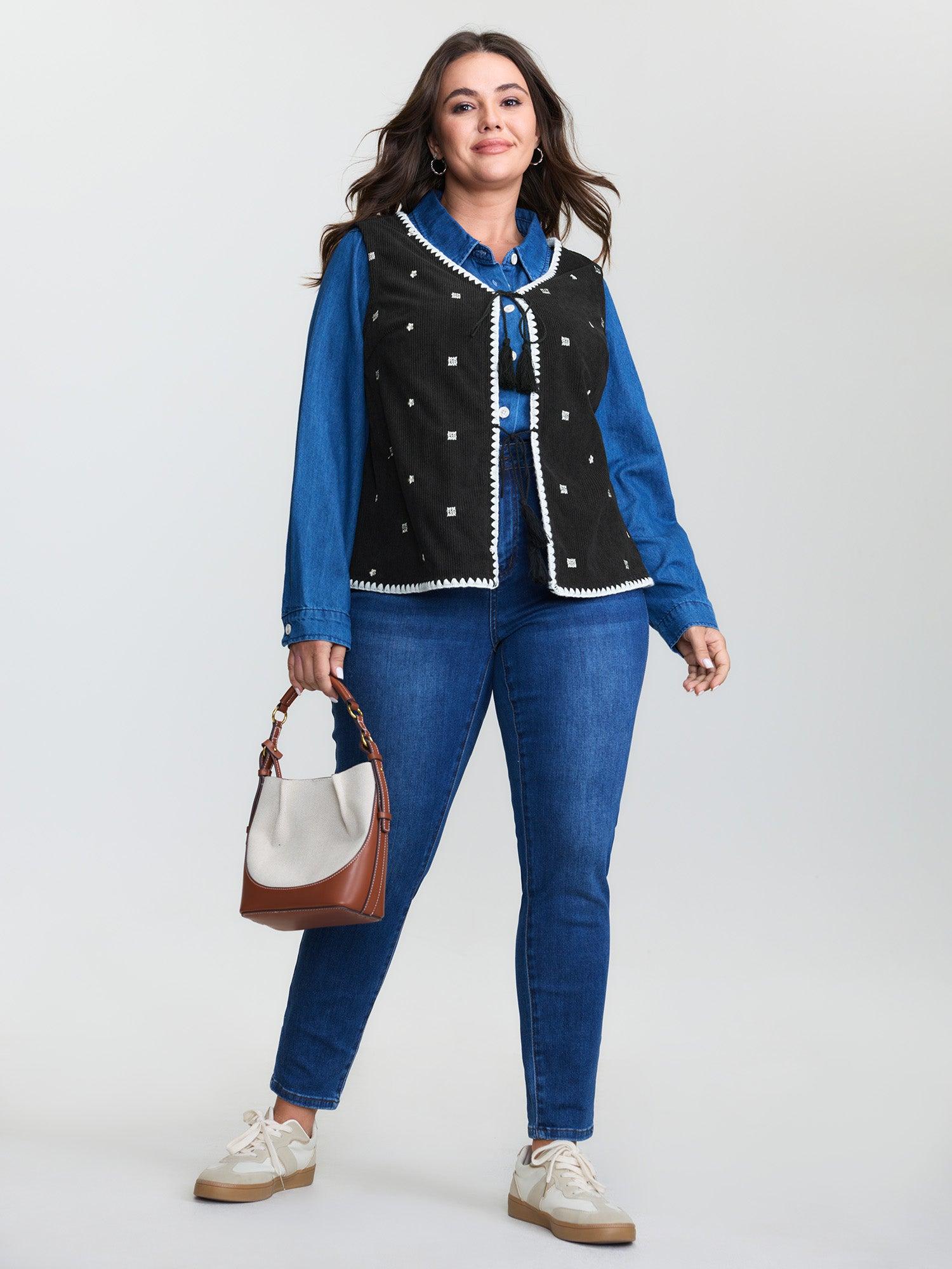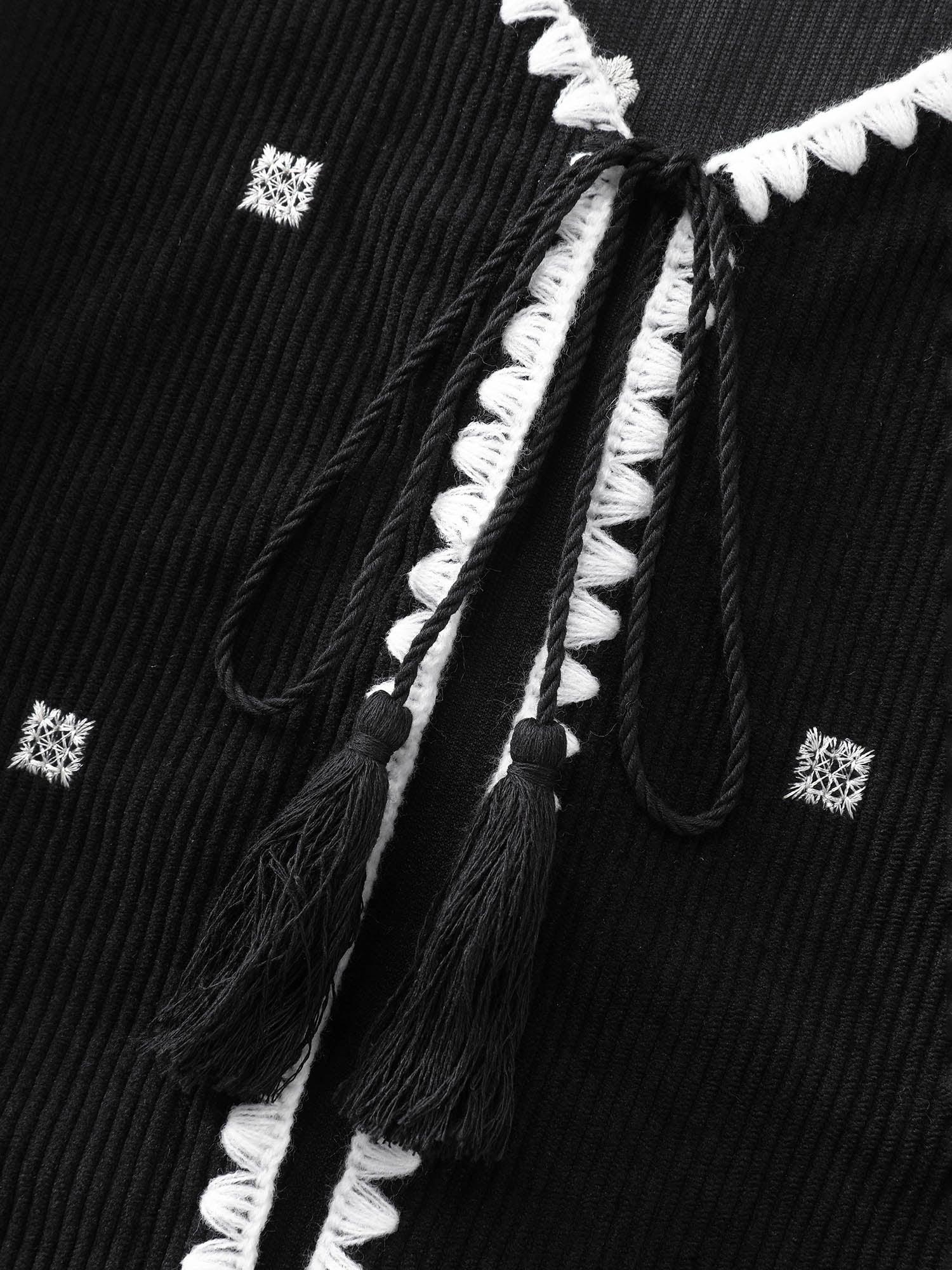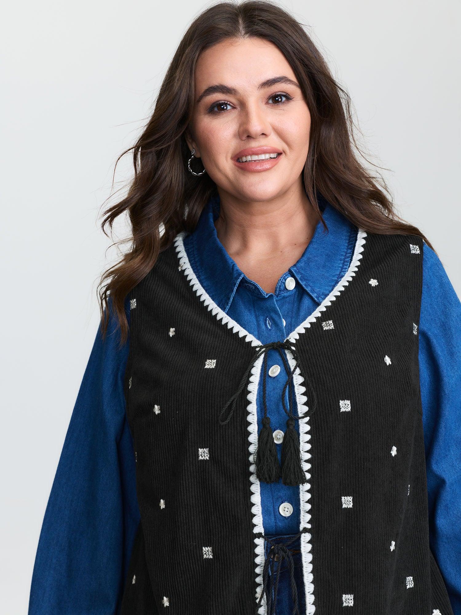 Shop Floral Embroidered Tassel-Front Vest now and redefine your style with confidence at BloomChic. Tailored for mid and plus-size women. This trendy Outerwear Women, sizes 10-30. Color:Black;Style:Playful;Prints:Synthetic texture;Details:Texture, Embroidered, Tassels;Pocket:No-pocket;Belt:No-belt;Closure Type:Non;Lining:No-lining