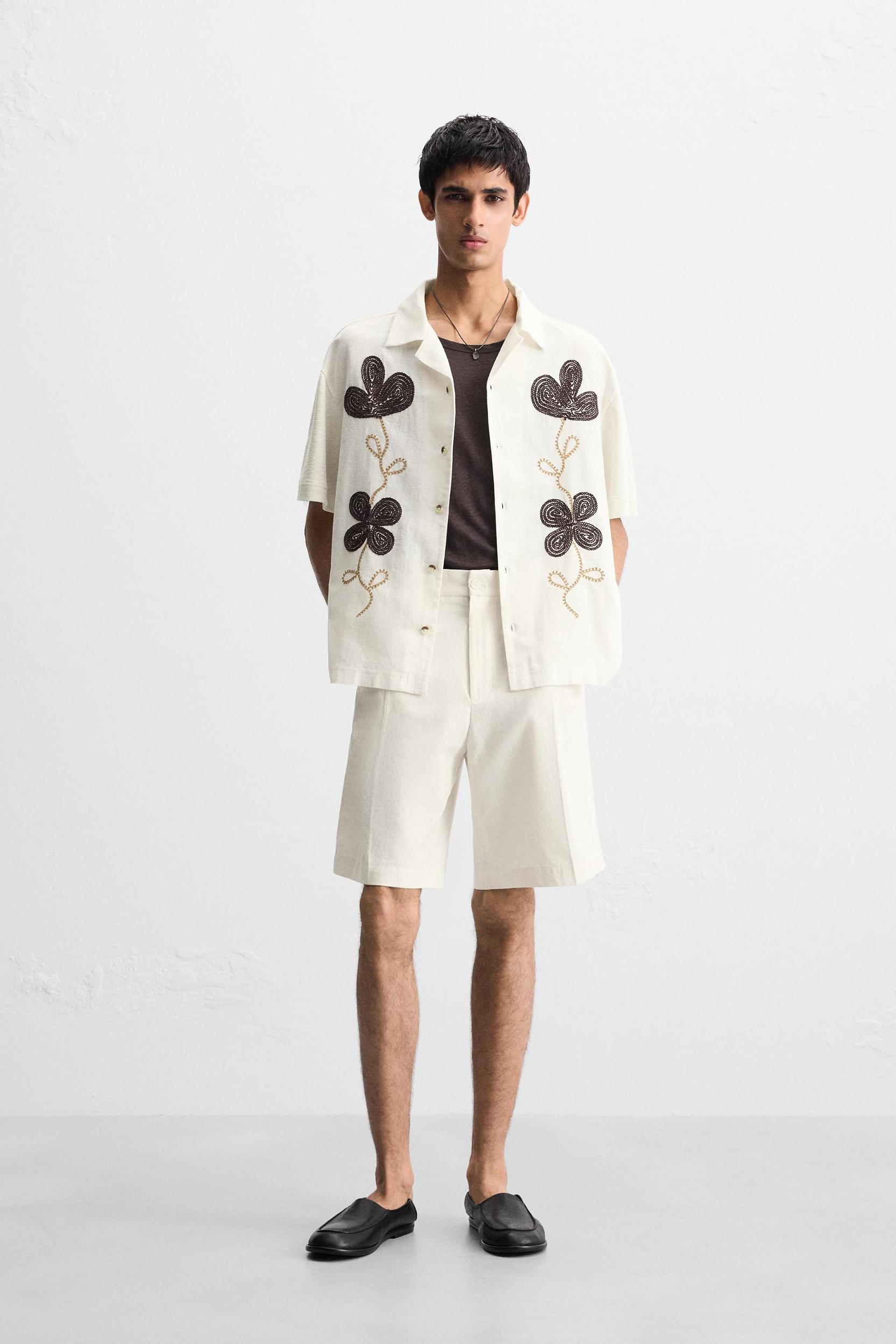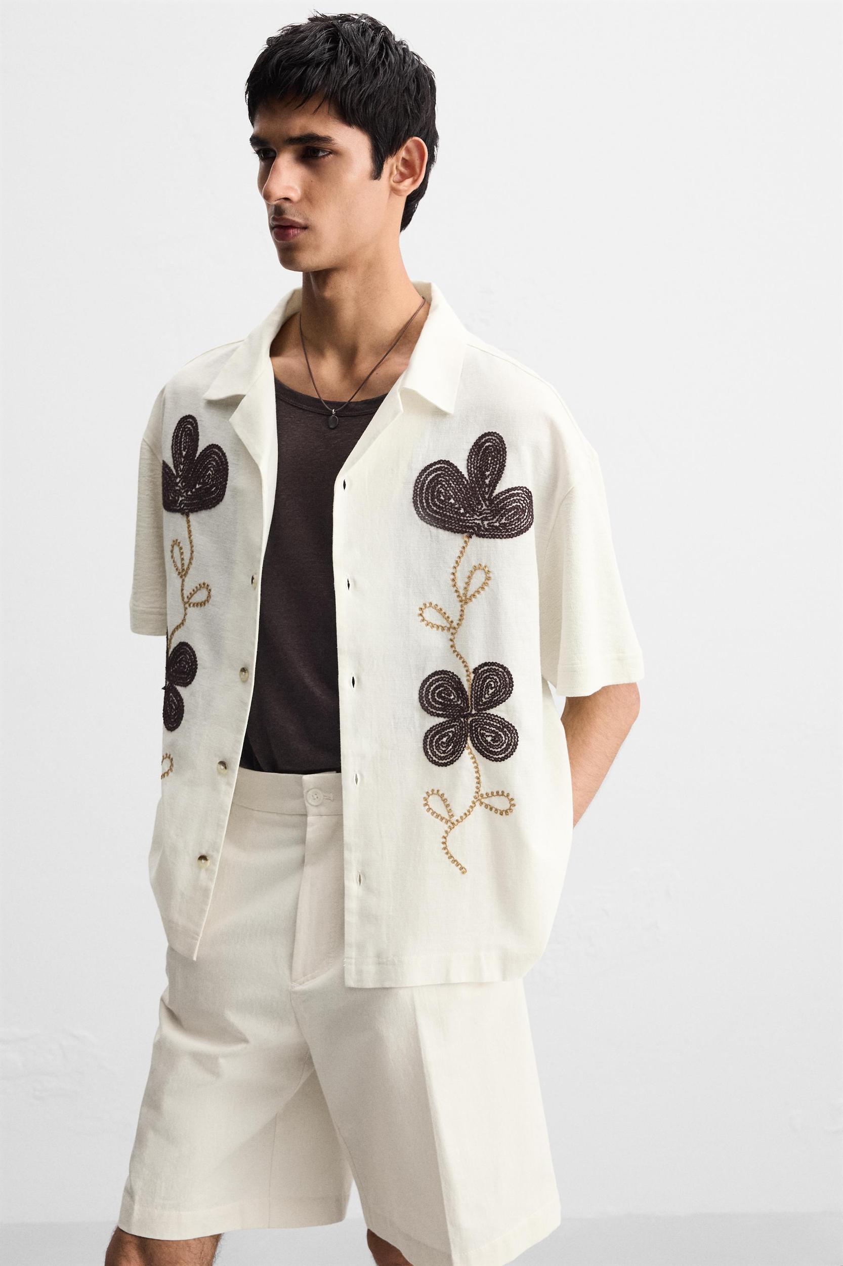 Relaxed fit shirt made of cotton fabric. Spread collar and short sleeves. Contrasting combination of embroidered details at front. Hem with side vents. Front button closure.