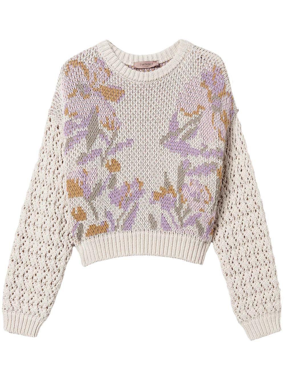TWINSET floral-jacquard sweater | White | white | ribbed cuffs and hem | crew neck | long sleeves | Organic Cotton | Knitted Sweaters | Knits | Clothing | Women