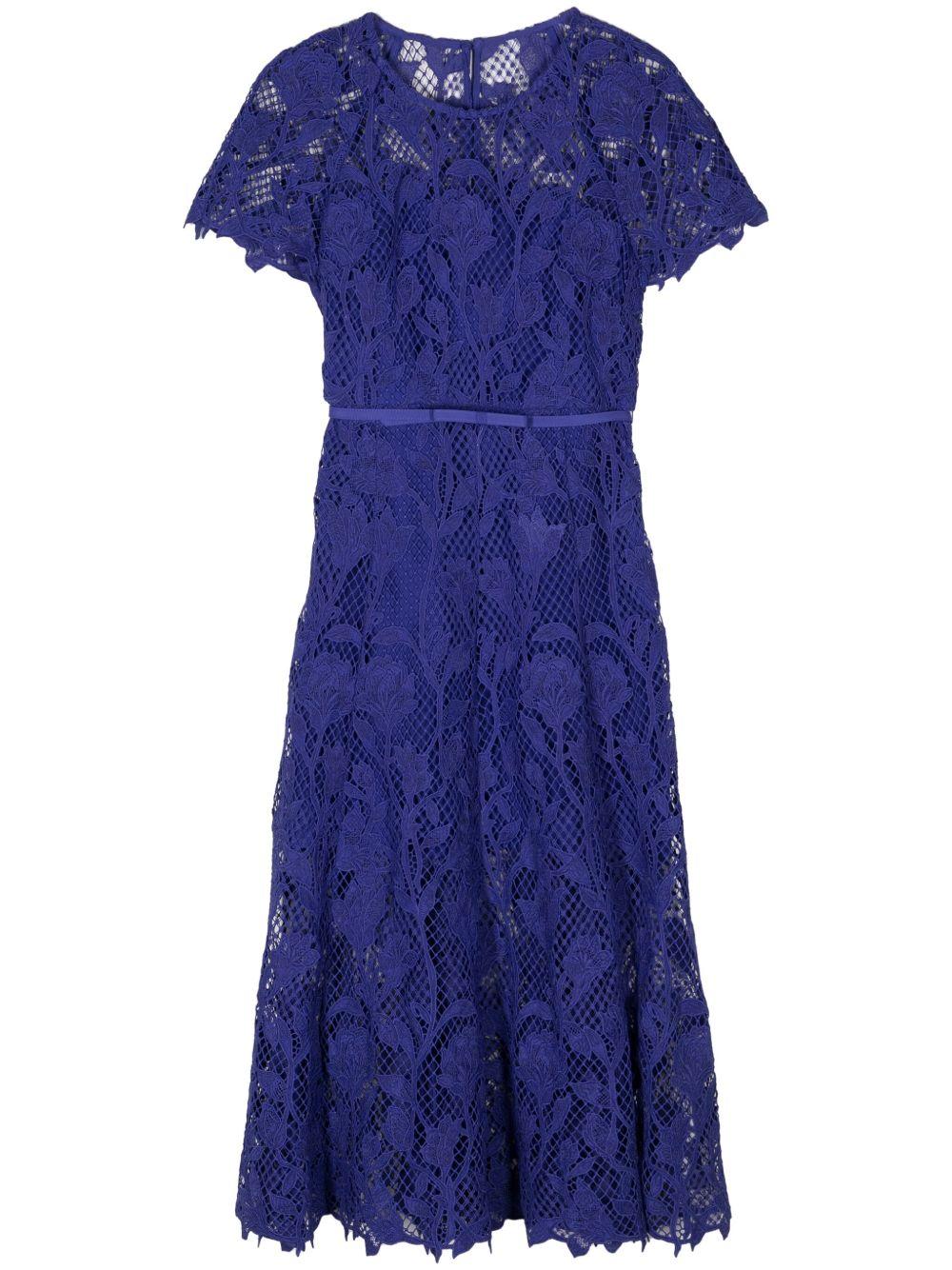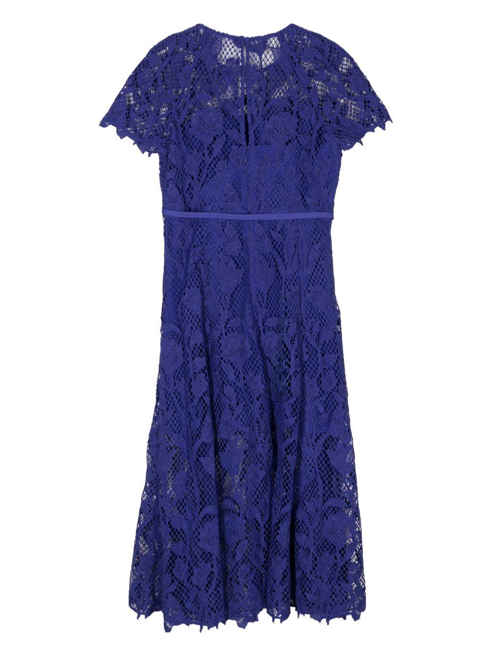 Self-Portrait floral-lace midi dress | Blue | royal blue | floral-lace design | openwork areas | single rear button fastening | concealed rear hook and zip fastening | crew neck | short raglan sleeves | partial lining | scallop hem | mid-calf length | Polyester/Polyester | Cocktail & Party Dresses | Dresses | Clothing | Women