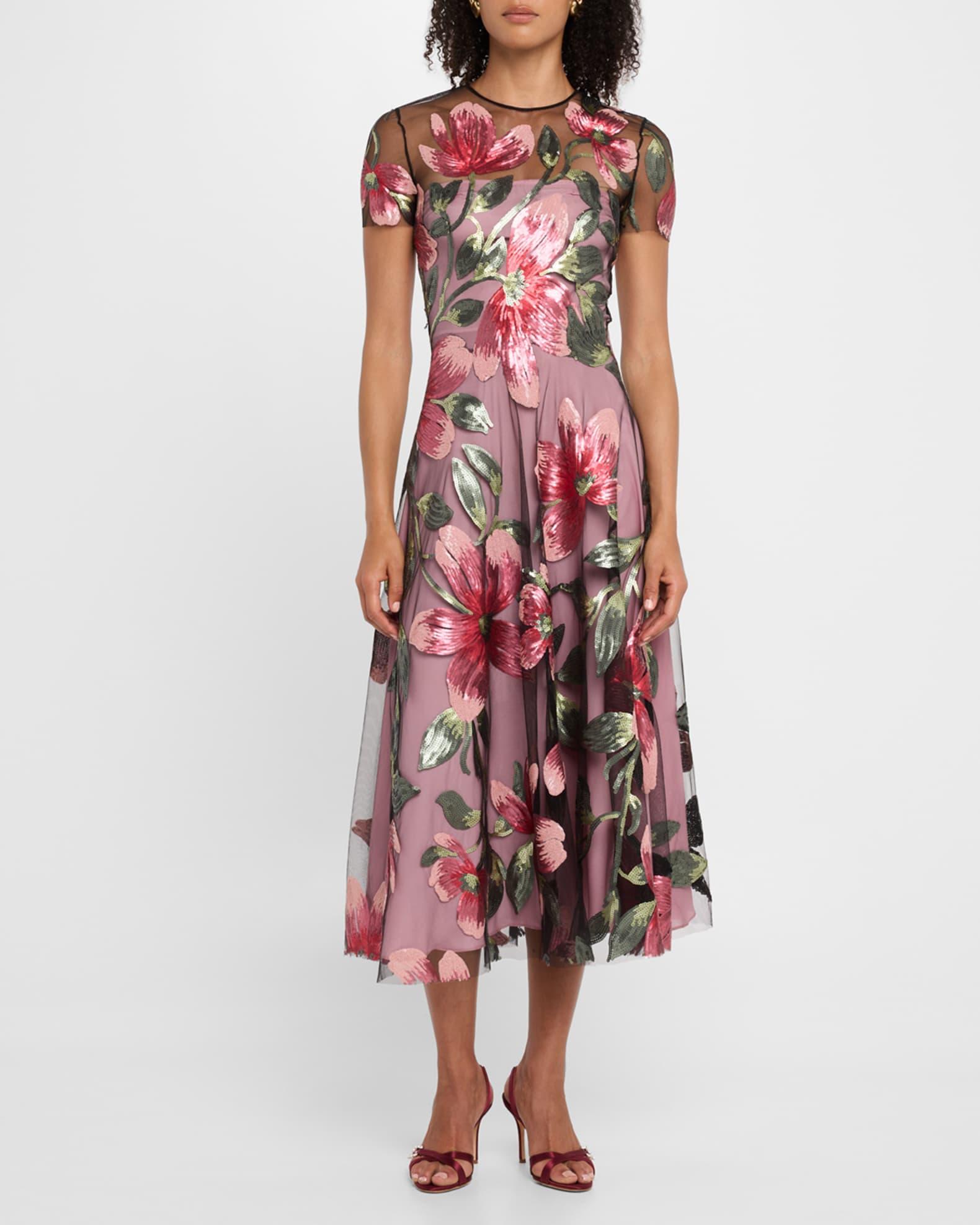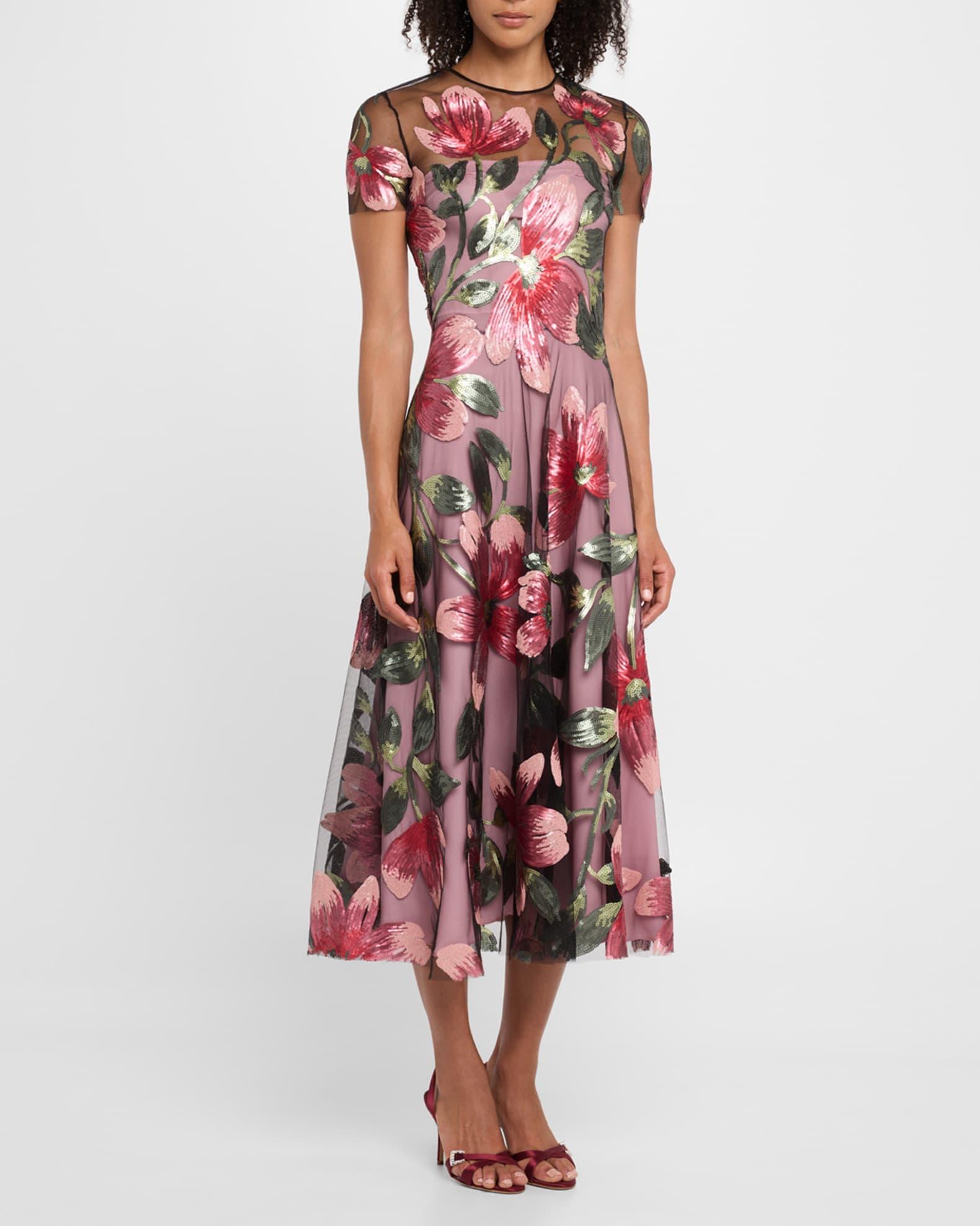 Floral Matte Sequined Tulle Cap-Sleeve Cocktail Dress